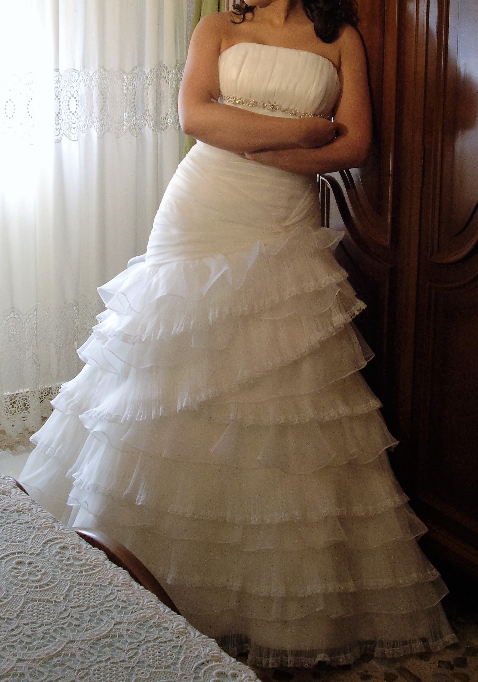 Línea en A con escote palabra de honor y pedrería bajo el pecho intacta, drapeado hasta la cintura y falda de volantes y cola.