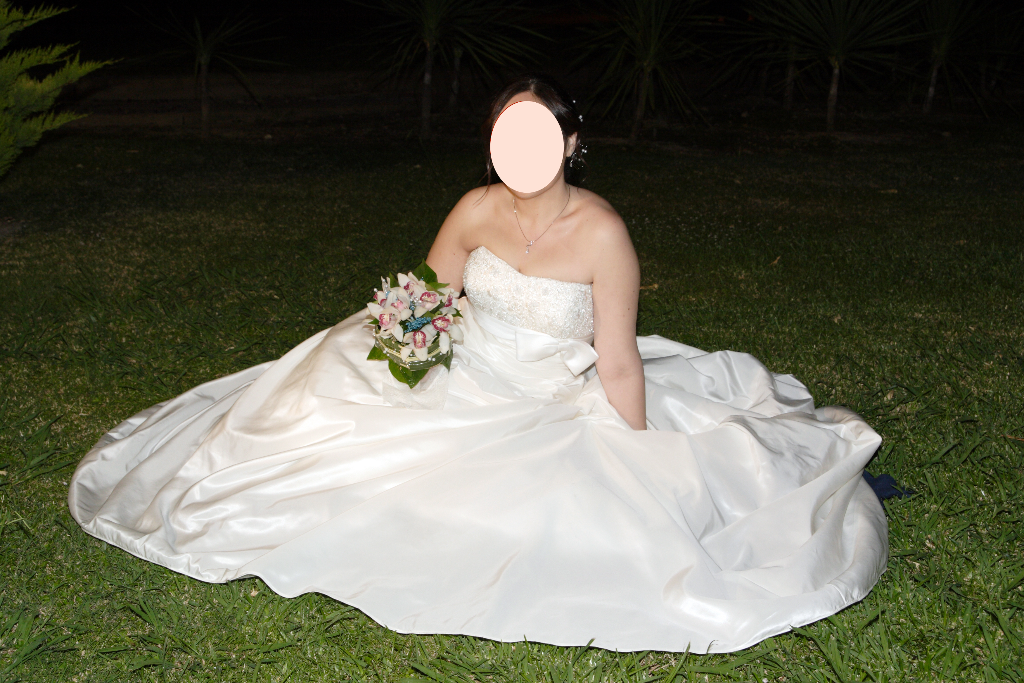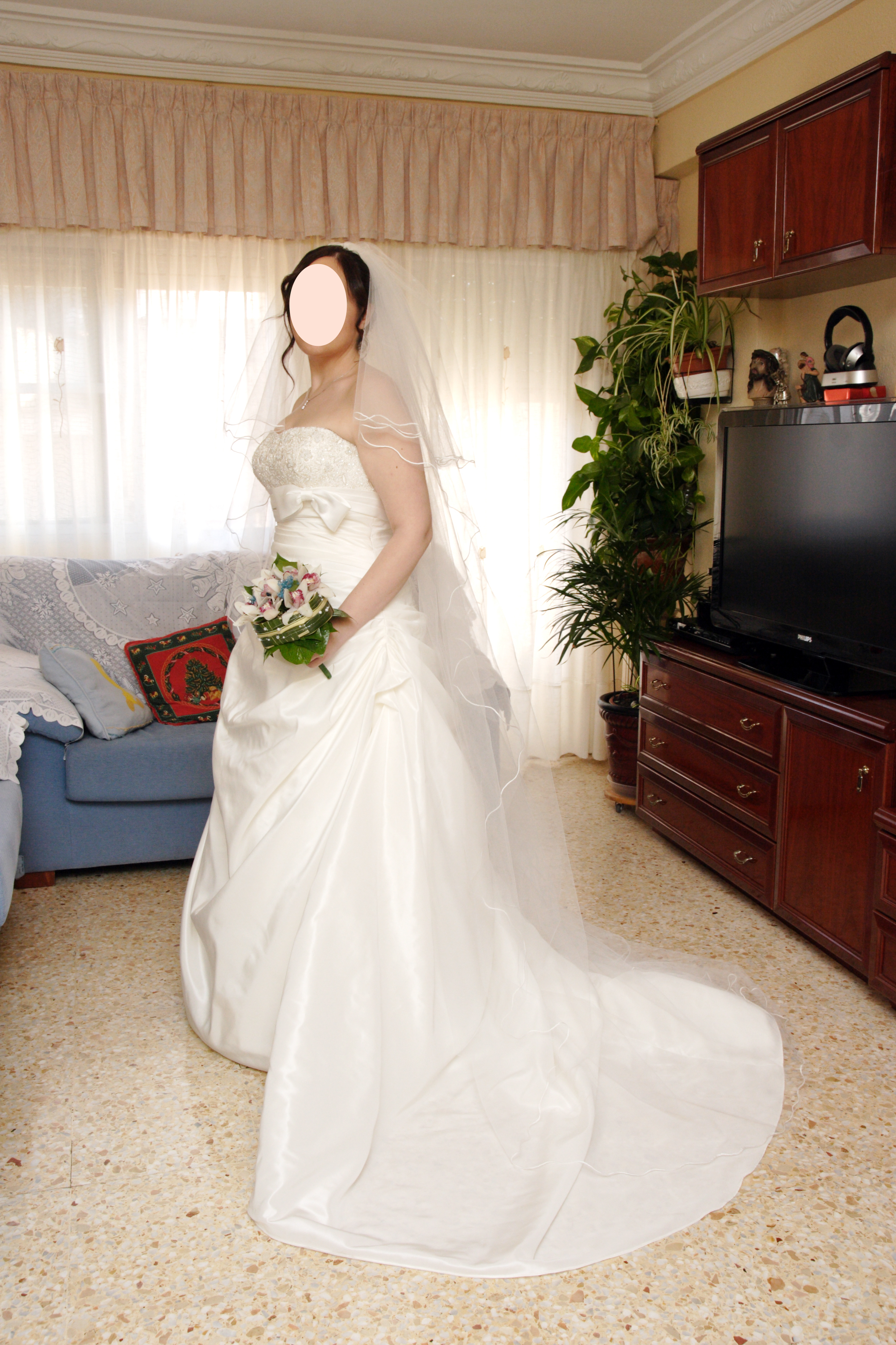Precioso vestido de novia.. usado solo ese dia pero muy bien tratado.. esta lavado de tintoreria en su caja perfecto.. el color es blanco roto.. es comodisimo de llevar.. y queda de princesa total.. lleva una cinta en la cola para ponertela en la muñeca si quieres bailar.. el tretoque que tiene hecho es en la zona del escote.. para que quedase mejor y mas sujeto..