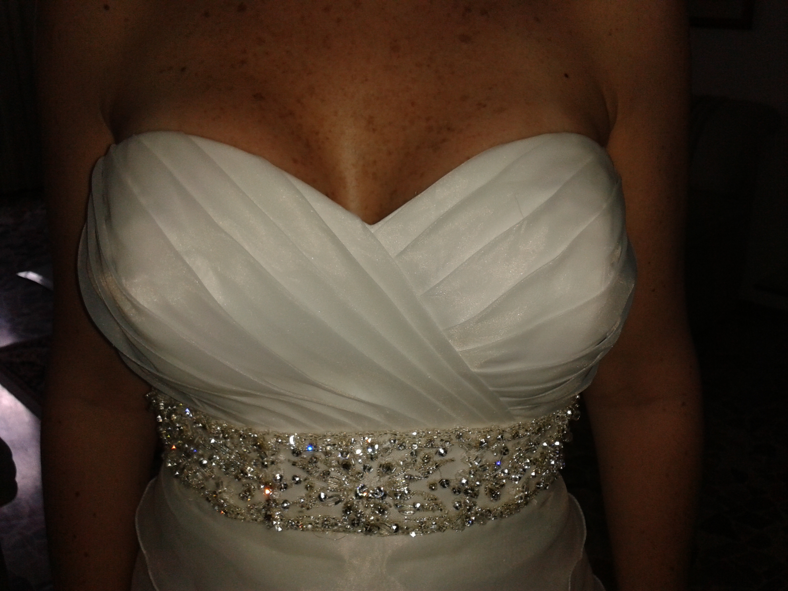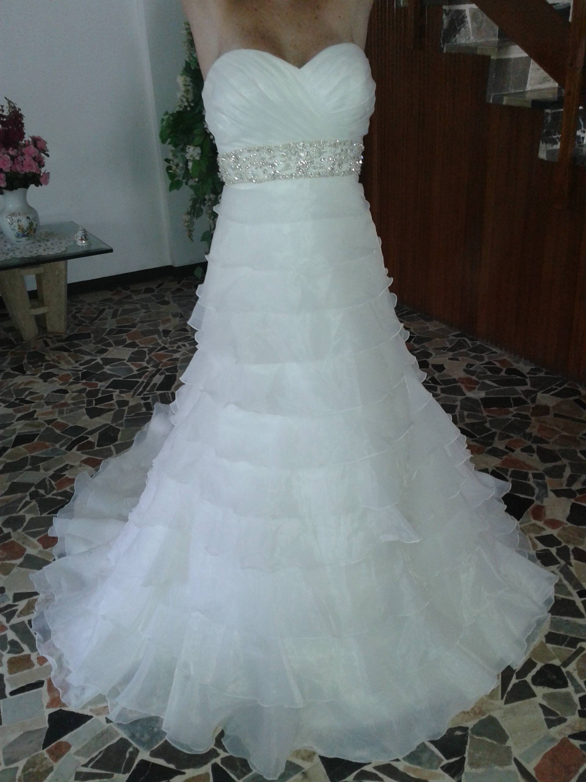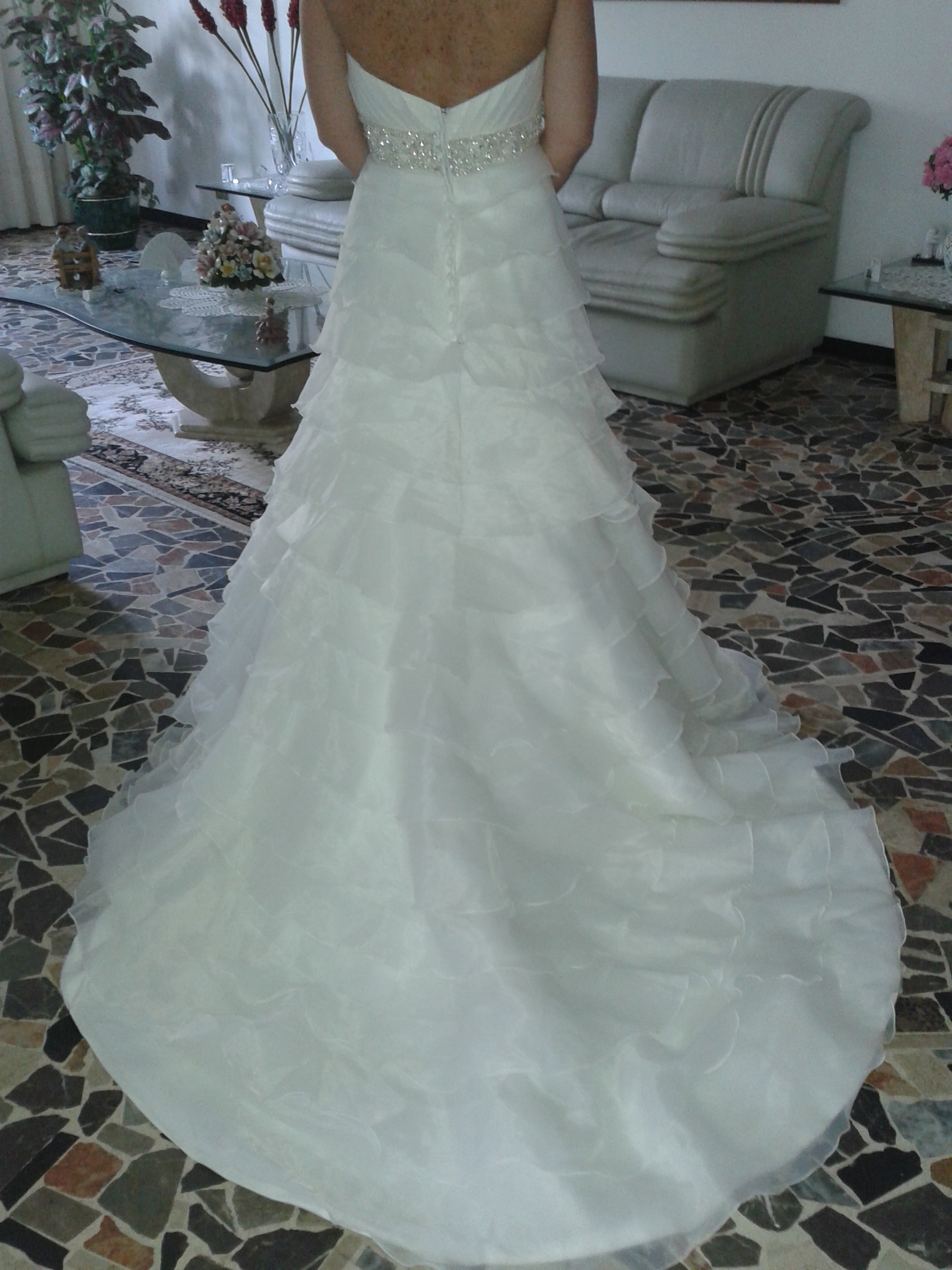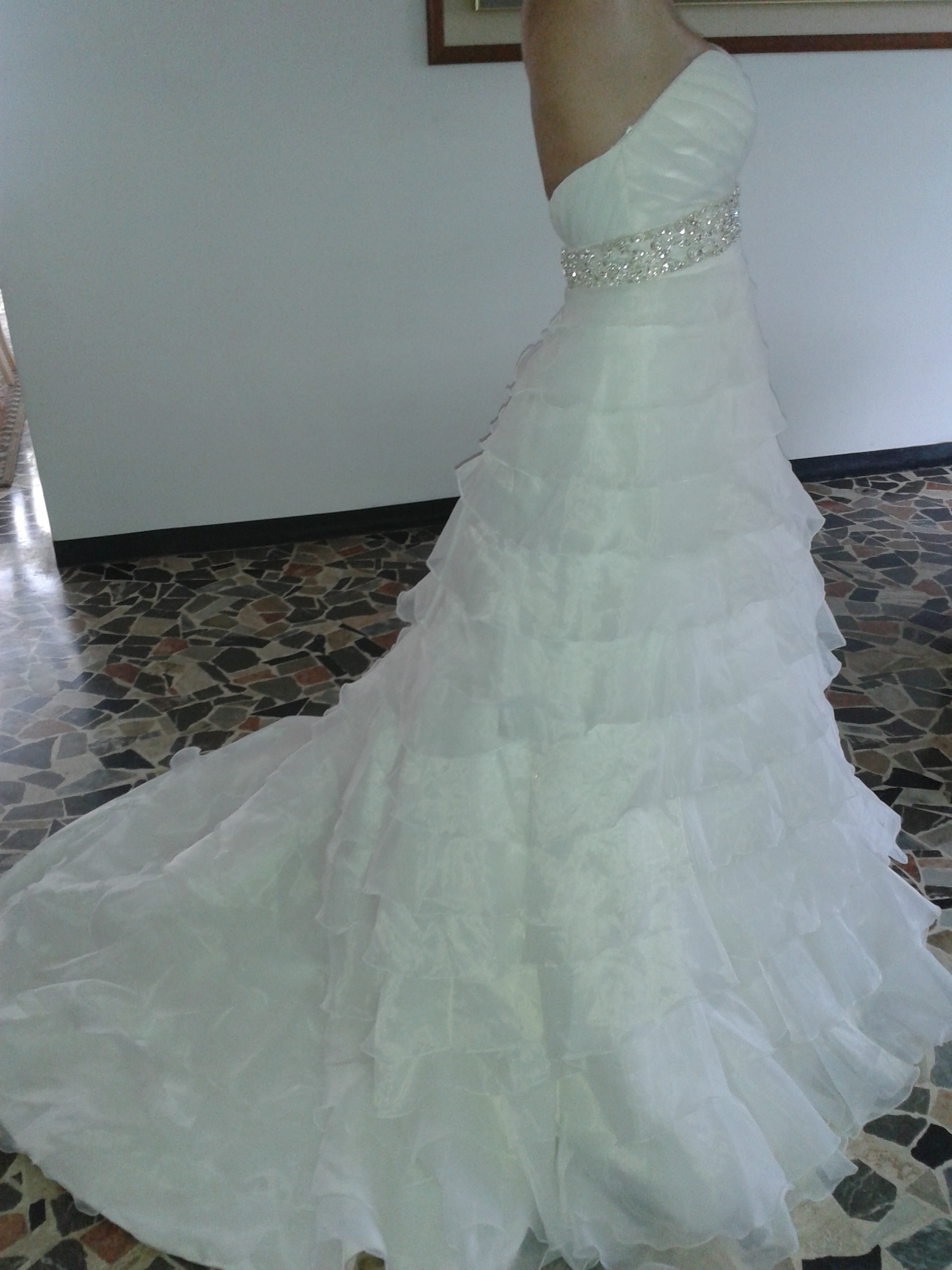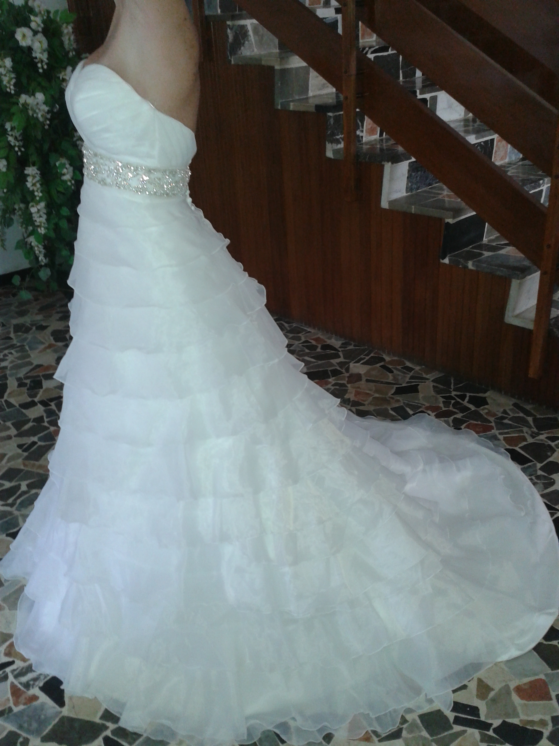 Precioso vestido de novia importado de Estados Unidos. En perfecto estado. Una sola pieza, escote en forma de corazön todo drapeado y con cristales ubicados debajo del busto, falda en capas con semicola. Las medidas de busto son 90 cm, cintura 73 cm y altura 1,85 cm. Se le puede realizar arreglos. Incluye velo y tiara. Precio negociable!