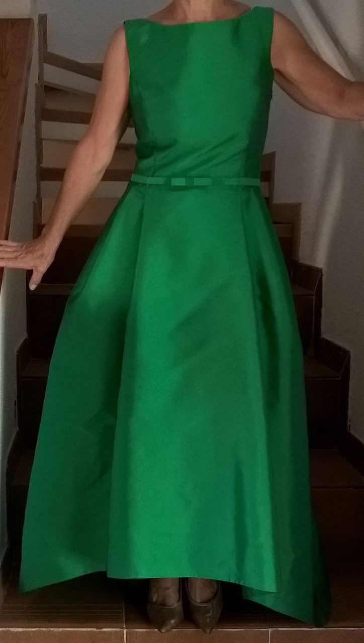 Vestido de Madrina usado solamente una vez en mes septiembre 2016. Forrado, con escote redondo por delante y pico por detrás.Con corte a la cintura y cinturon, con pequeño lazo incorporado. Es mas corto en la parte delantera y largo hasta los pies por detrás. Muy ligero y y cómodo.