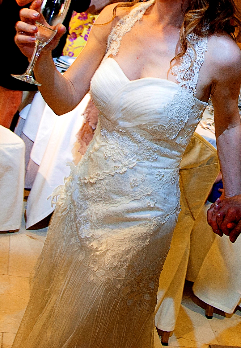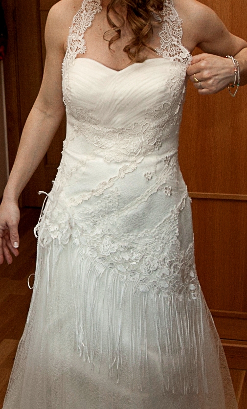Vendo precioso vestido de novia de una sola pieza, estilo vintage que combina flecos de macramés, encajes y tules bordados. Modelo muy original, con detalles de bordado muy cuidados. Estiliza mucho la figura. Perfecto estado, usado sólo una vez, bien cuidado, limpiado en tintorería. Guardado colgado y bien protegido. Buena calidad del tejido.