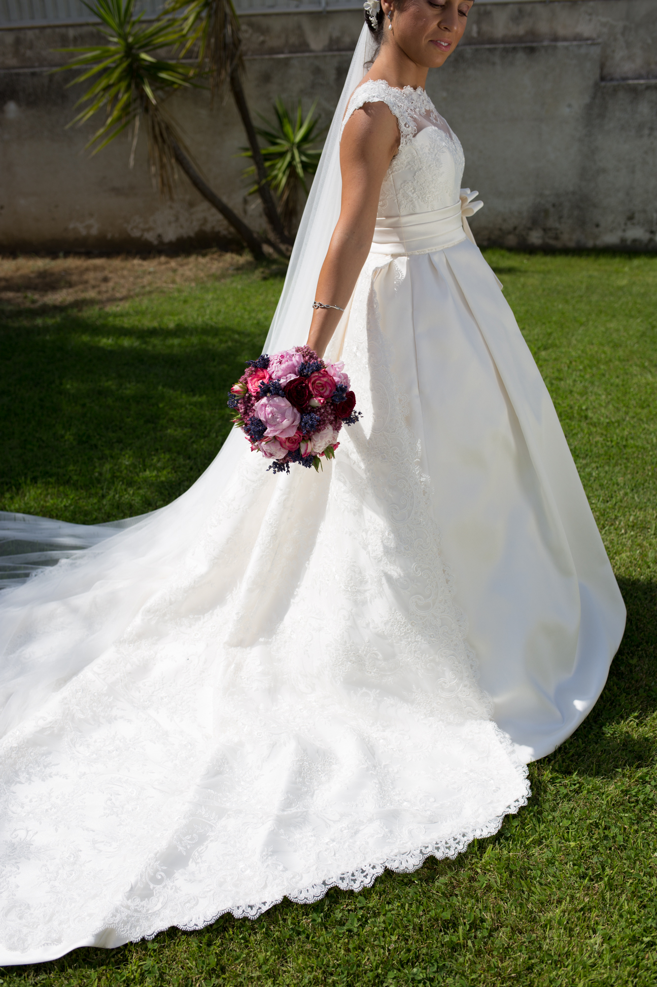 El vestido fue comprado en Madrid, en Eva novias y usado el 3 de septiembre de 2016. Fue llevado a la tintorería donde fue tratado cuidadosamente por separado y está como nuevo.
