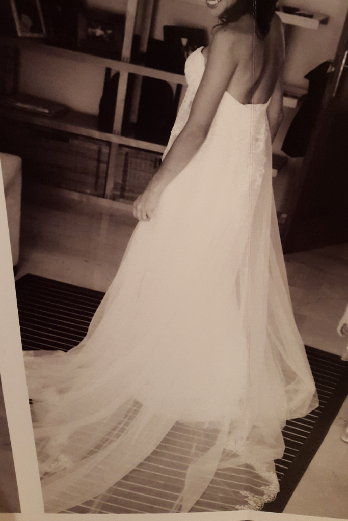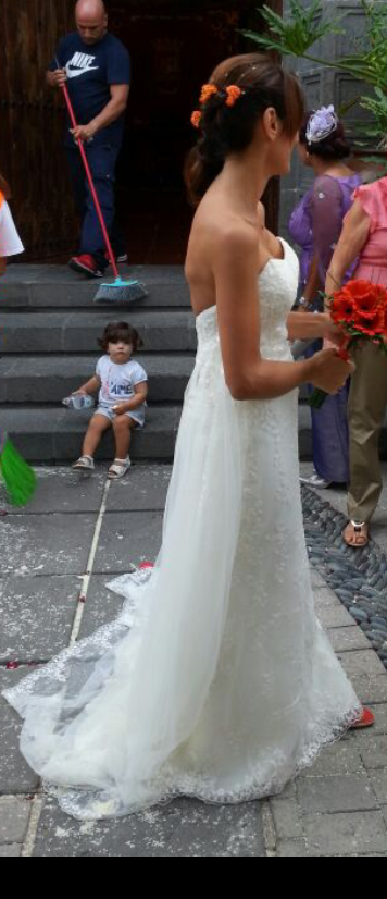 Modelo Ucayal en blanco natural de la Colección de Pronovias del 2012. Lleva una capa de encaje del mismo color del vestido que hace las veces de cola. El vestido es entallado, palabra de honor y hace figura de sirena. Es sencillo y muy elegante.
