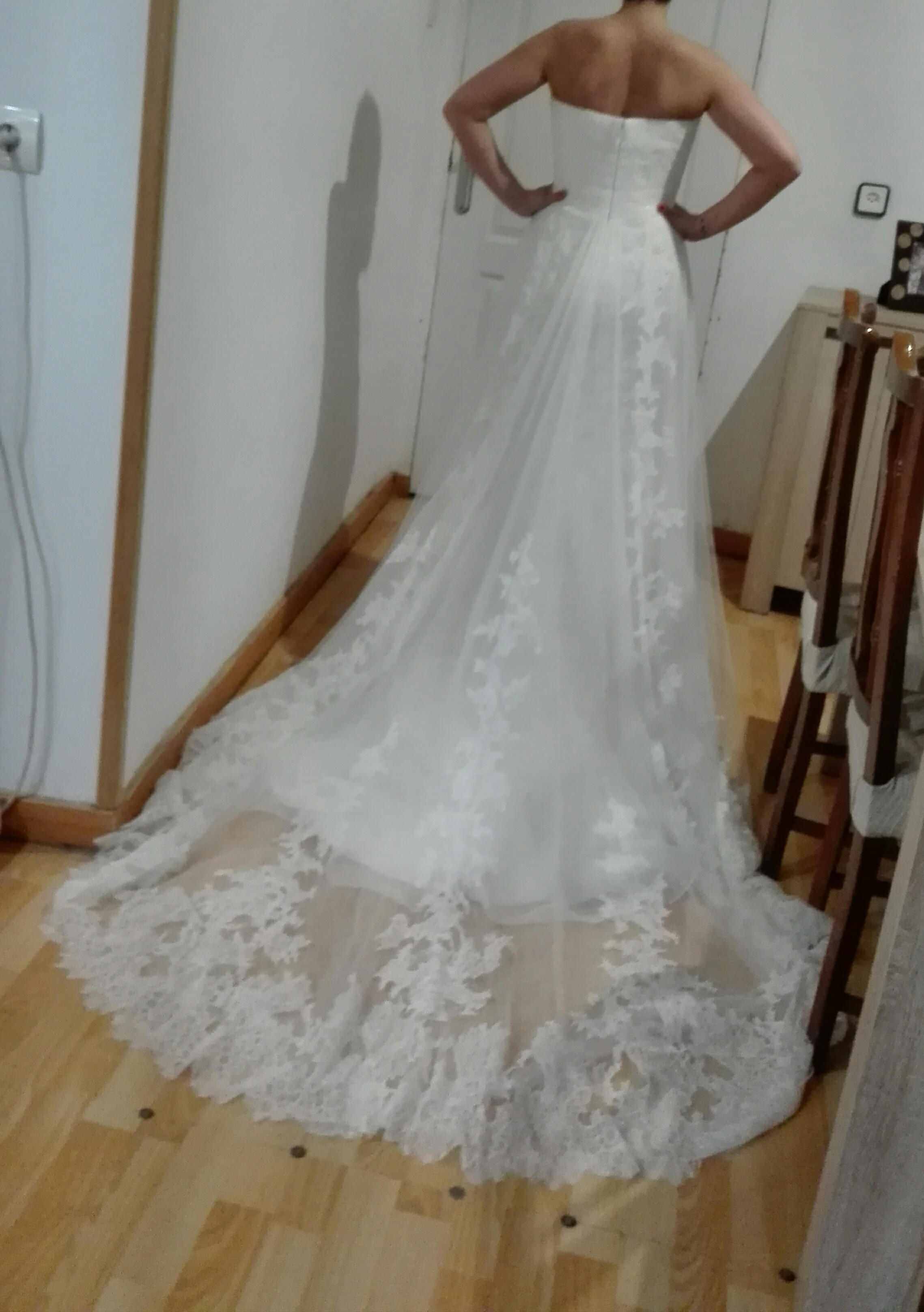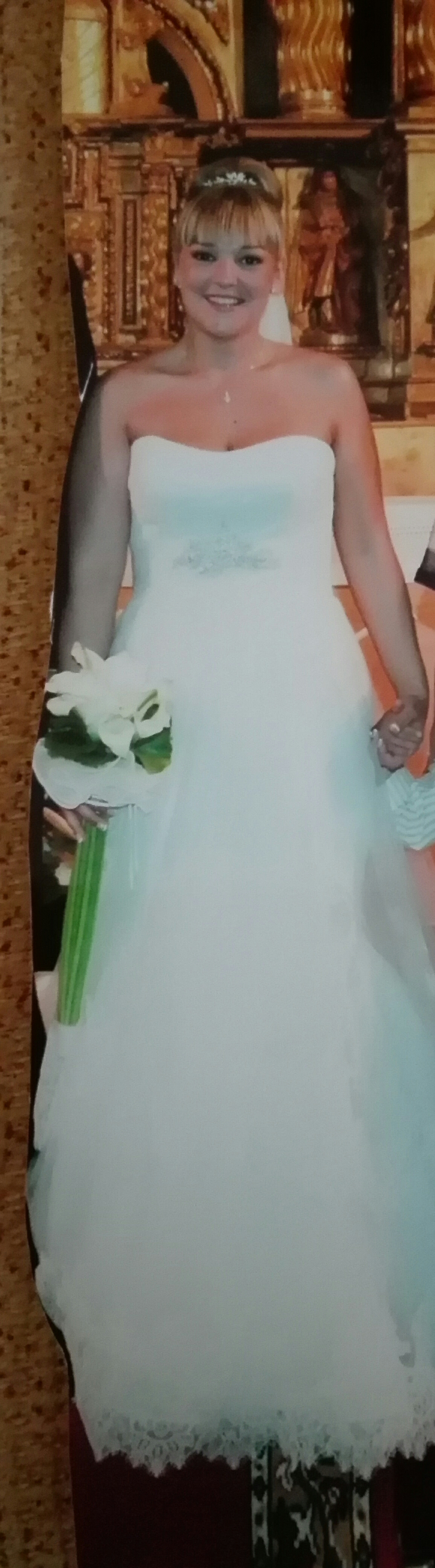 Vestido de novia pronovias,talla 38-40,tiene forma de sirena pero debajo del pecho sale un tul con encaje y cola,vendo cancán y velo a parte por 100€
