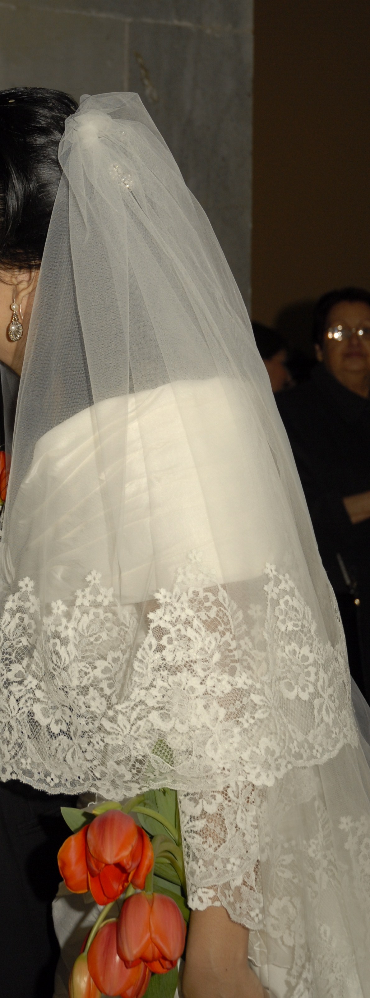 Traje de novia, seda, color blanco roto, con todos los complementos, can can, velo de encaje, zapatos