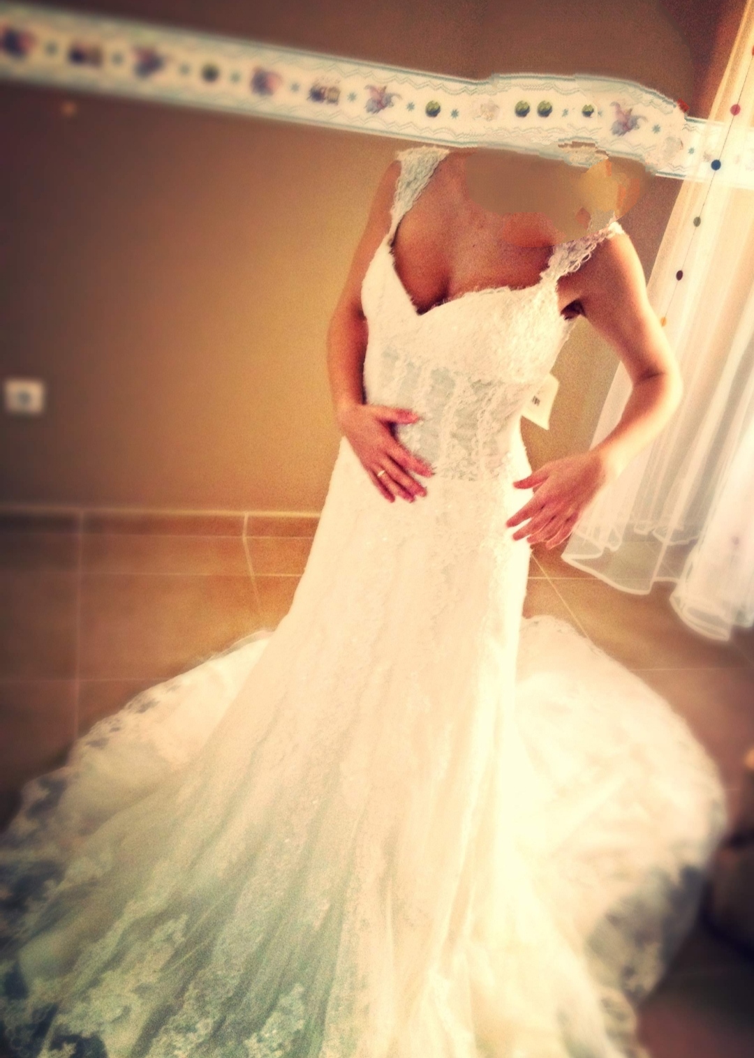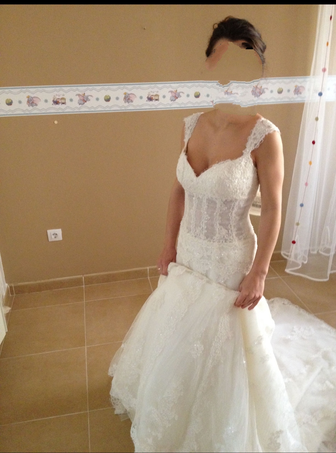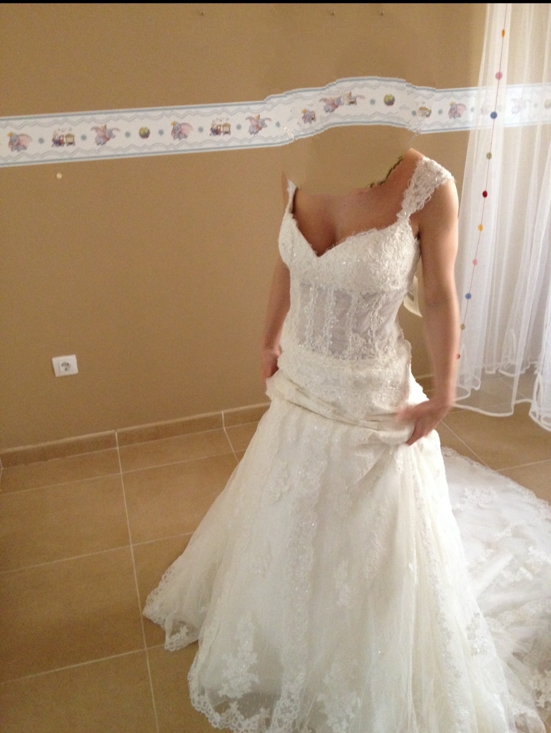 Vestido precioso de pedrería tipo princesa con escote de corazón. Yo tengo talla 36-38 de pantalón, S ó M de camiseta y 85-90 de sujetador y me queda perfecto. Para más información ver Pronovias 2012 modelo Patty. No tiene hecho ningún arreglo, está tal y como salió de fábrica. En la foto no está puesto el fajín, con él se ve más blanco el torso.