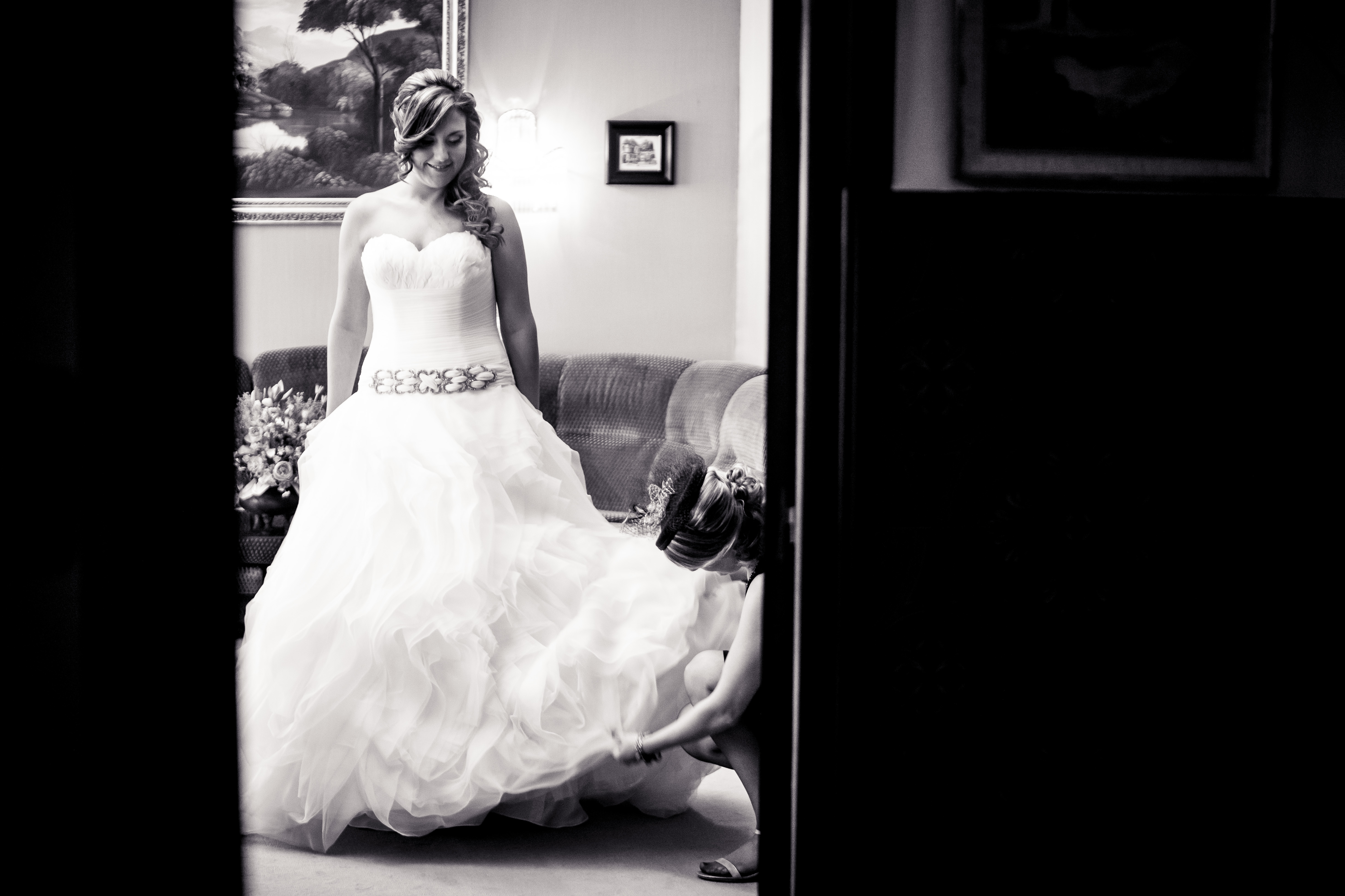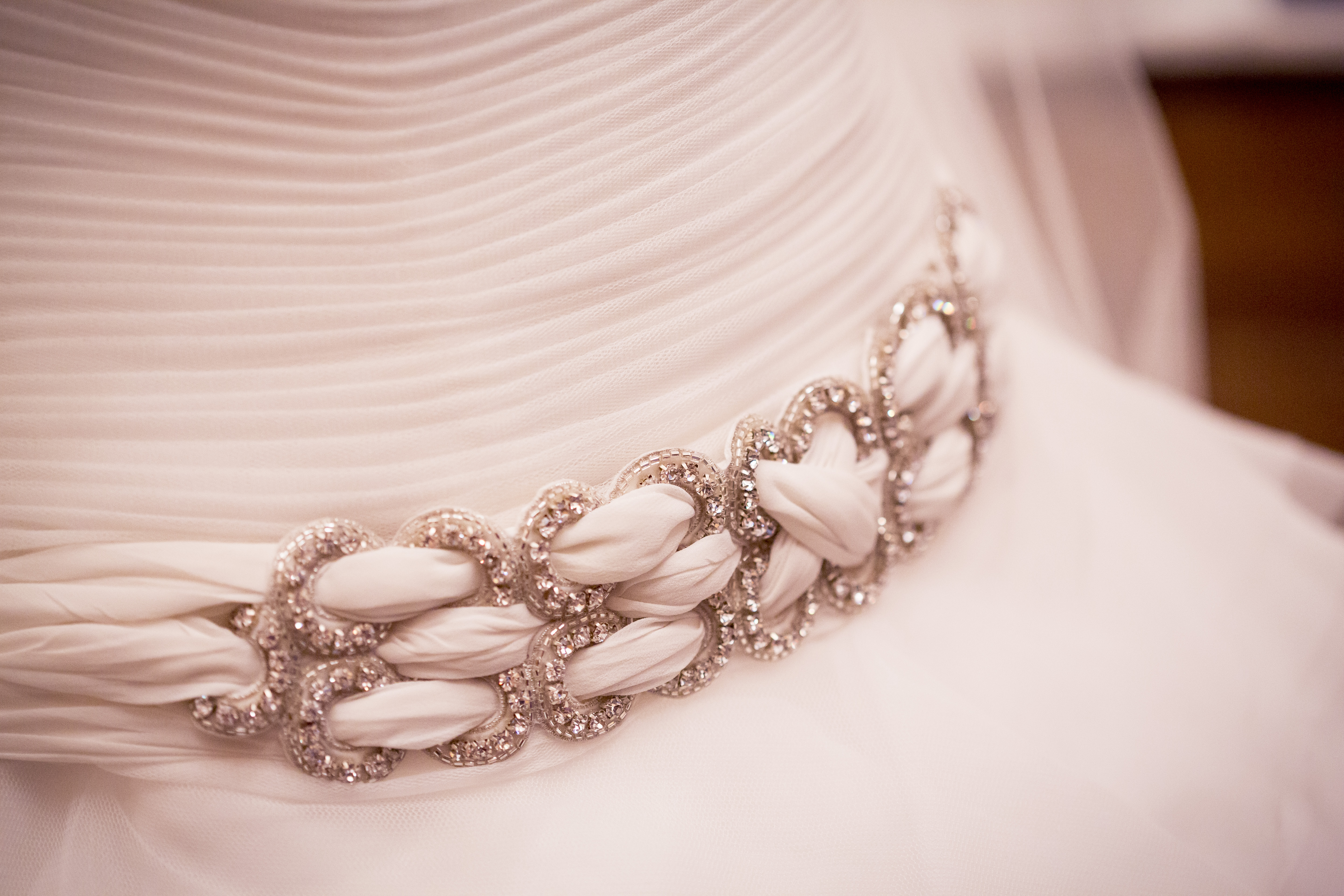 El vestido de novia está confeccionado de Tul con organza y lleva el escote con plumas blancas de oca original en forma de corazón.