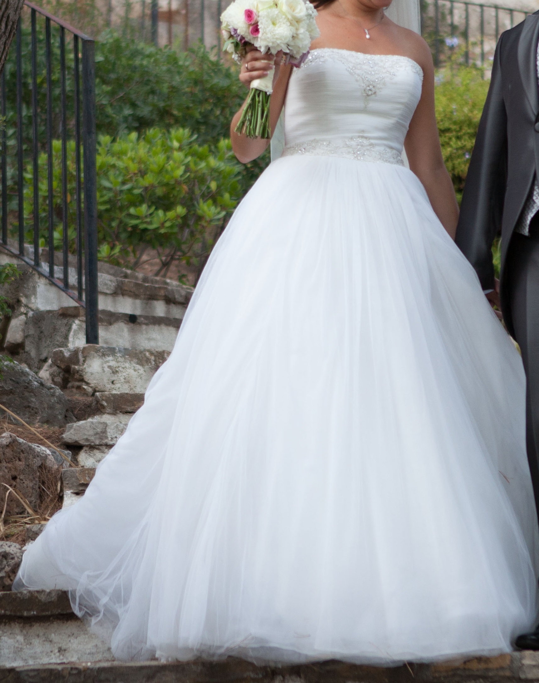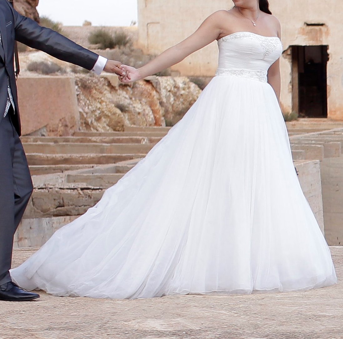 Vendo mi precioso vestido de novia. PRONOVIAS 2014 Modelo Ordizia. Palabra de honor con preciosos detalles, parte falda completamente de tul. Estilo princesa. Incluyo velo de 3m liso, de tul. Talla44/en ropa normal coincide con talla40 (las tallas de vestidos novia son siempre mas grandes) Mido 1. 68m y llevaba tacon 10cm, pero una modista os lo puede arreglar a vuestras medidas si necesario. Esta limpio y perfecto estado. Nuevo me costo 1500EUR. Vendo vestido con velo por 800EUR. Contesto tmb whatsapp.
