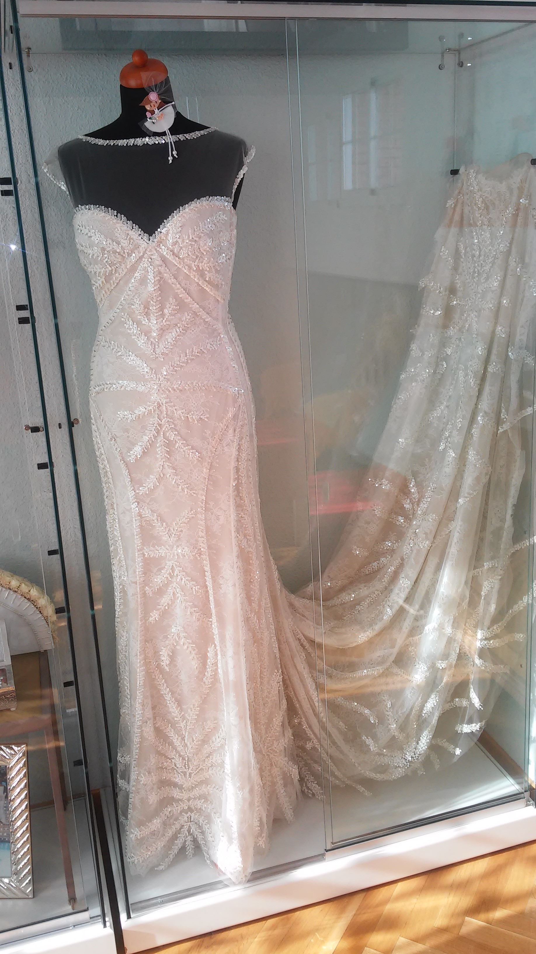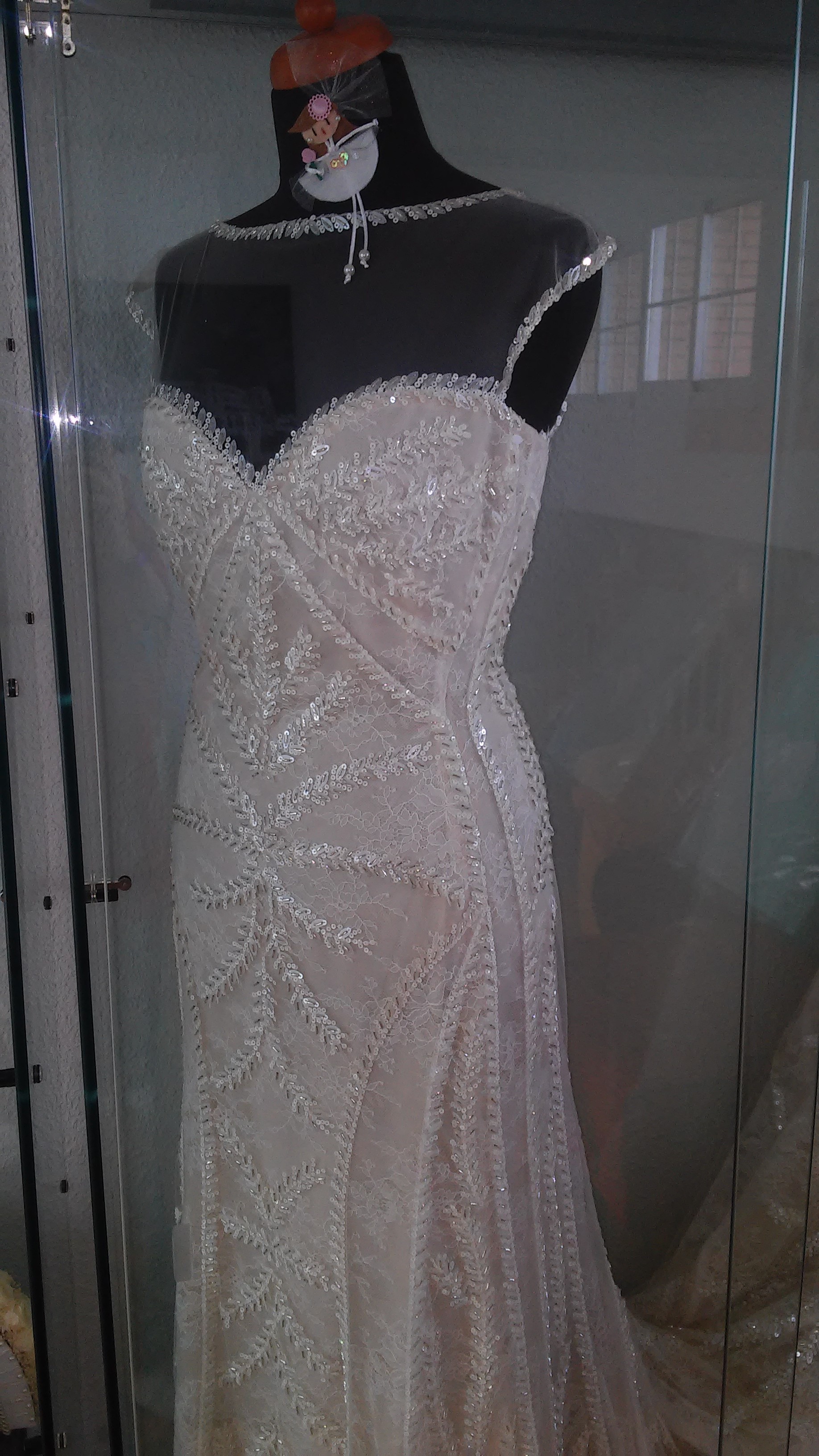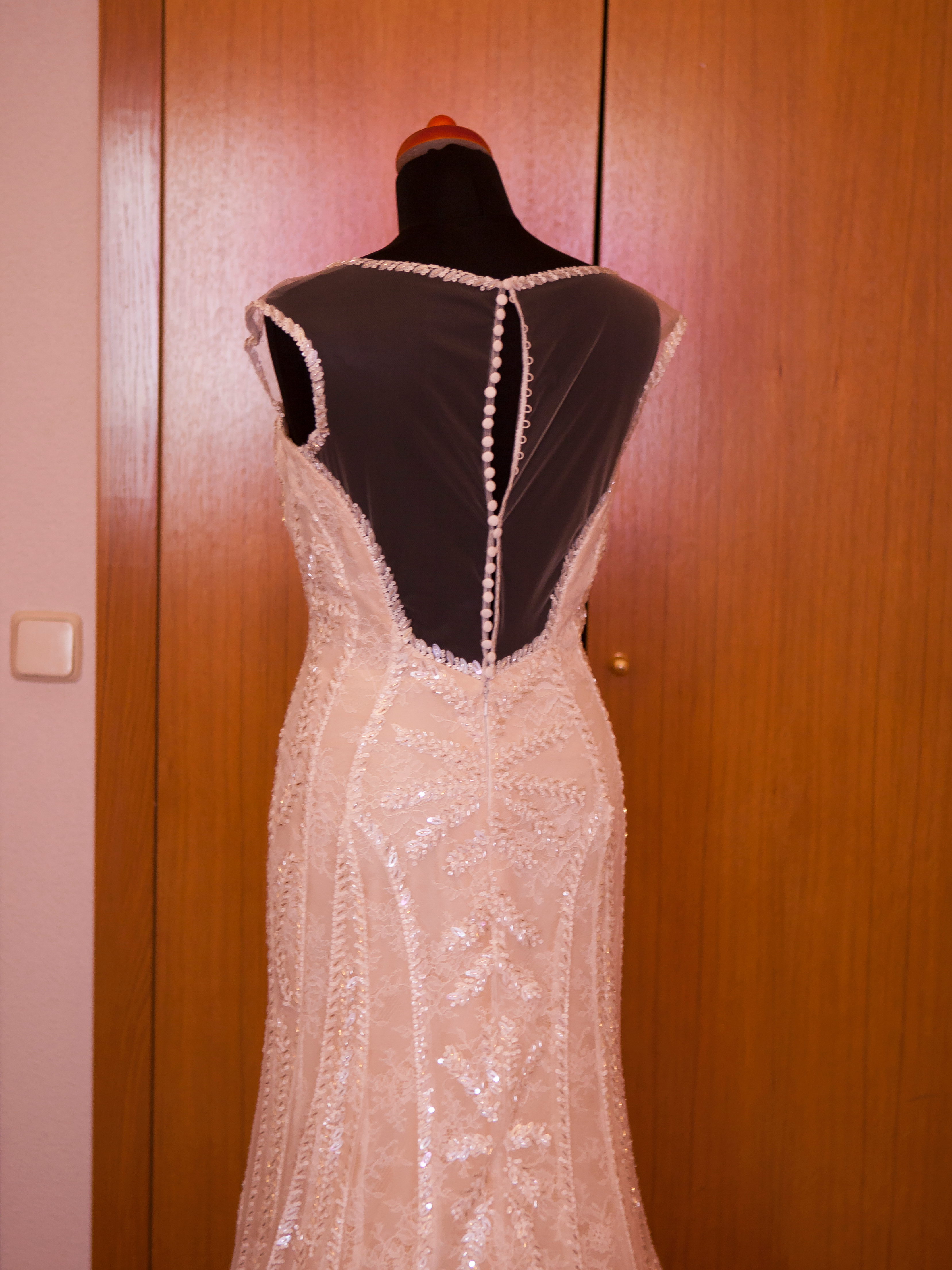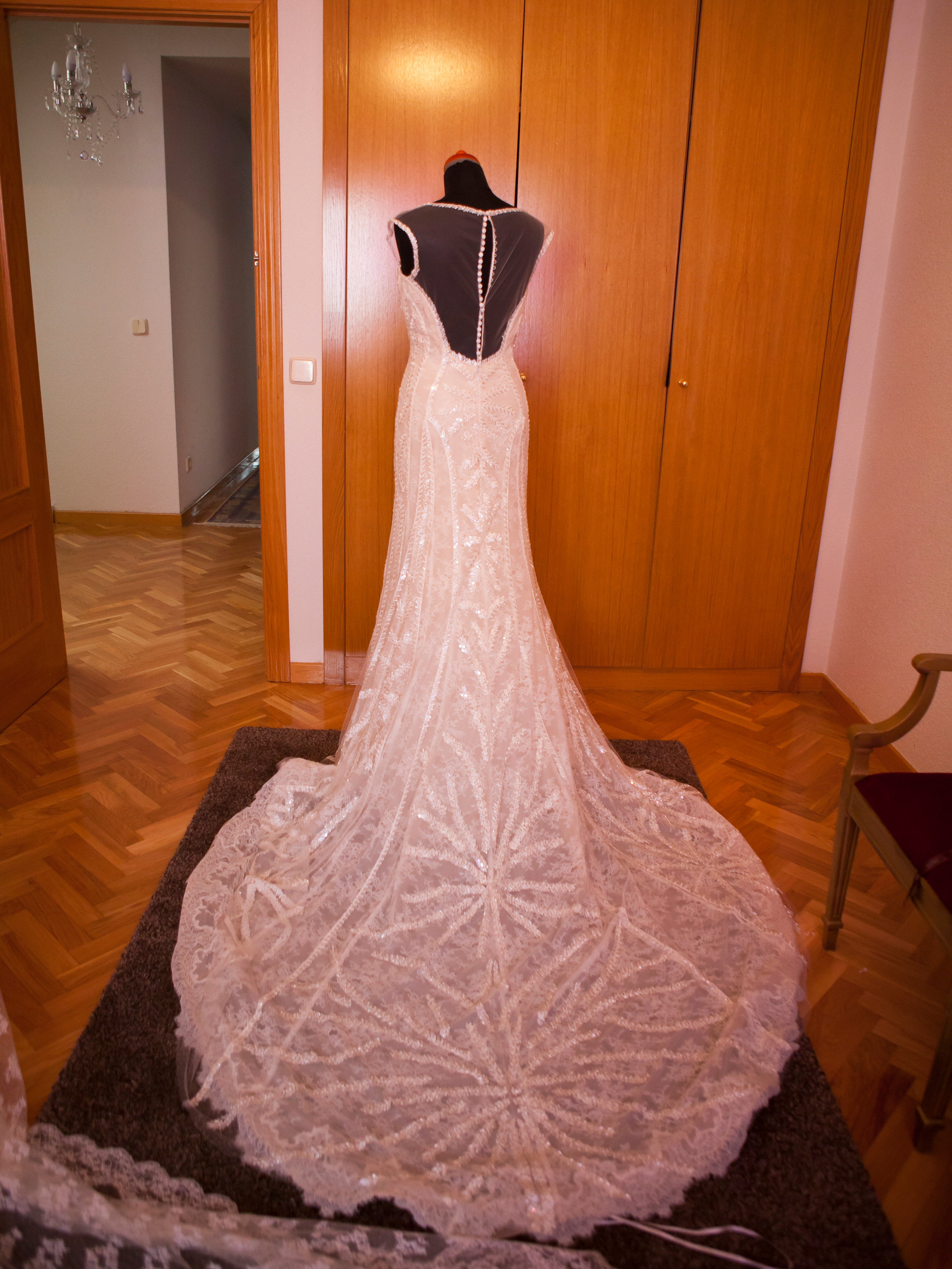 el vestido ha sido únicamente el día de la boda durante la ceremonia puesto que para el baile utilicé otro. Ha estado sobre maniquí y en vitrina con ventilación para su adecuado mantenimiento