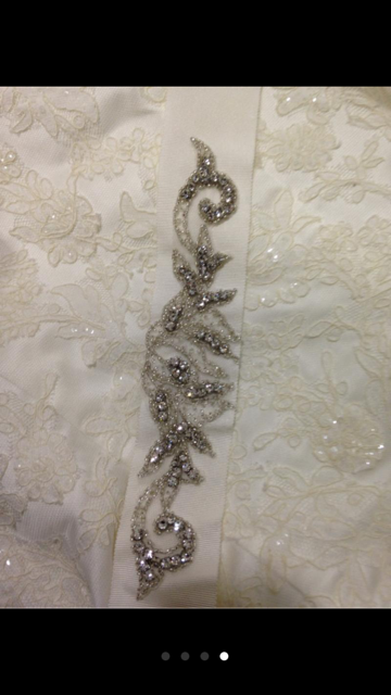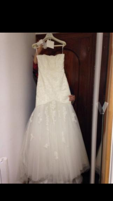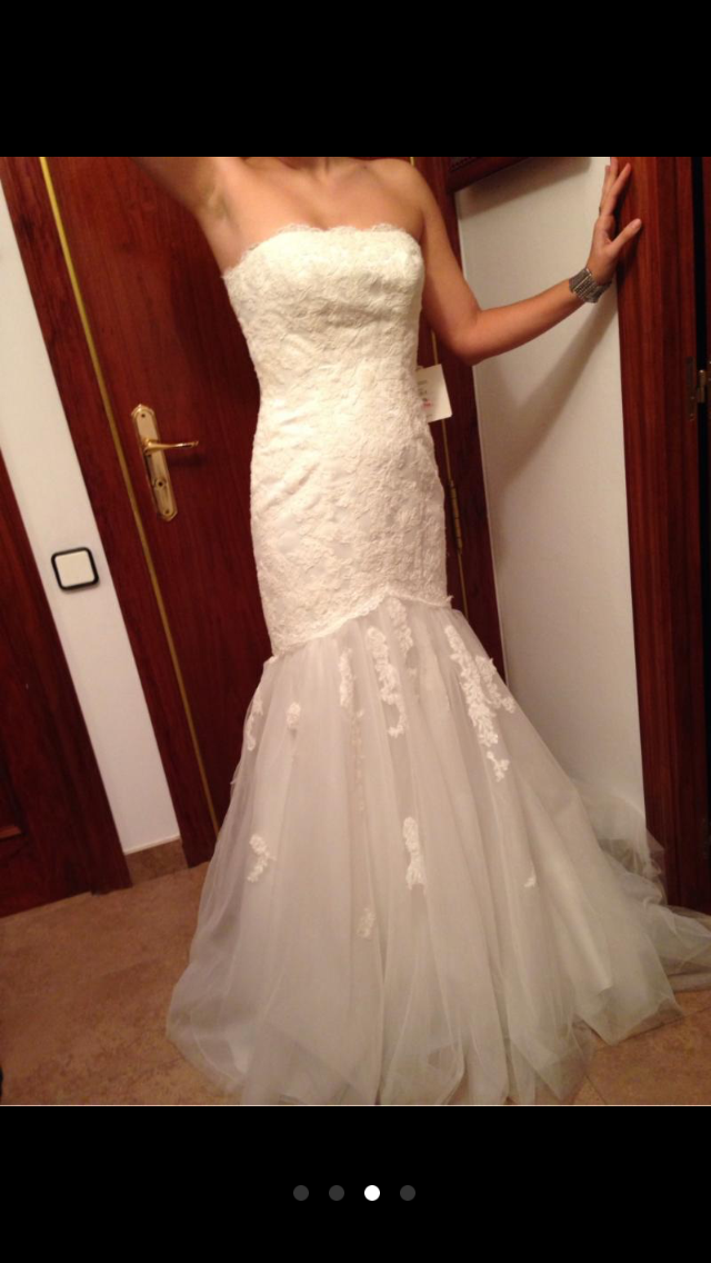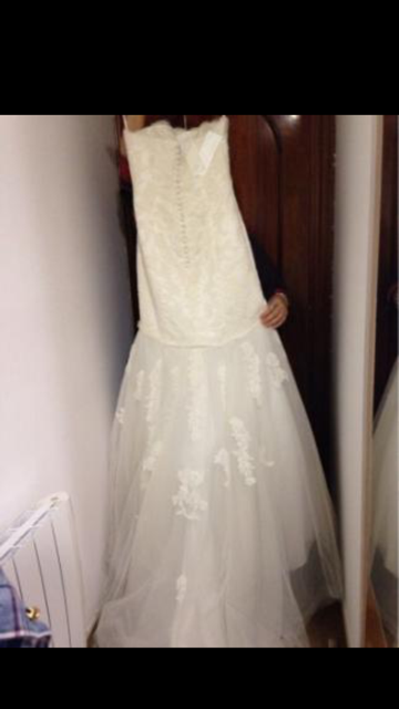 Vestido de novia con corte sirena , escote palabra de honor , decoraciones de encaje , con brillos , con cola . Vestido de Pronovias de la coleccion del año 2015 , vestido nuevo a estrenar . No tiene echo ningun arreglo , talla 40 . Soy de terrassa , vivo en vic entre semana y los fines de semana en terrassa , si alguien esta interesada en verlo en persona es posible .