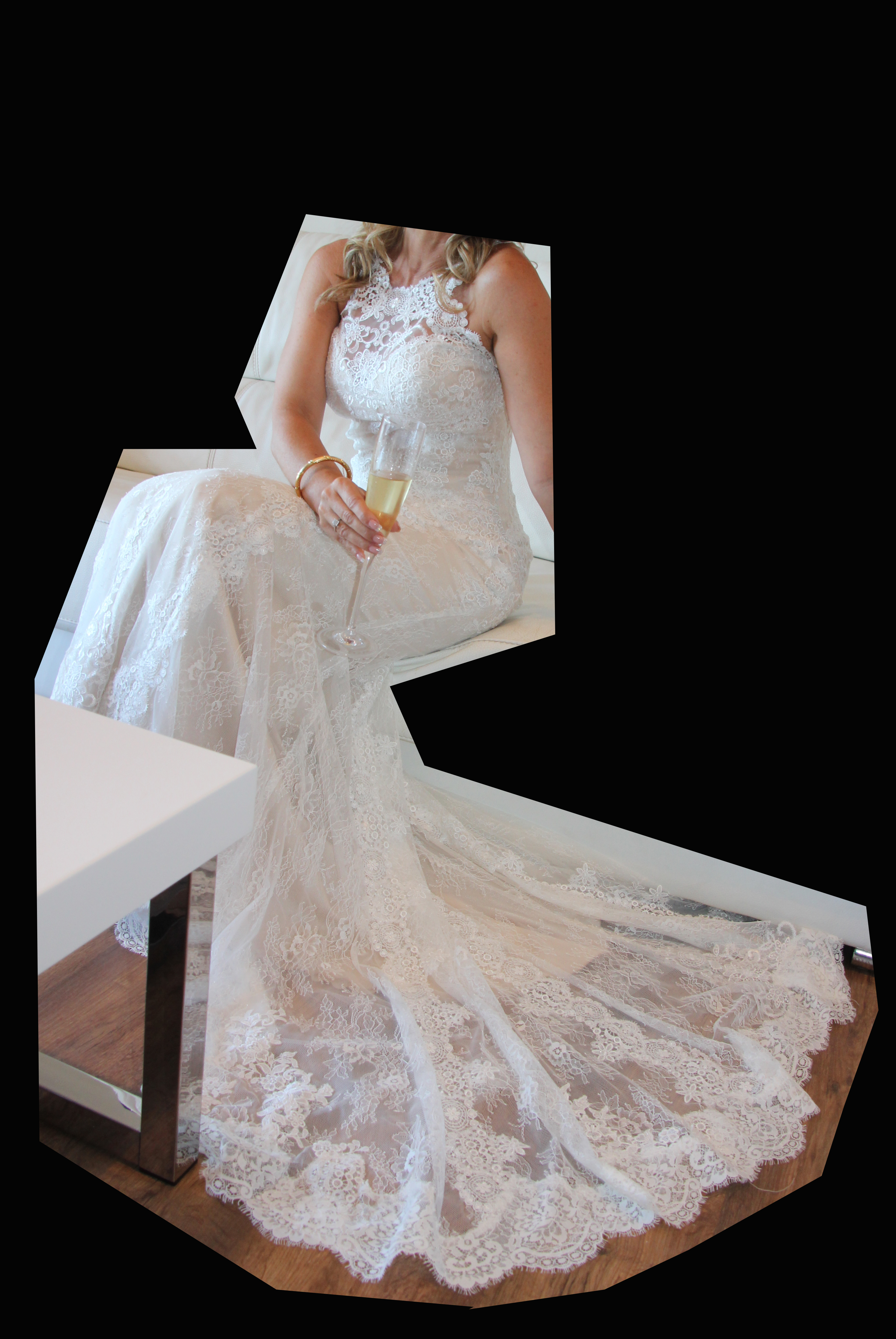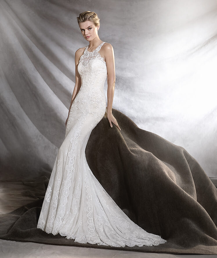 Vestido de novia de Chantillí y guipur, escote halter y favorecedora silueta sirena.
