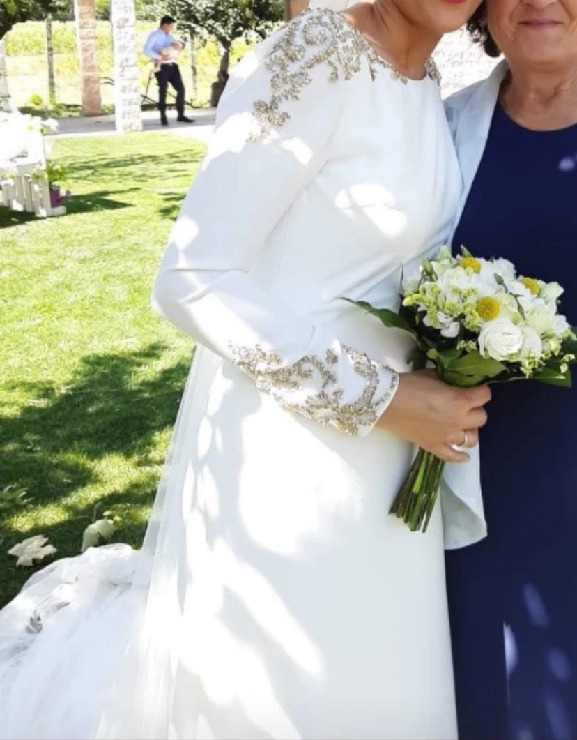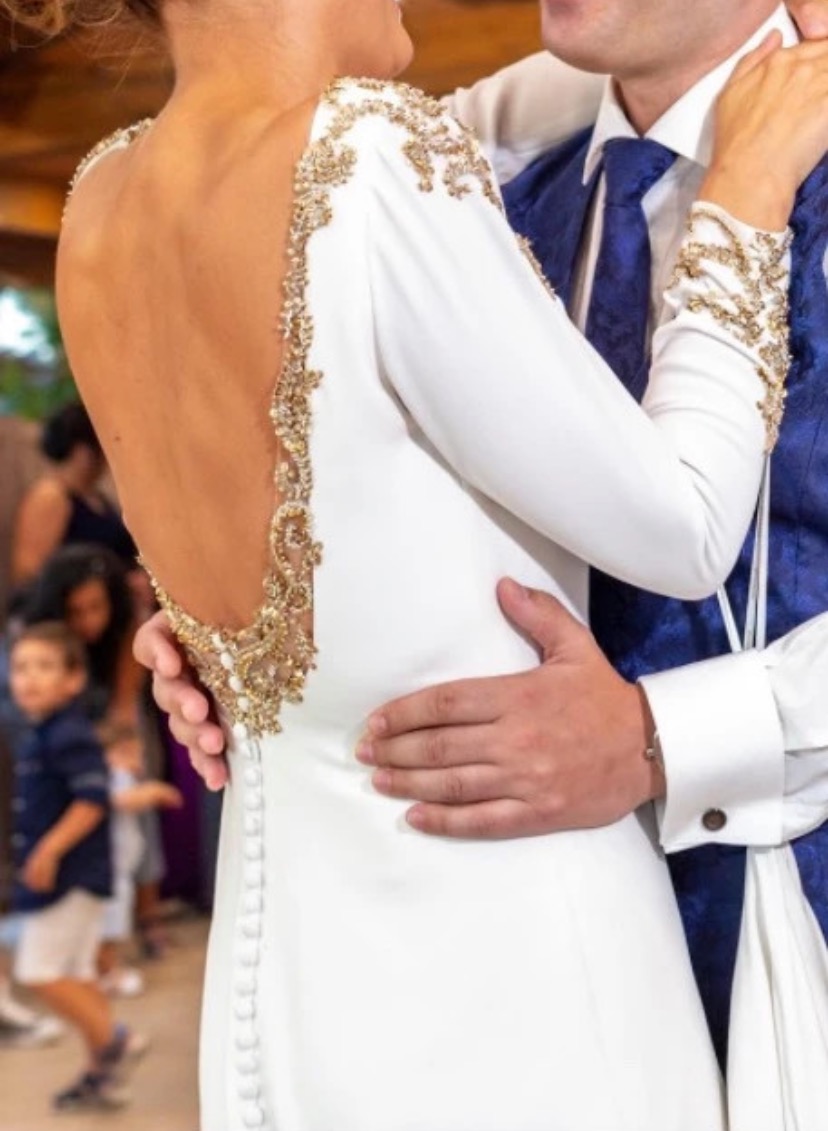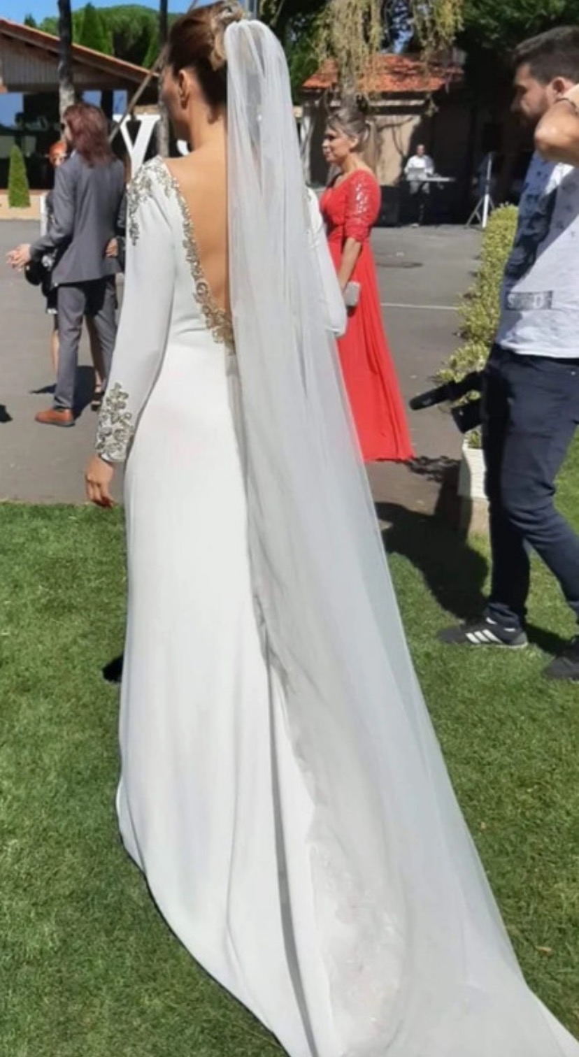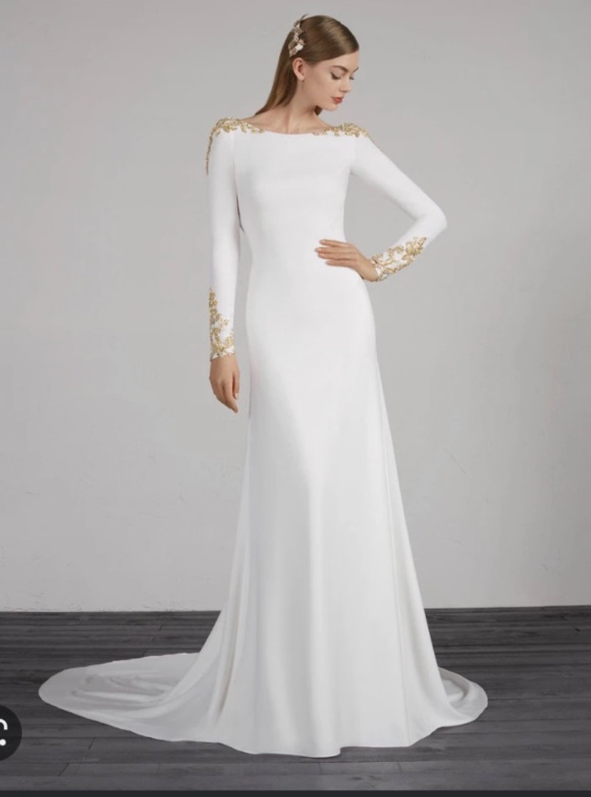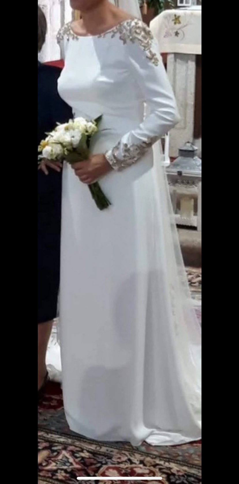 Vestido de pronovias año 2019 en crepe, talla 44 y arreglado para talla 40, tacón de 6cm . Mido 170cm