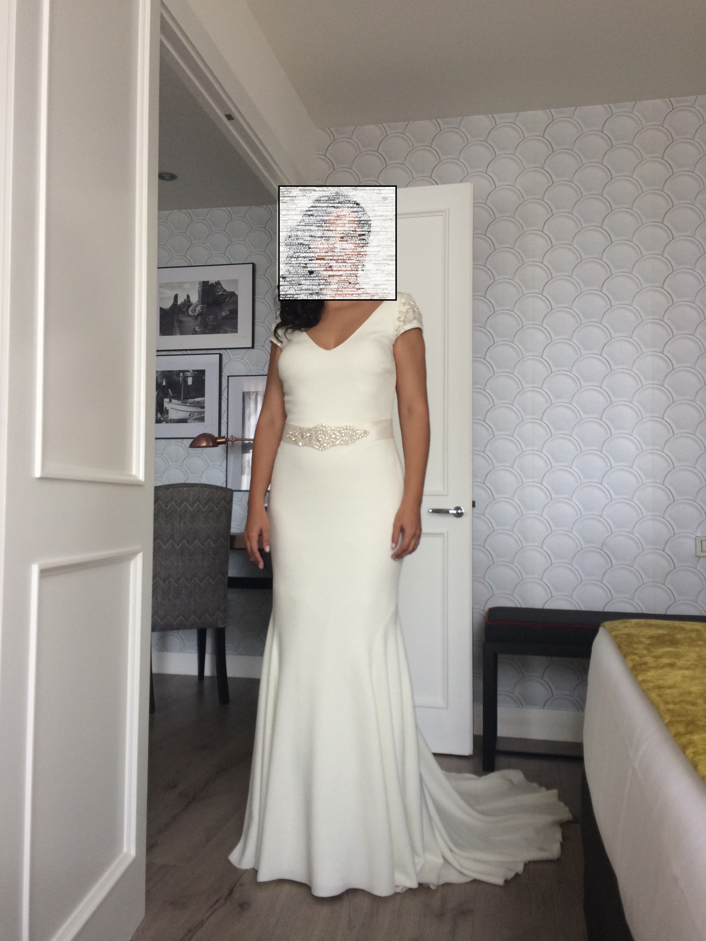 Vestido sencillo pero muy elegante. Muy cómodo de llevar e ideal para usar tanto en verano, como otoño o primavera. Fue usado una vez en el mes de Octubre. El diseño es atemporal por lo que no pasa de moda. Tiene una pequeña cola y se ajusta a las caderas, por lo que exalta la figura. Lo que mas destaca es la pedrería de los hombros y la fila de los botones de la parte trasera del vestido. Se vende sin el cinturón (eso lo dejo para mis recuerdos) pero si incluye la falta interna con tul (enagua).