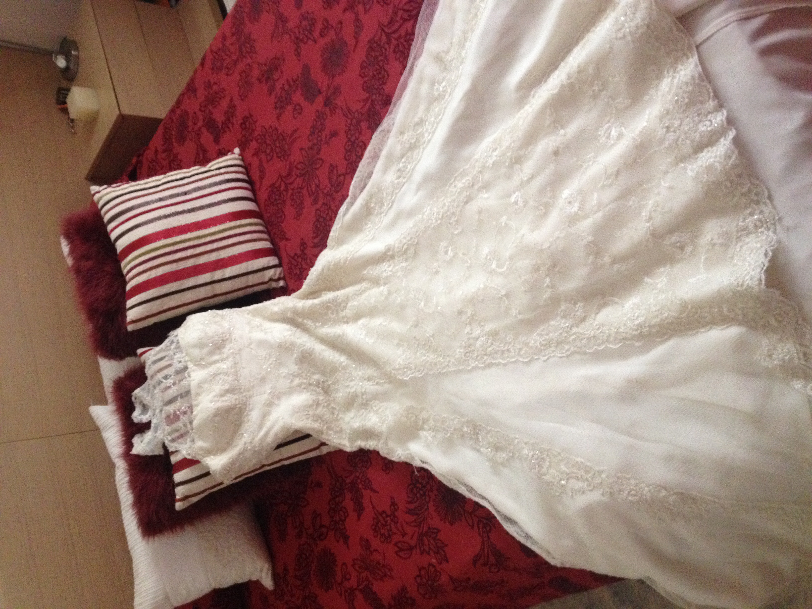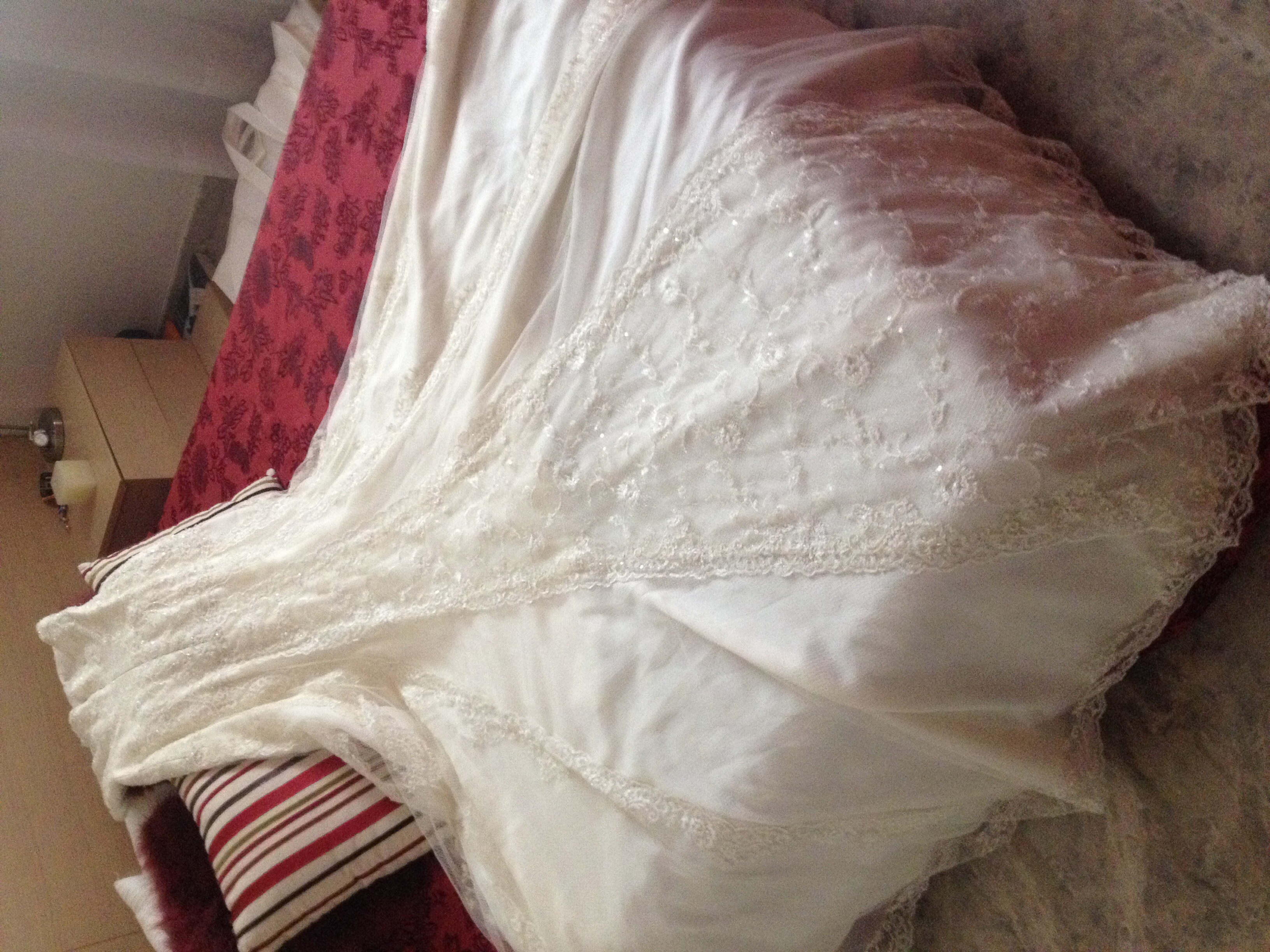 El vestido queda ajustado en cintura con una especie de fajín y tiene una caída impresionante con una cola preciosa.
