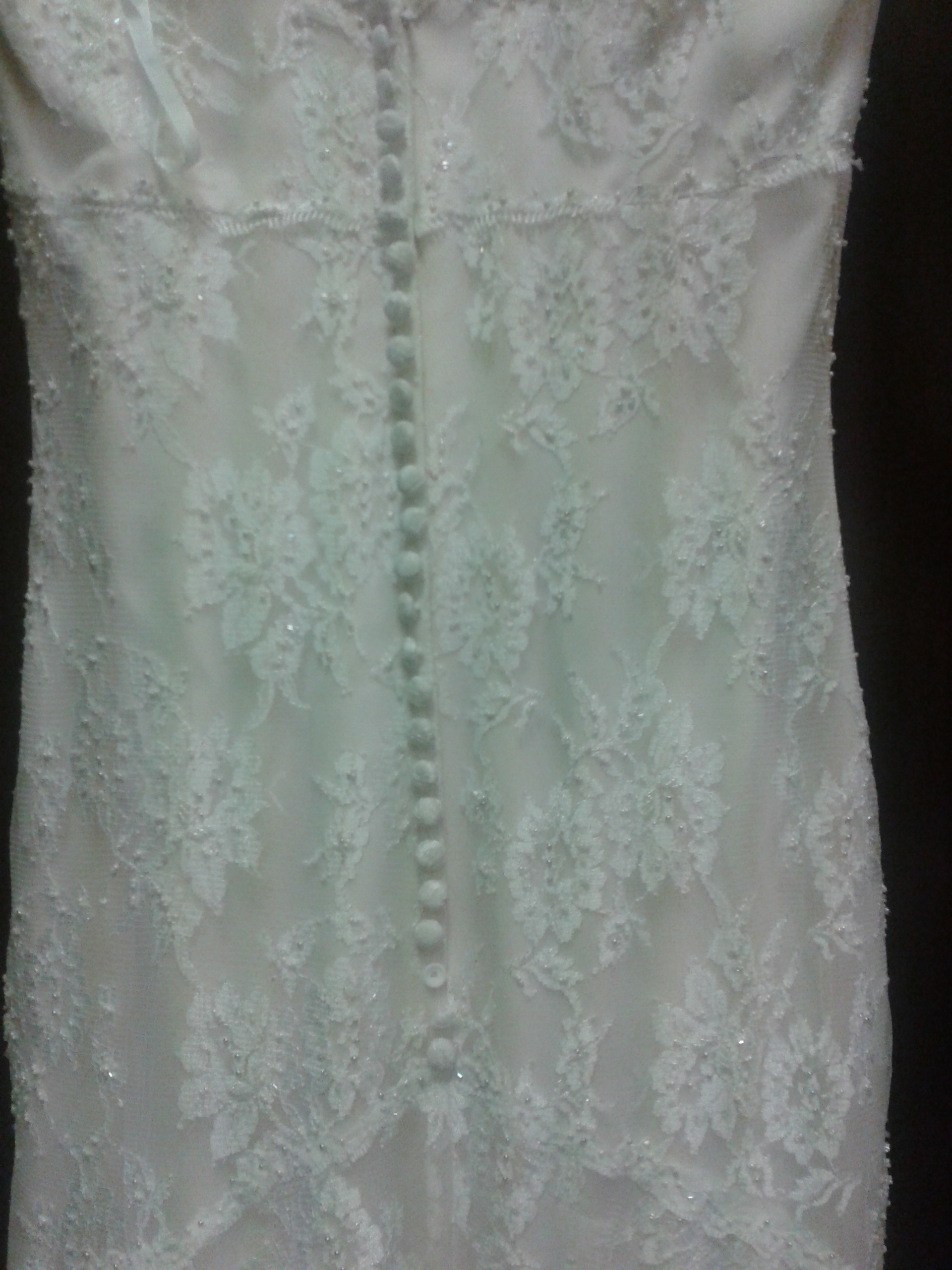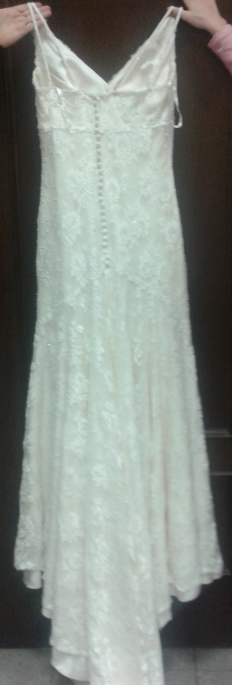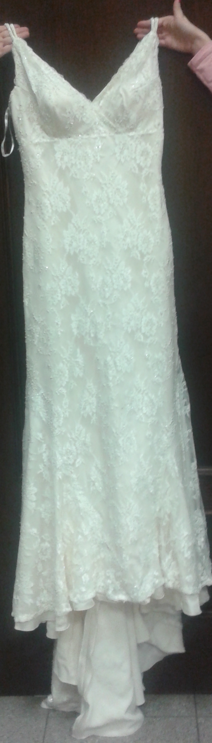 VESTIDO DE ENCAJE CON CUELLO EN PICO, BOTONES EN LA ESPALTA Y COLA NO MUY LARGA, ESTILIZA MUCHO, SOLO USADO UNA VEZ, LLEVADO A LA TINTORERIA Y COMO NUEVO.