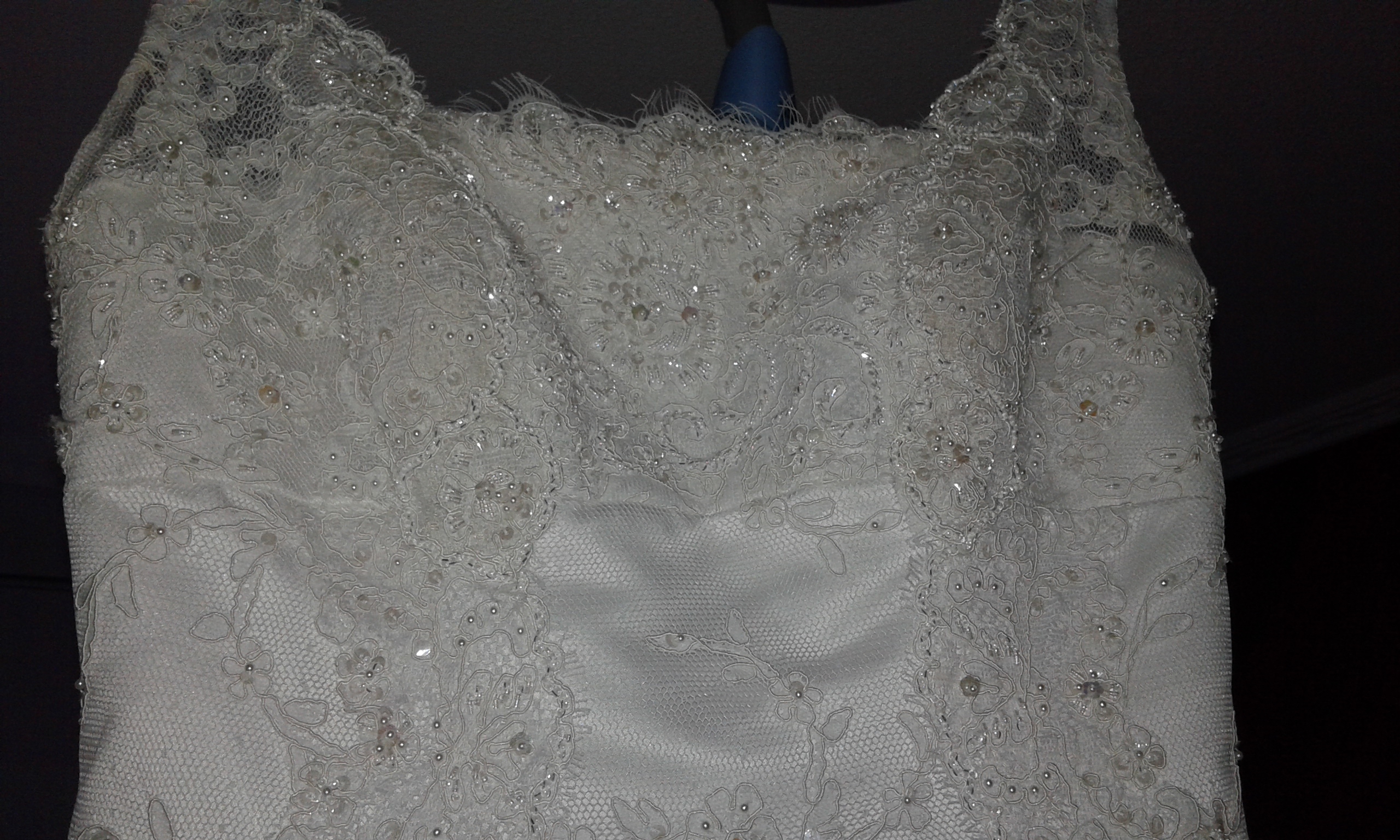 Vestido en cuerpo sirena blanco bordado con pedrería y encaje con tirantes y cola de 3 metros, en perfecto estado.