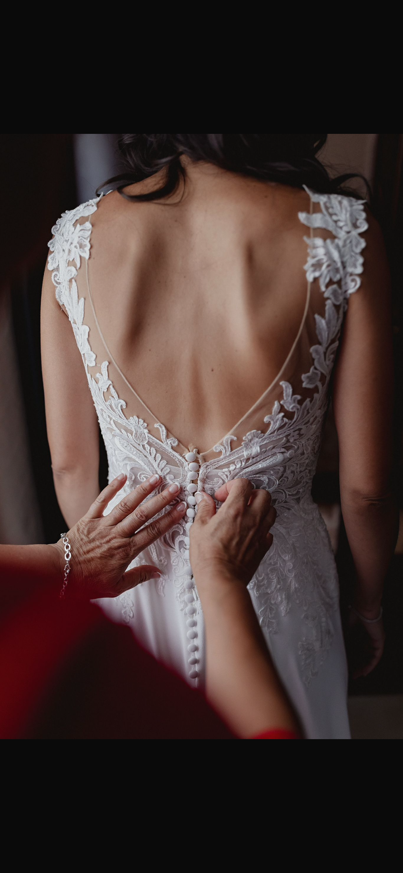 Vestido de novia de un solo uso, el día de mi bodas Está confeccionado en suave crepé eco que estiliza. Cuenta con una bonita espalda, mangas y corpiño de efecto transparente, de tul bordado. La hilera de botones en la espalda es un detalle precioso.