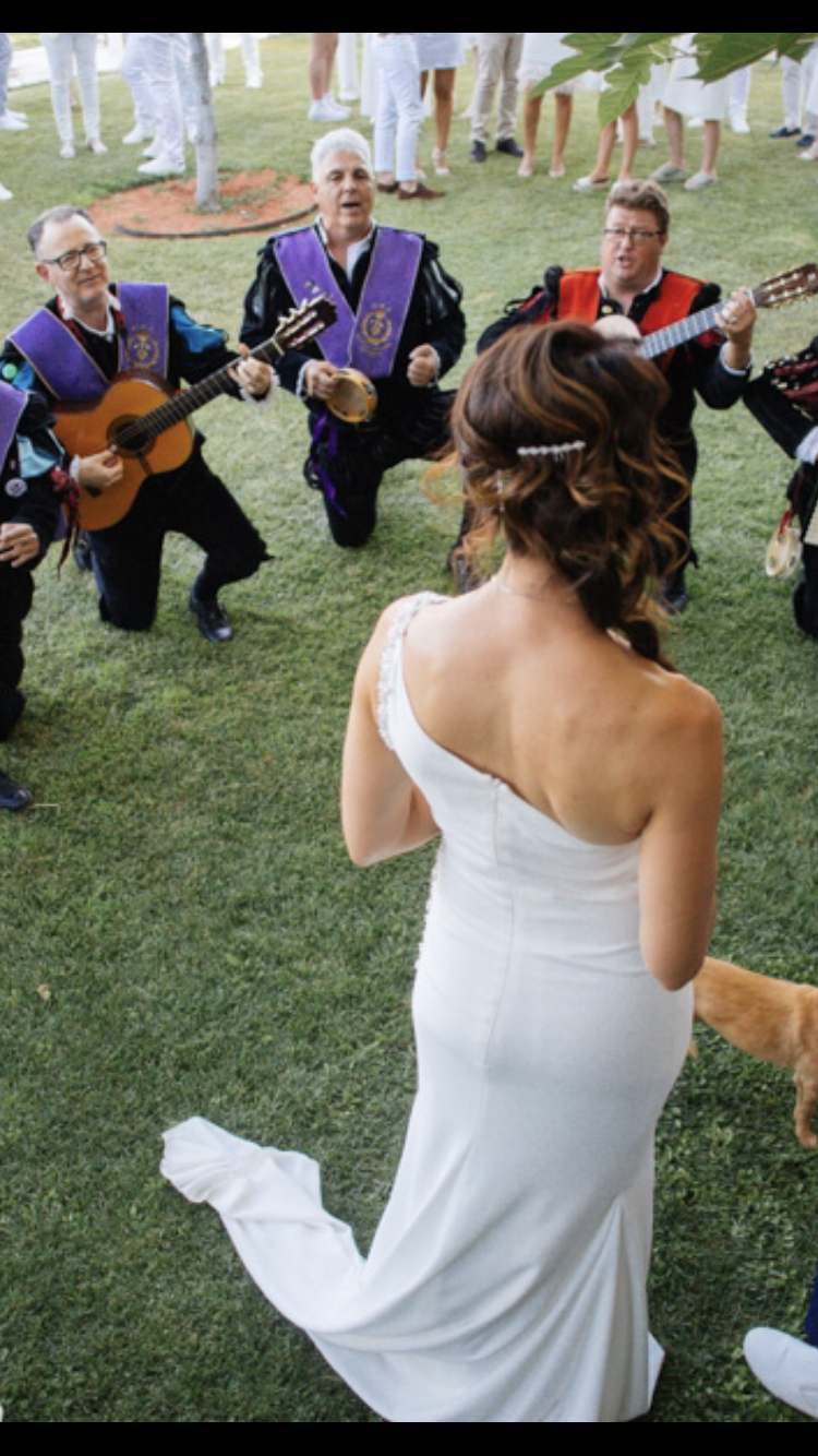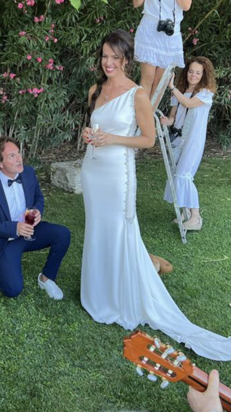 El vestido se arregló un poco. Se acortó un poco la cola. Ese resto de tel se utilizó como chal. Al lateral transparente se añadió una tela color carne que permite llevar ropa interior sin perder el efecto “piel”
