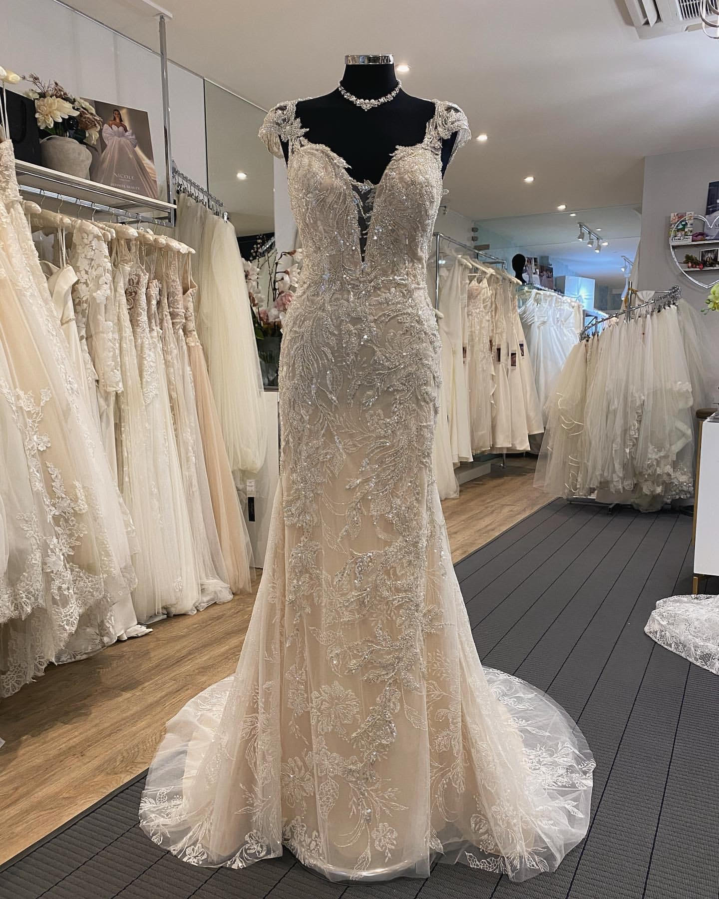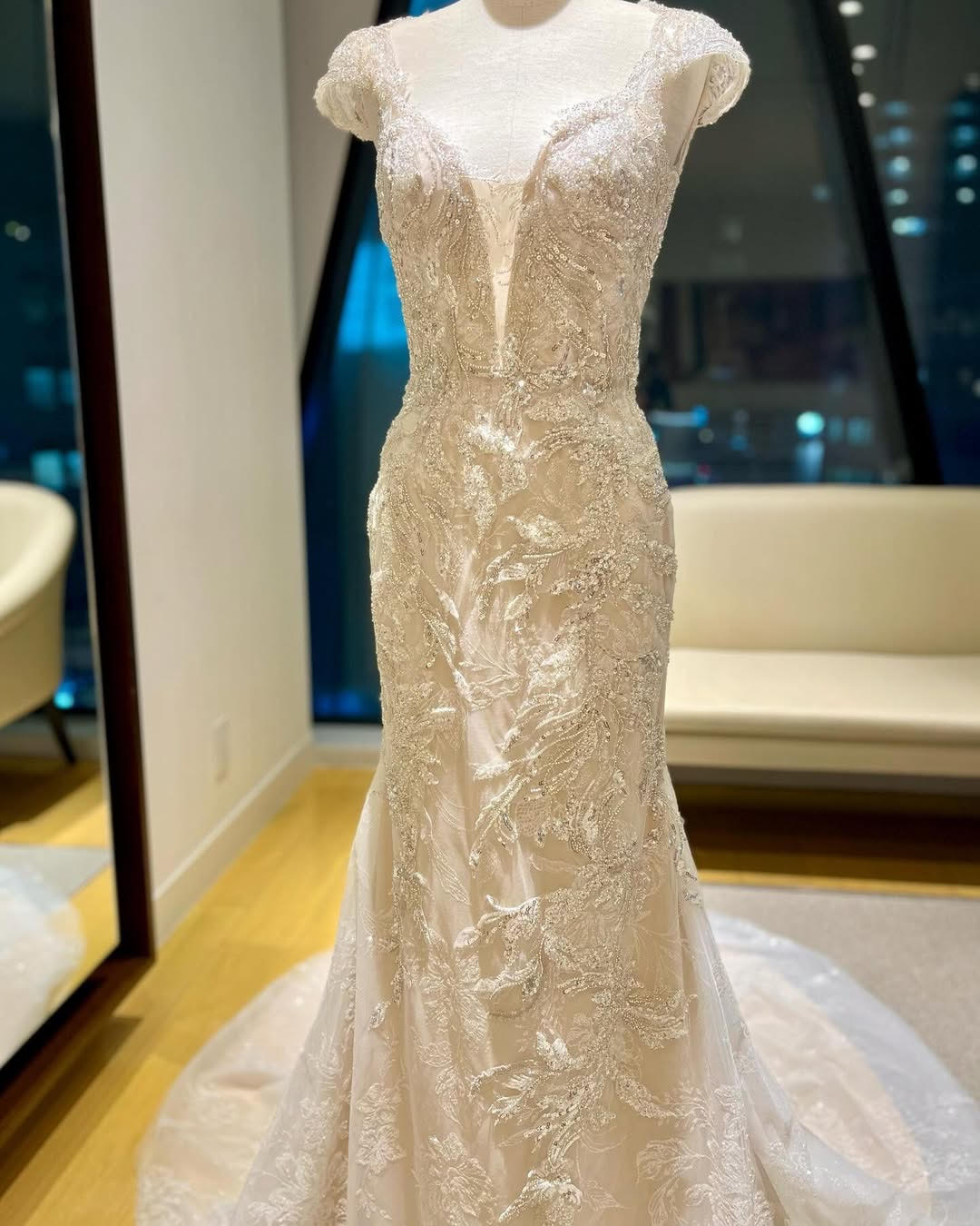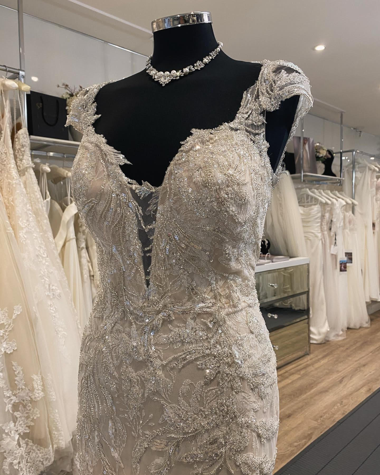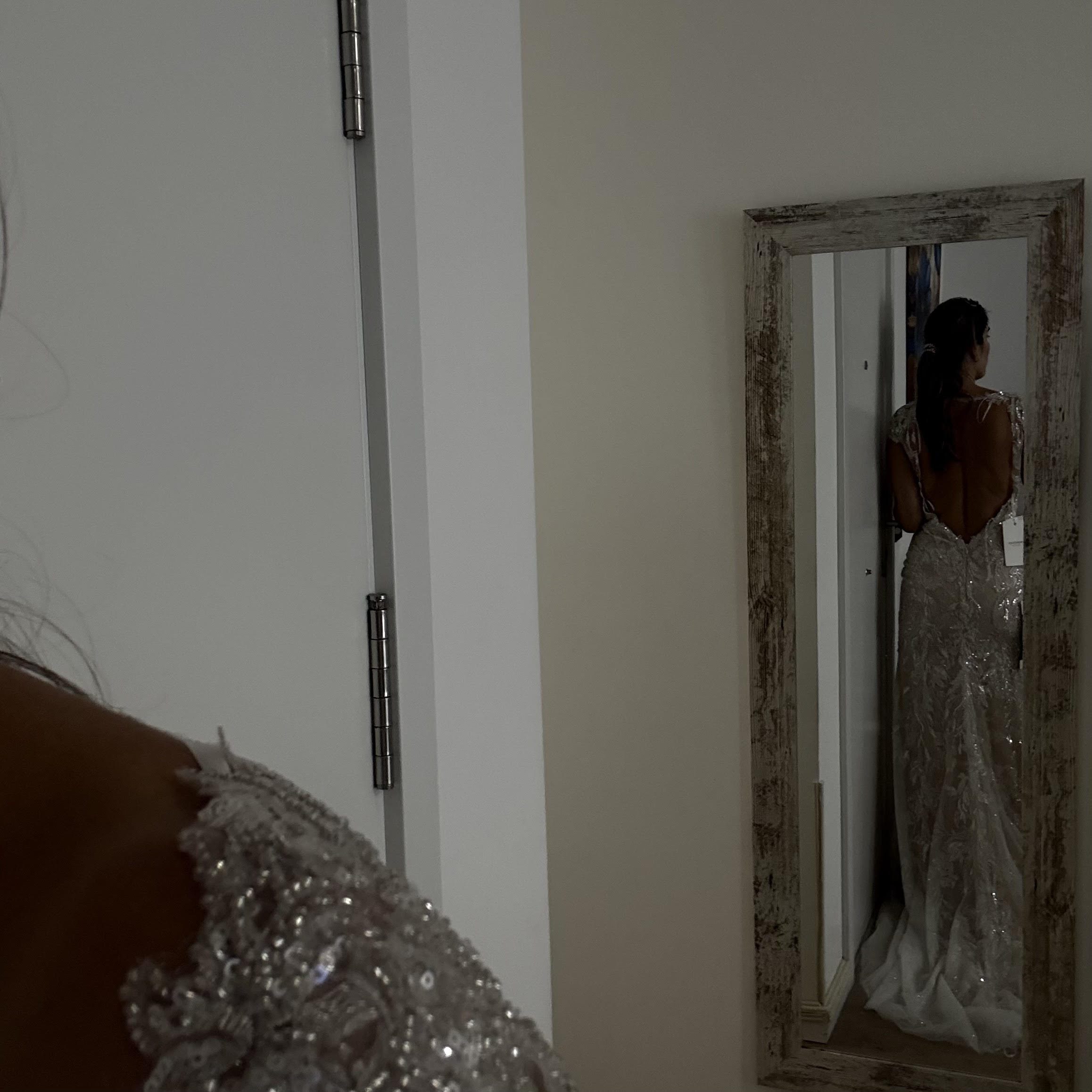 Precioso vestido de sirena moderno con bordados metálicos brillantes que le dan un efecto elegante y resplandeciente. Su escote pronunciado con un divertido tirante en la espalda baja atrae la mirada de forma seductora. Combínalo con un velo transparente desmontable con bordado plateado a juego para un toque aún más dramático. Lo vendo también por 200€ nuevo. El vestido es la talla 42 y está sin estrenar con etiqueta. Comprado en tienda