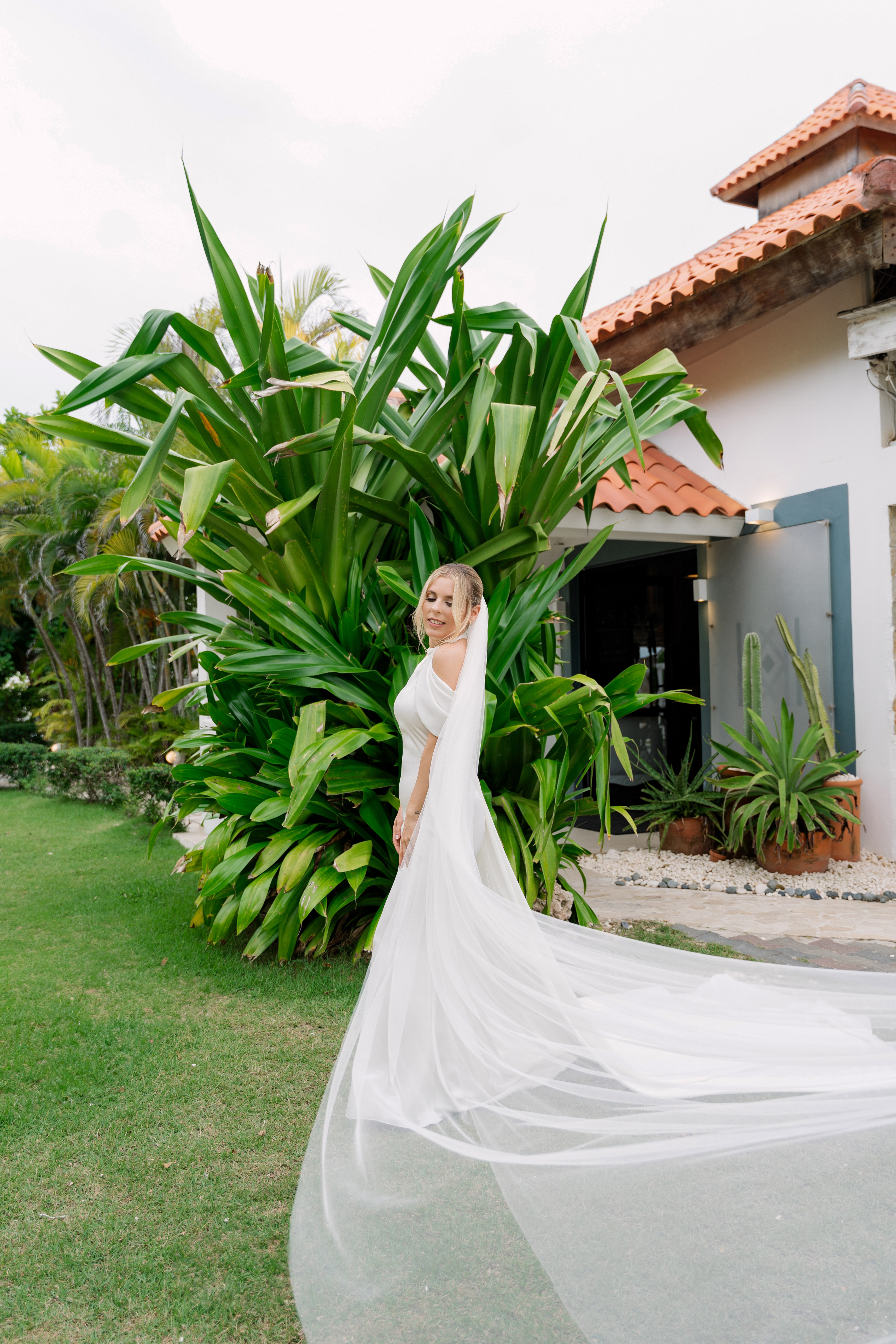 ✔️ Cuenta con una espalda profunda, escote halter y mangas drapeadas y caídas. Se puede complementar con una cola estilo Watteau para la ceremonia (también esta incluida).