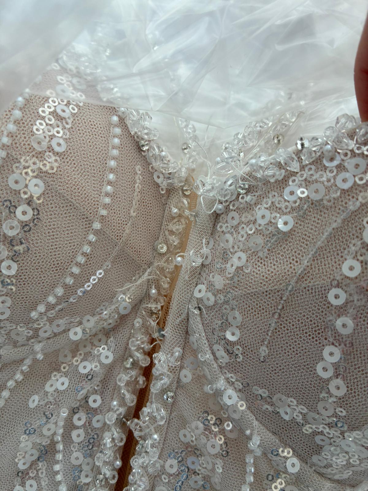 Debido a que la tela es de pedrería, al limpiarlo se le han caído algunos canotillos del escote, así como ganchos de la falda, los cuales he pedido en Pronovias y me dan dado para su sustitución.