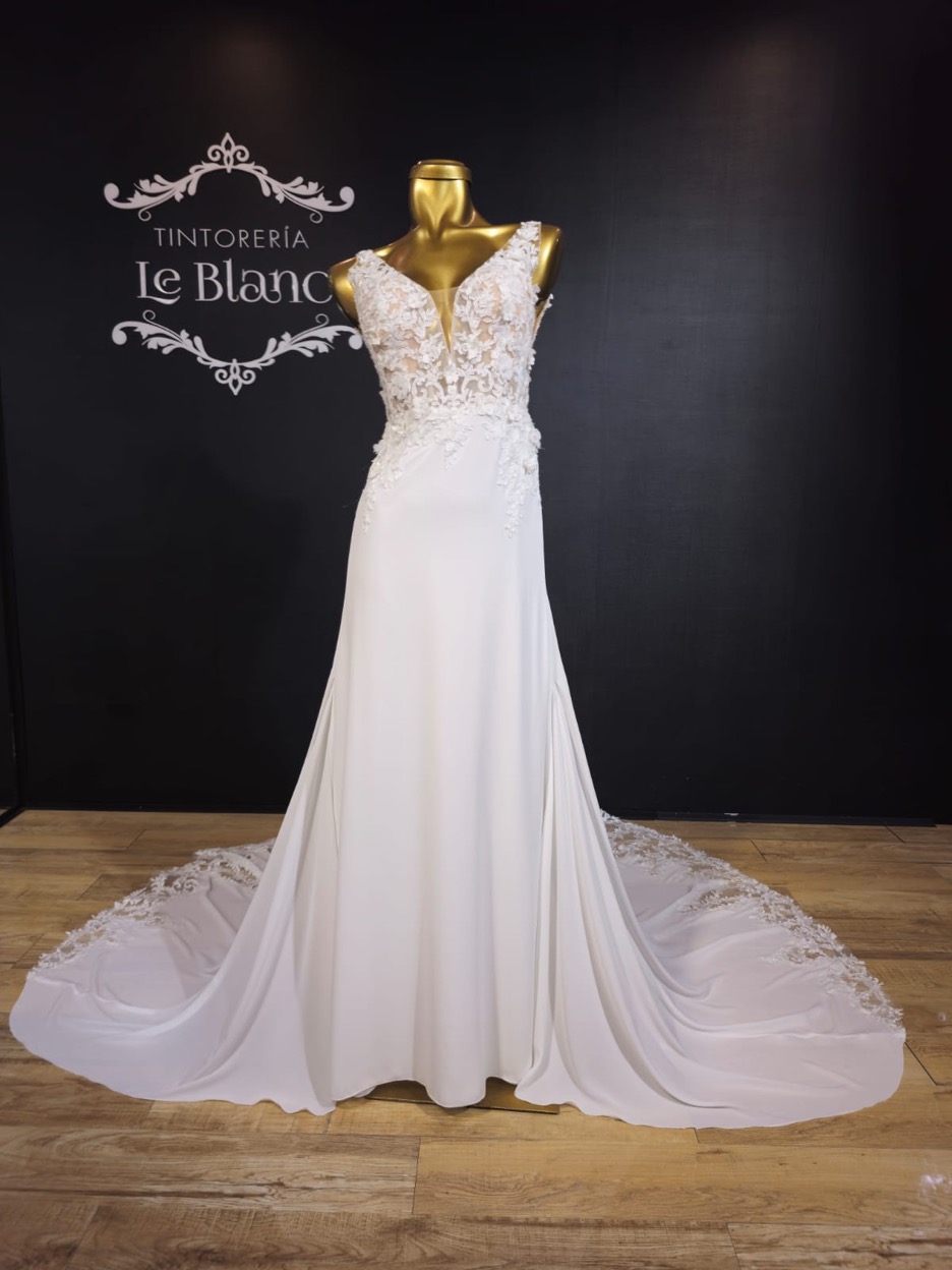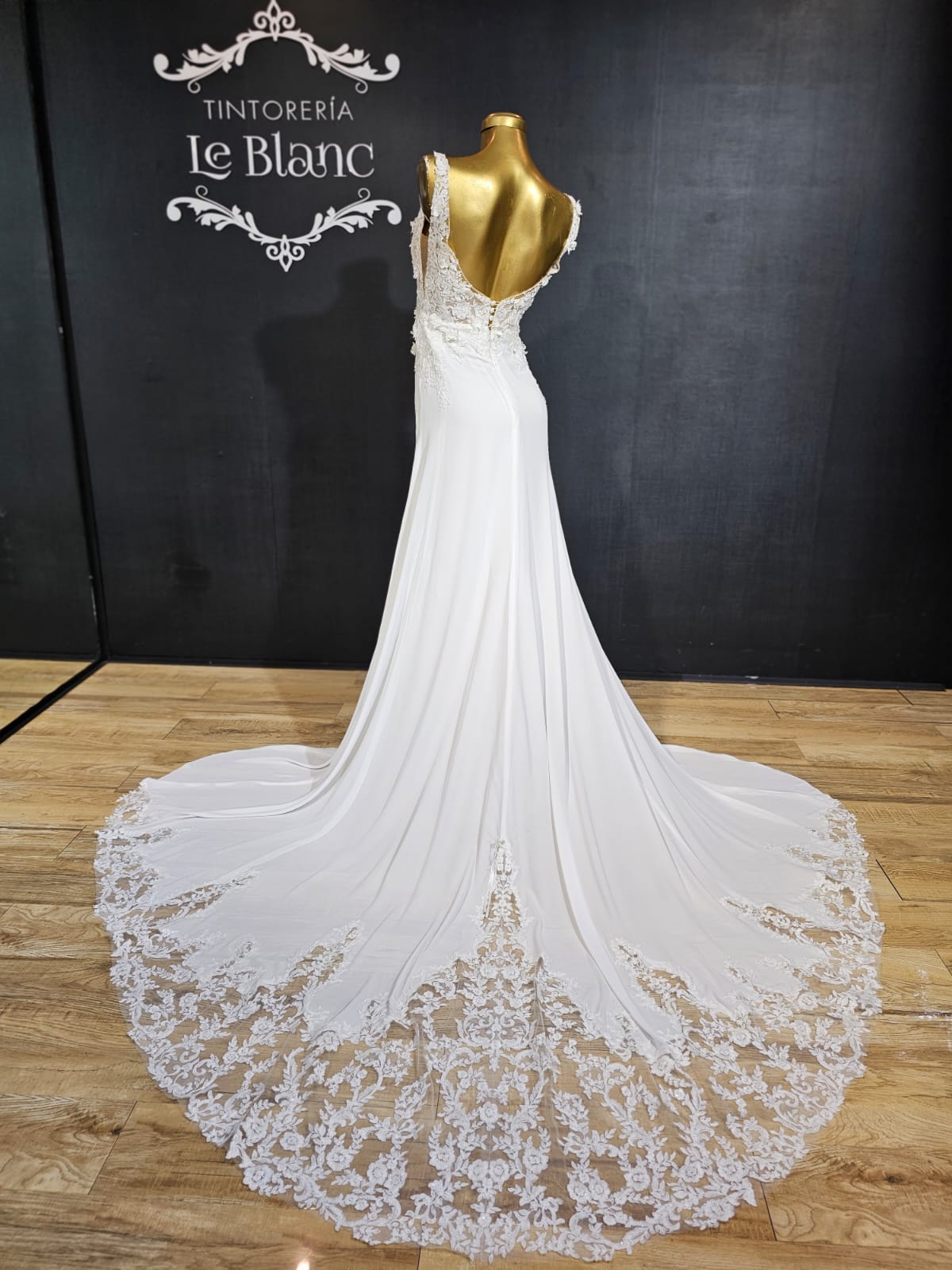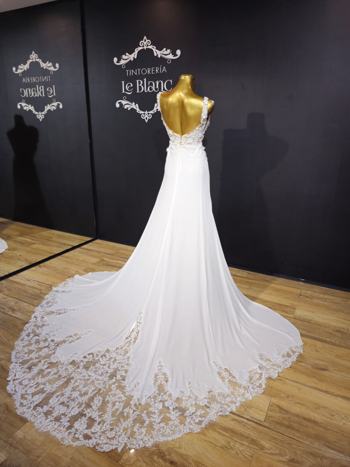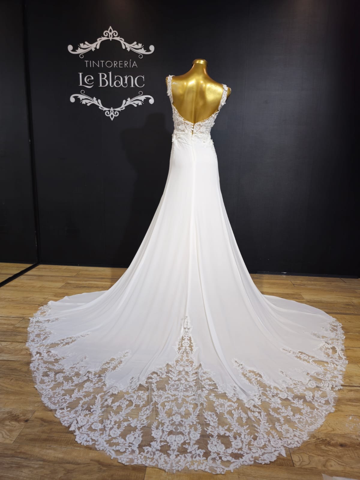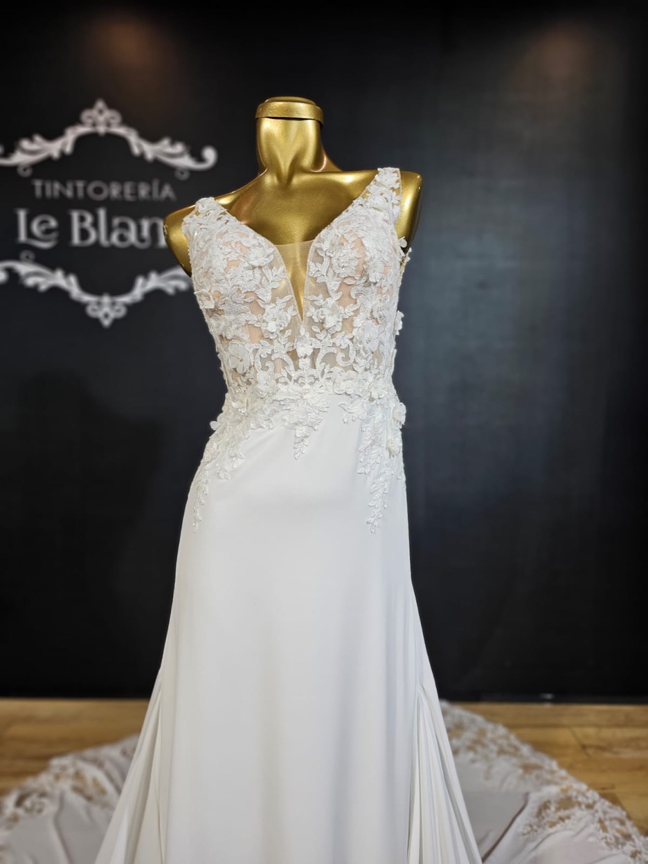 Ha sido un vestido precioso, ligero y muy cómodo de usar tanto en la ceremonia como la fiesta! Incluye botón interior para recoger la cola si lo quieres.