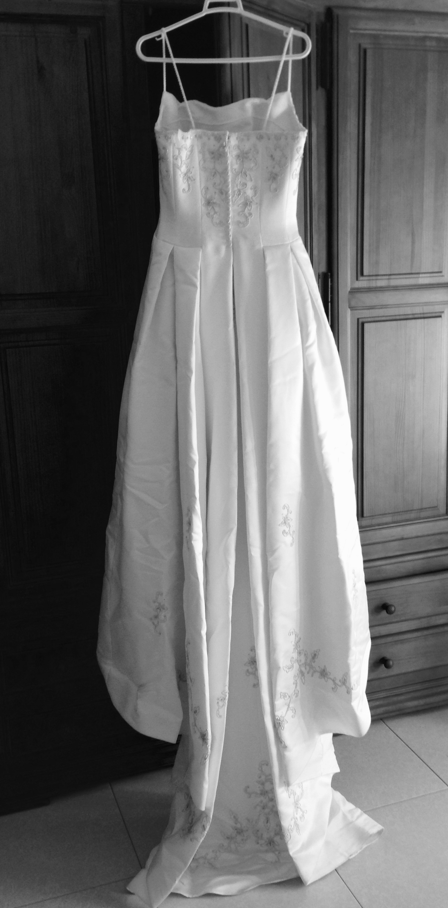 Precioso vestido de corte clásico de Pronovias de una sola pieza, confección en satén y mikado con tirantes de pedrería y cierre de corsé. La confección, la tela y los detalles de pedrería y encajes son espectaculares. Un diseño elegante y con mucha clase.