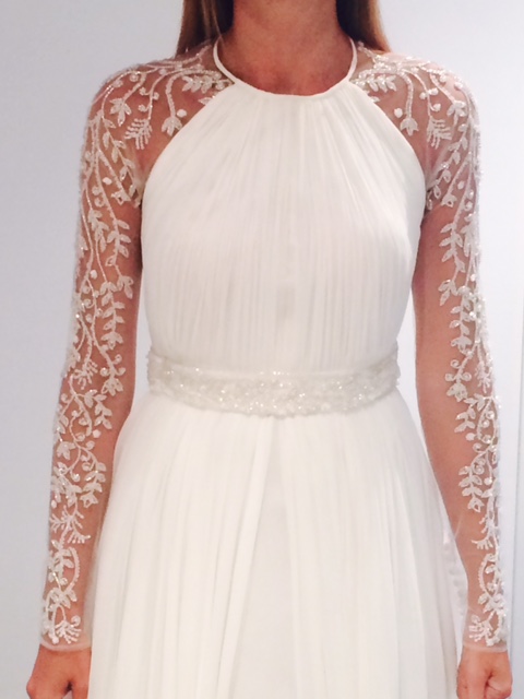Es un vestido largo de gasa de seda con mangas bordadas con pedrería plata, perlada y nacarada. Cuerpo drapeado con escote a caja y abertura en el centro.