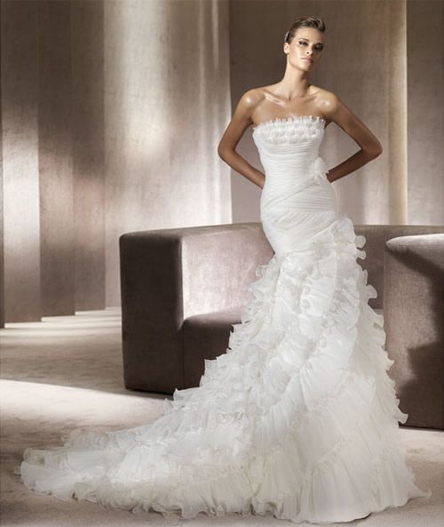 Vestido de palabra de honor con una pequeña flor en el lado, parte de abajo volantes de lado con un poco de cola.