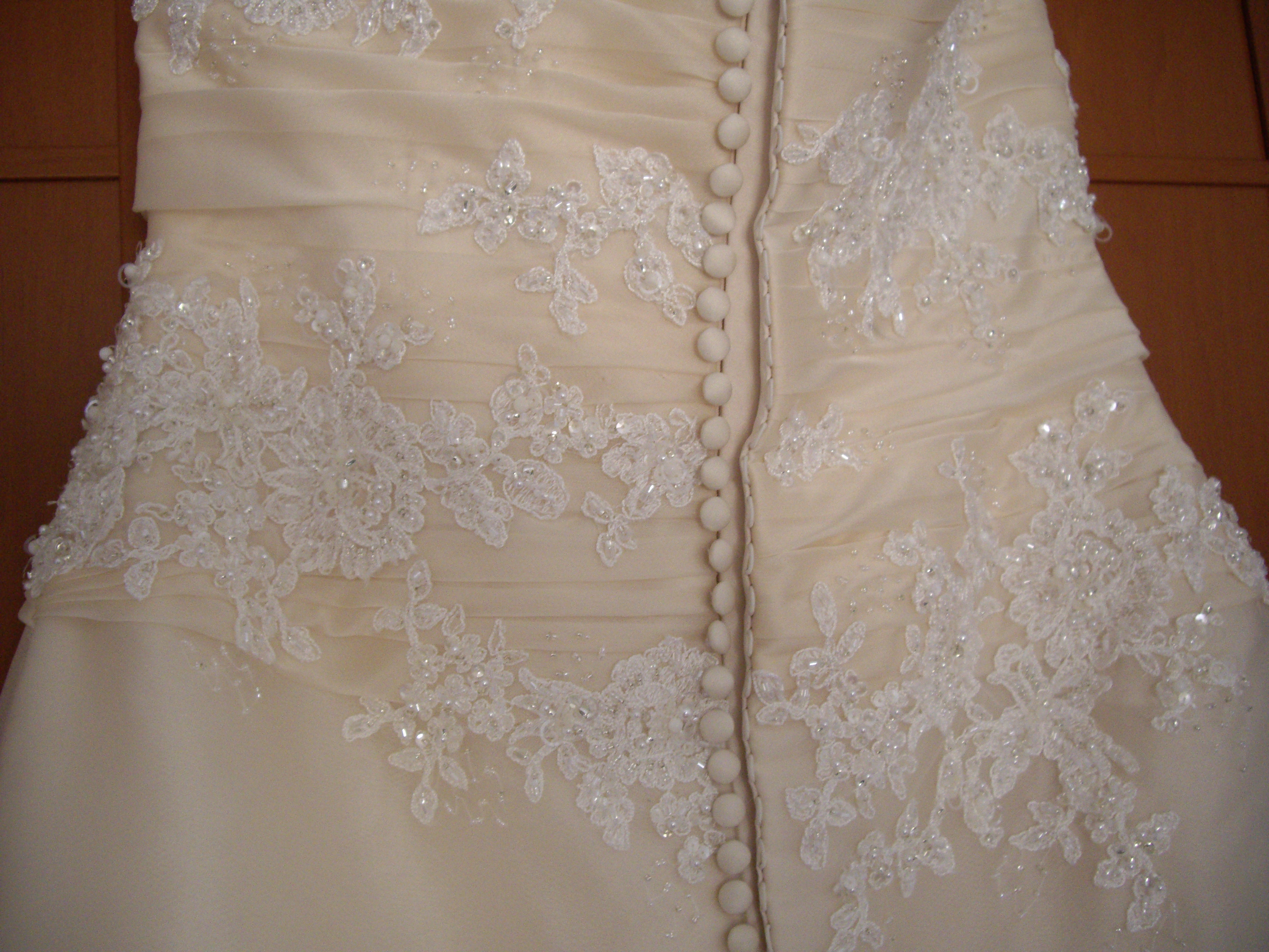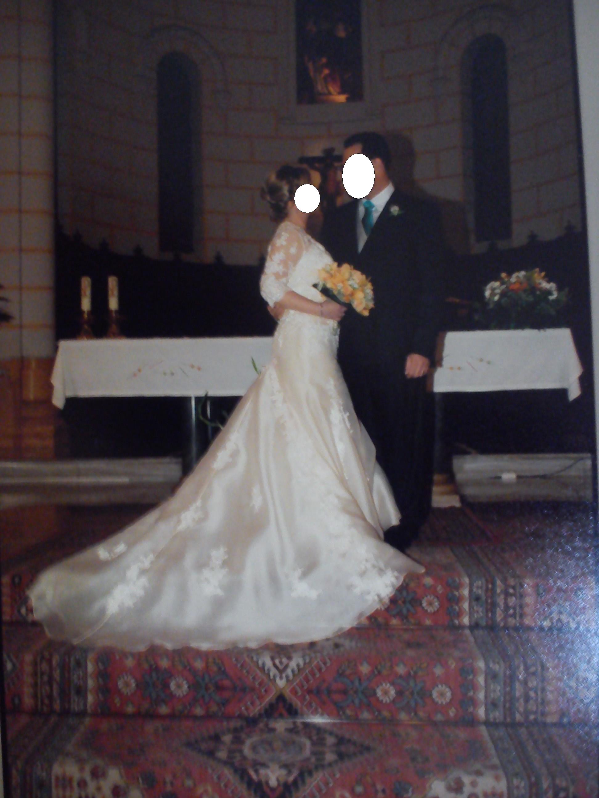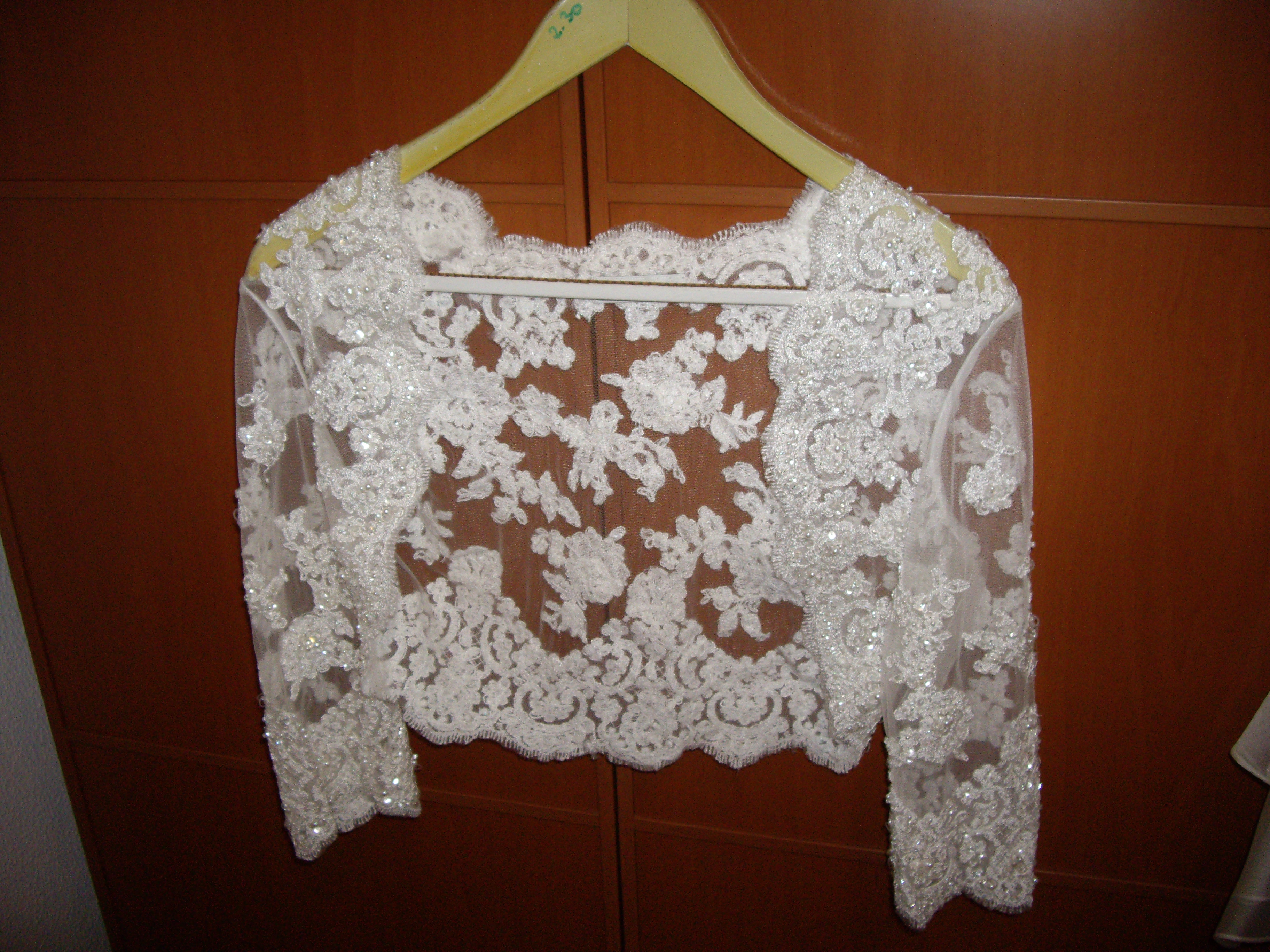 Precioso traje de novia color champagne, entallado en cintura y con detalles de predrería. Junto con el traje incluyo el bolero manga larga de encaje y pedrería (se vendía aparte del traje). Lavado en tintorería el día después de la boda, guardado siempre en su funda.
