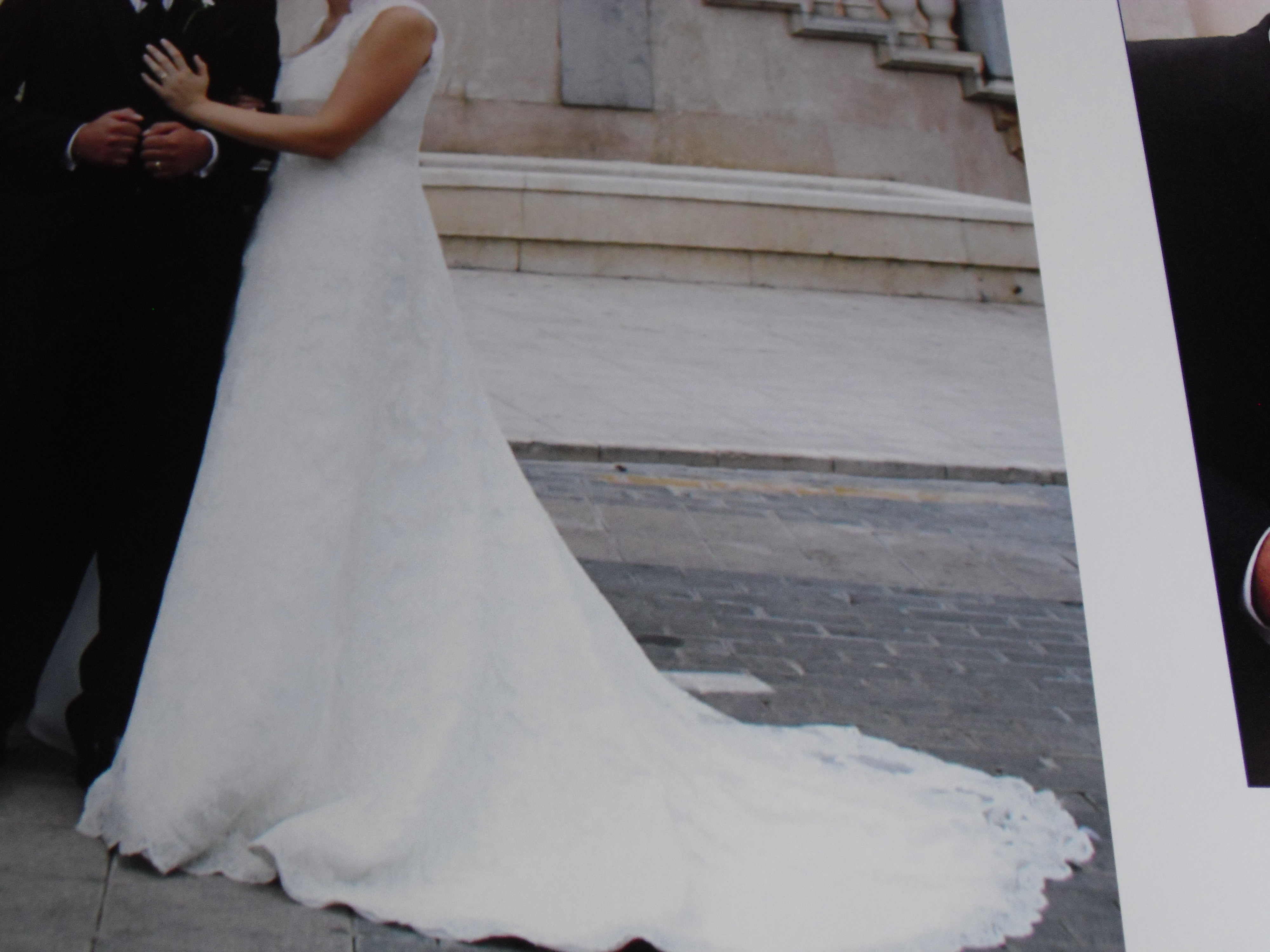 El vestido esta en perfecto estado, son dos piezas, el traje liso de palabra de honor con detalle de pedrería en el pecho, y un abrigo de encaje(se puede llevar en la ceremonia solamente).