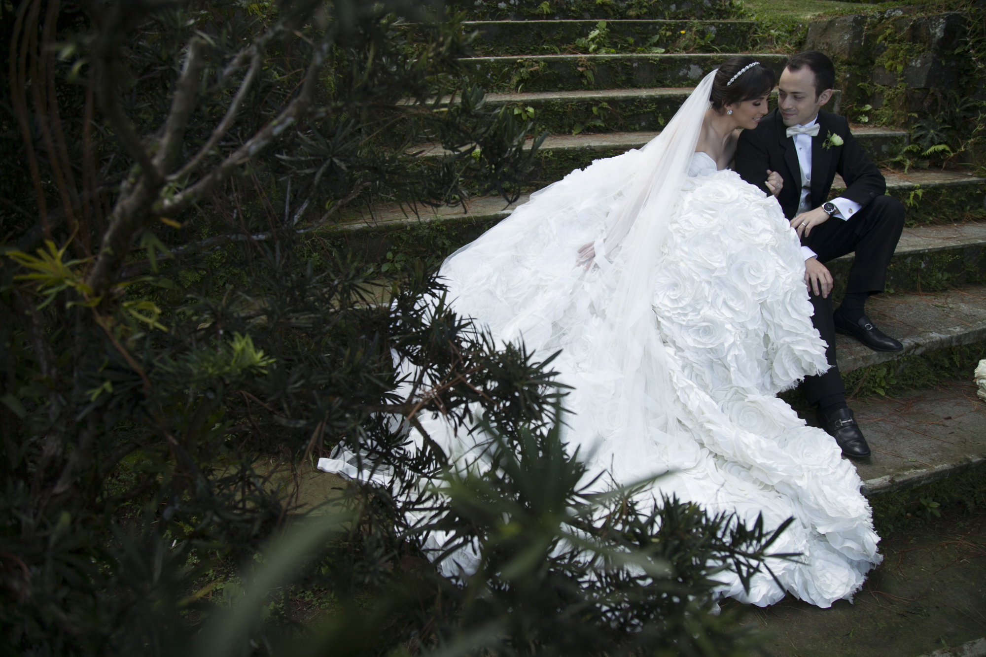 Vestido de Novia de tipo “Baile o Gala” – campana, Corte corazón, con rosas en el faldón.