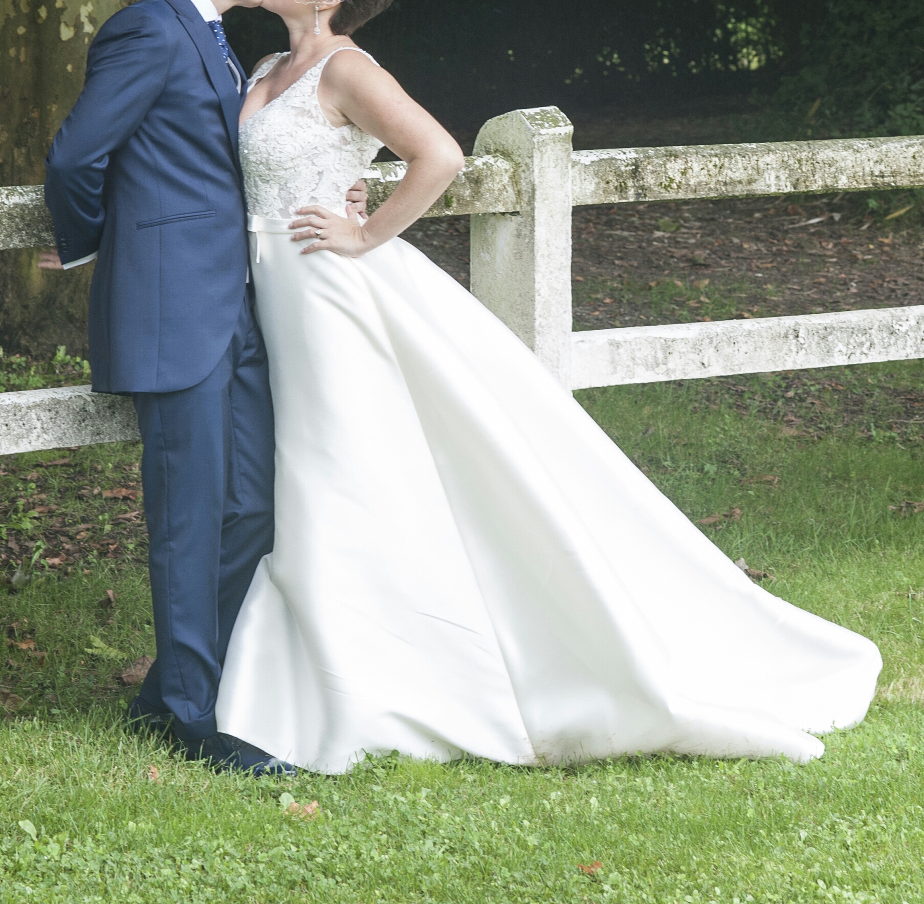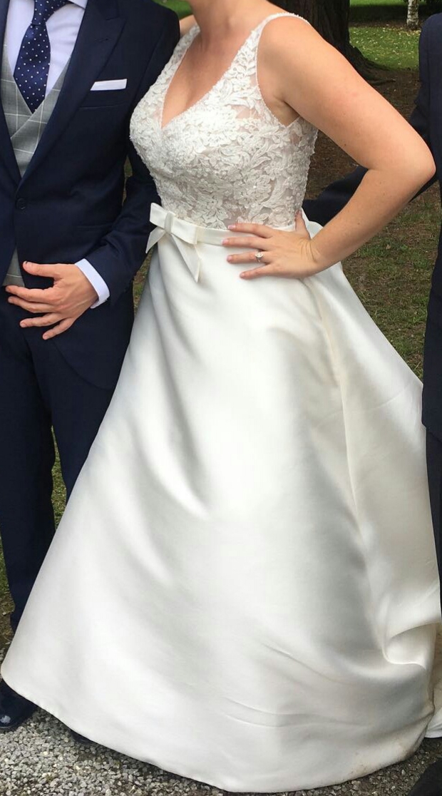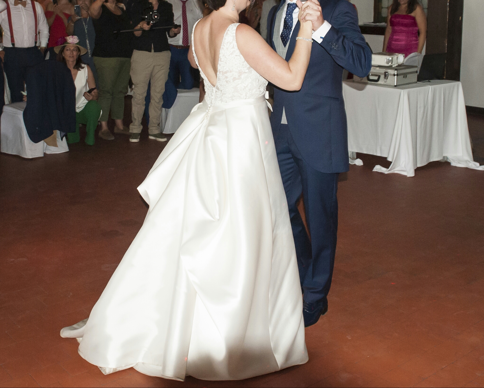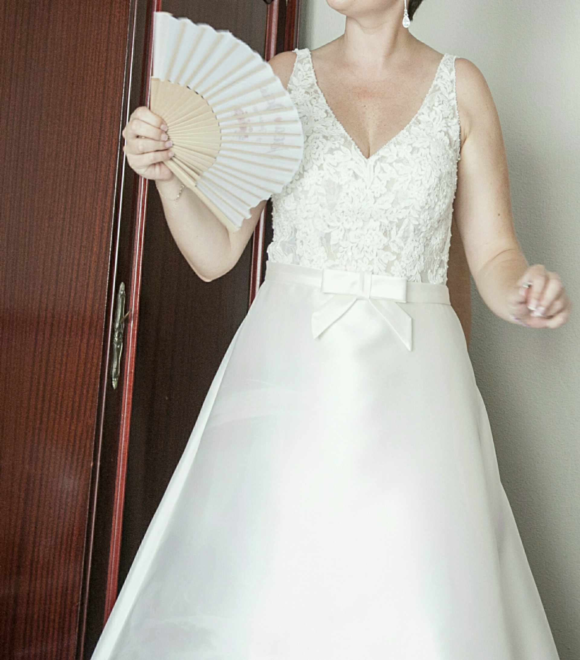 Precioso y comodo vestido usado solo 1 vez y limpio de tintorería. El escote en V y la espalda escotada con transparencias son dos sellos de elegancia y sensualidad con los que cuenta este romántico vestido de novia. Un vestido de novia de estilo clásico de lo más favorecedor con una falda voluminosa provista de bolsillos que se separa de la parte superior con la ayuda de un cinturón con lazada delantera. Incluye diadema blanca de Penhalta de 150 euros con crystales y un pequeño velo de tul ligero para la cara. Me encargo del coste de envio.