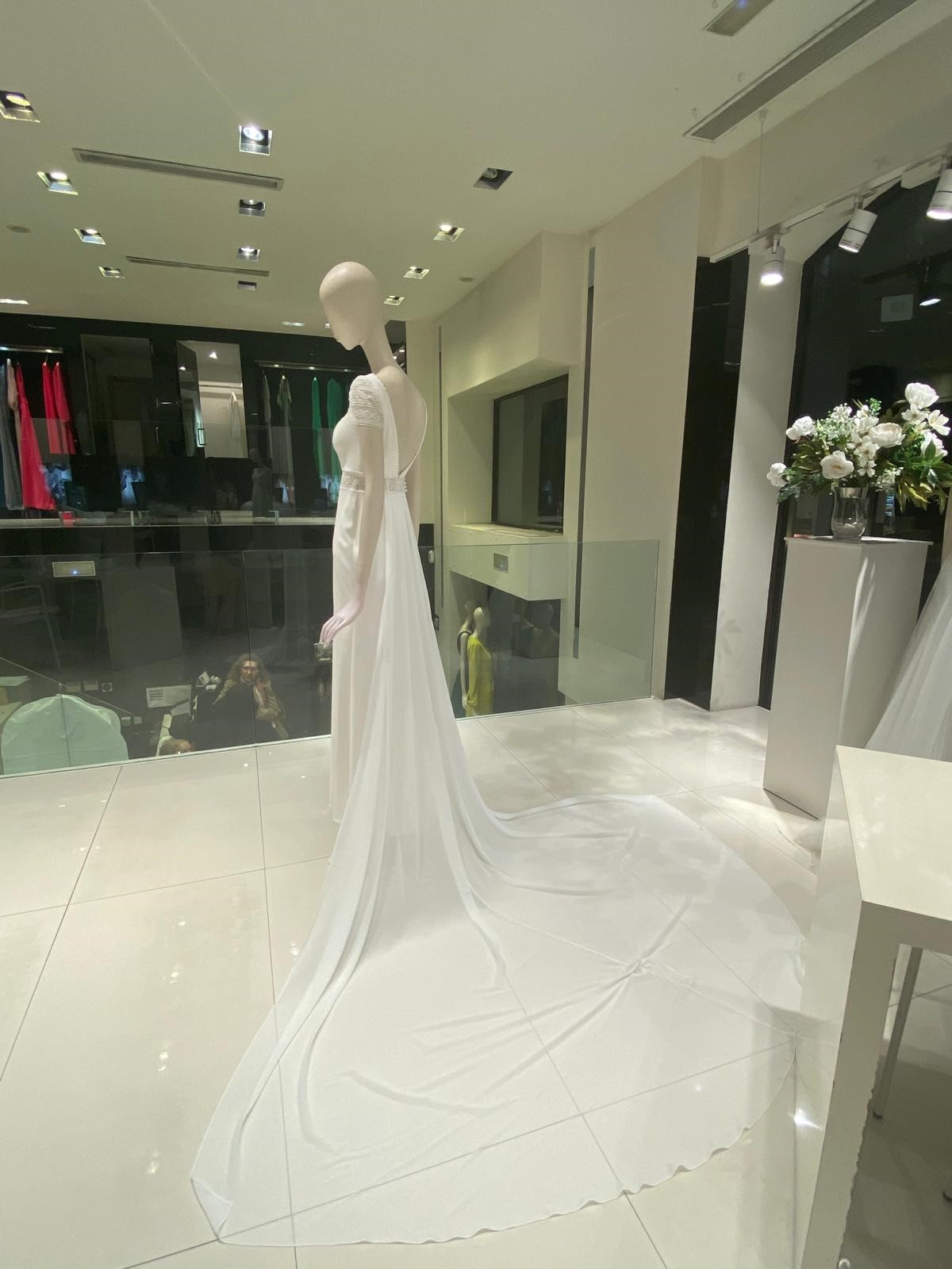 El Vestido es largo de una única pieza de color blanco. Tela crepé con escote barco y espalda acabada en V. Además tiene unos detalles de encaje en los hombros y en la cintura y una cola de tul con opción a quitarla si se desea para una mayor facilidad de movimiento.