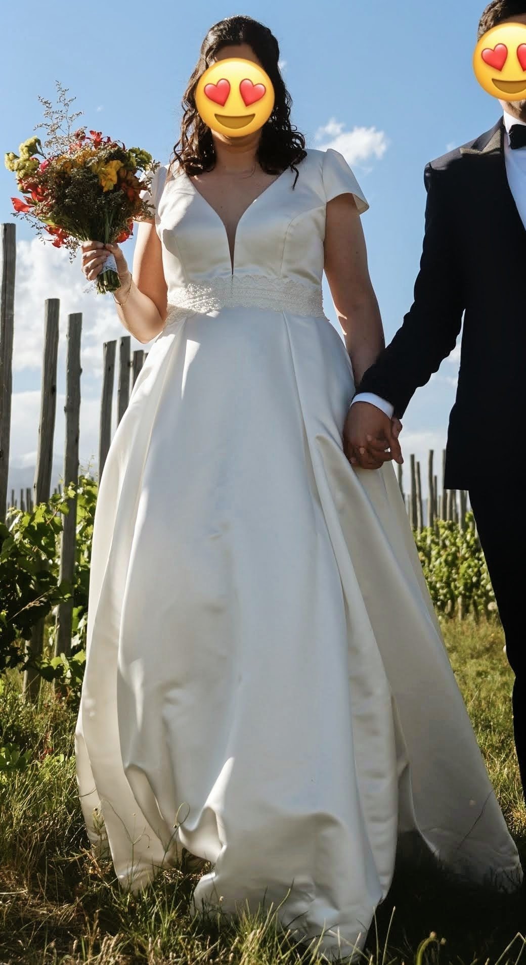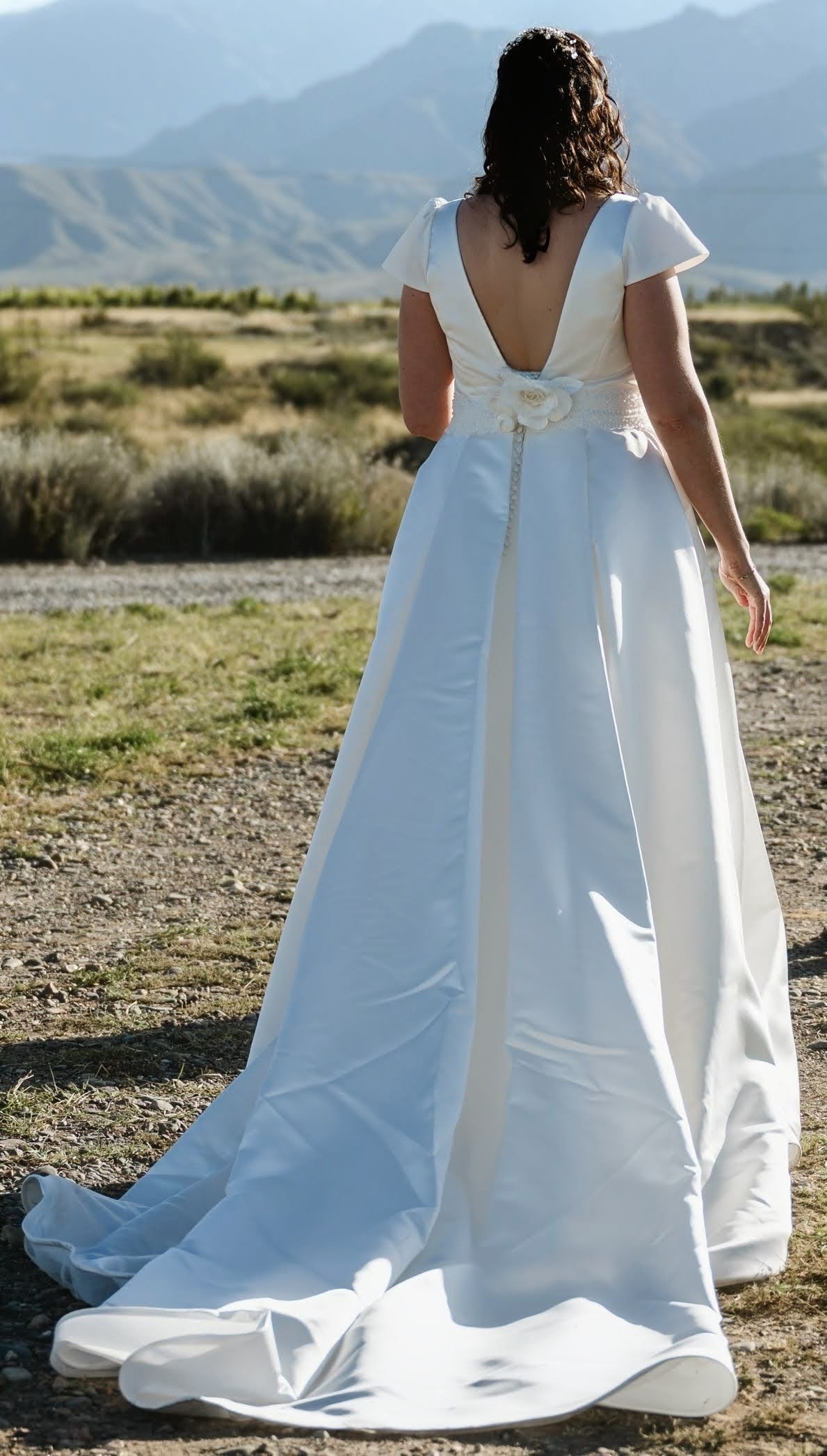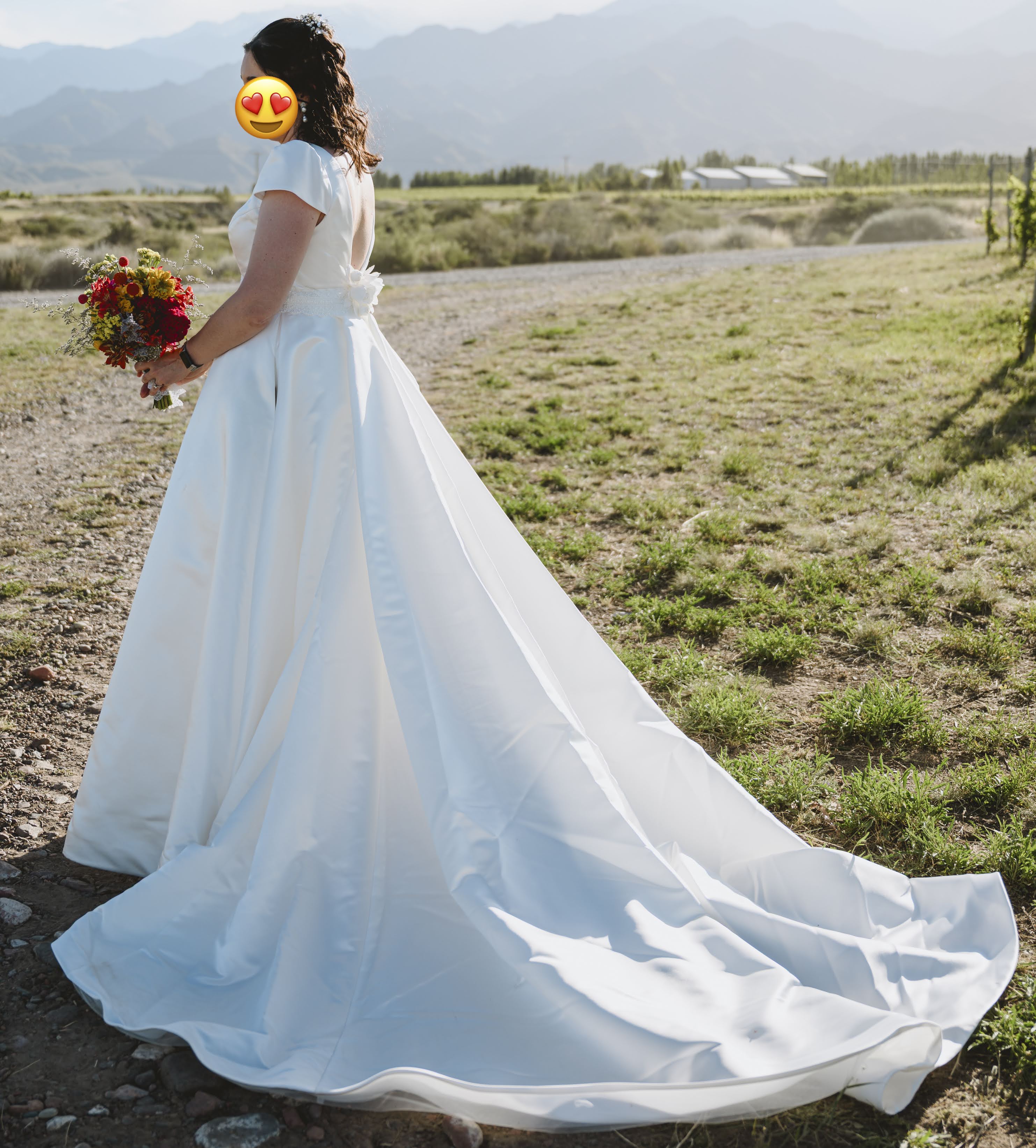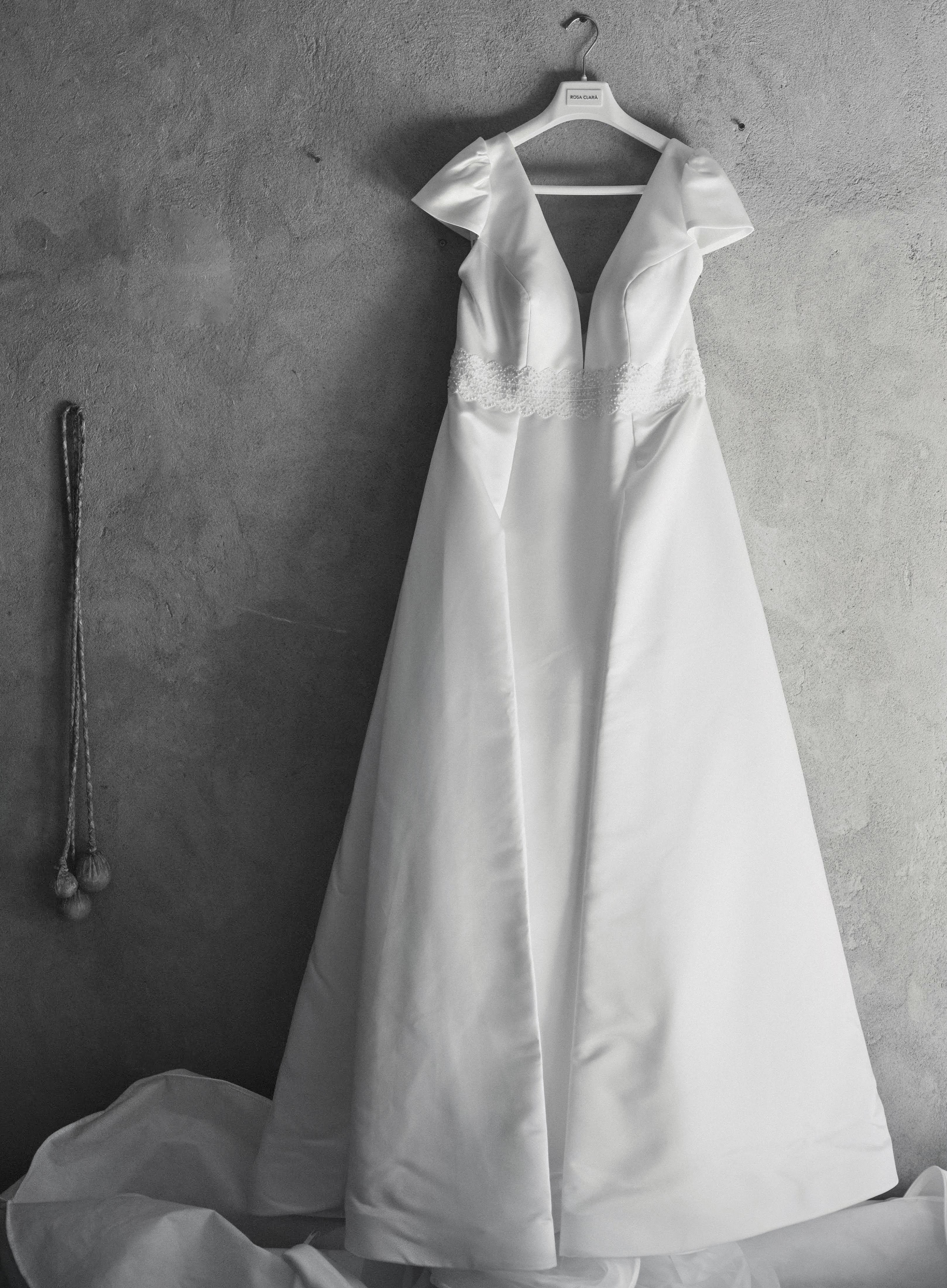 Vendo mi vestido de novia Rosa Clará ARCHER (colección 2025). Es un diseño sencillo y elegante, con silueta en línea A/princesa, escote en pico (V), espalda en V, mangas cortas y cola larga.