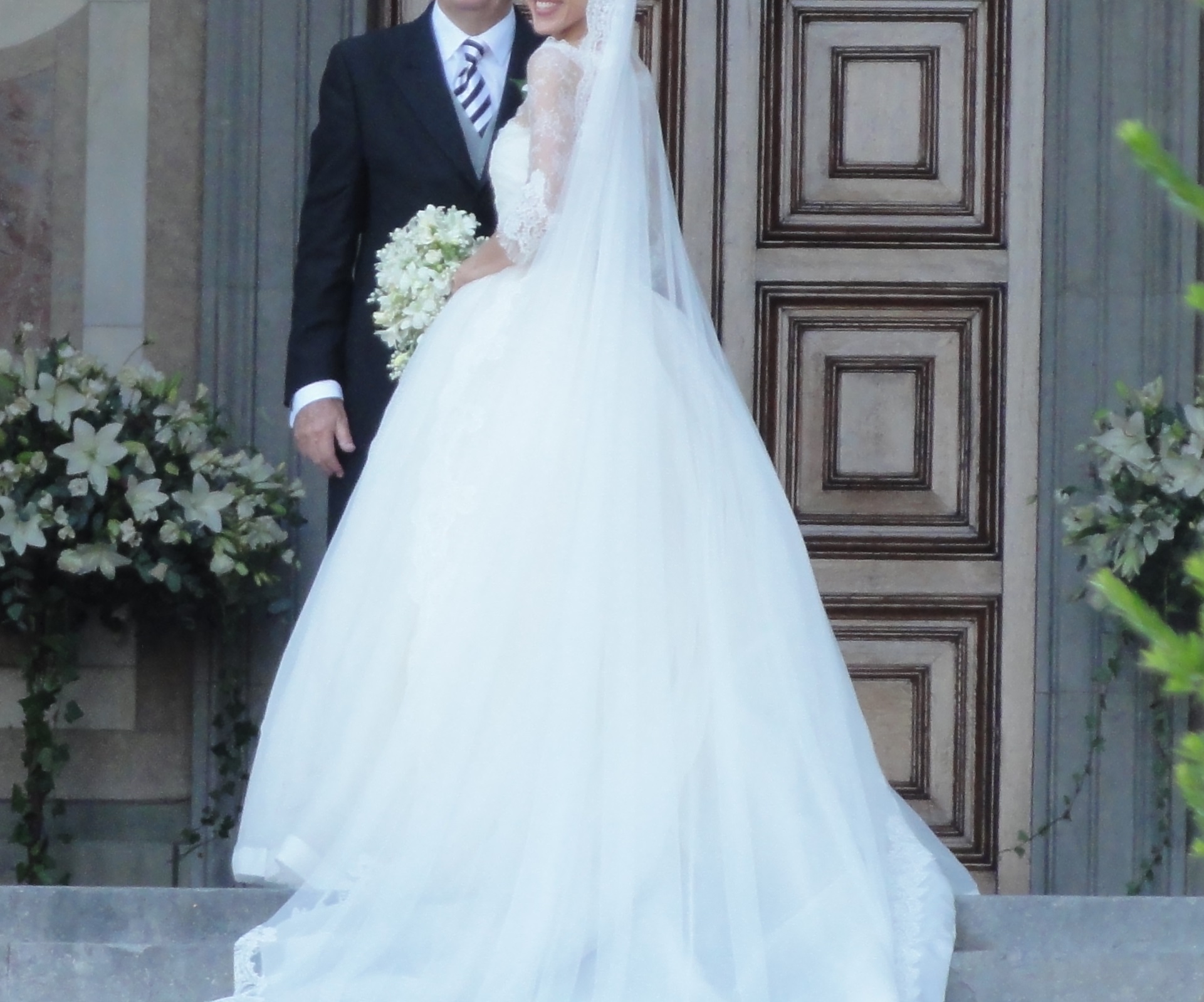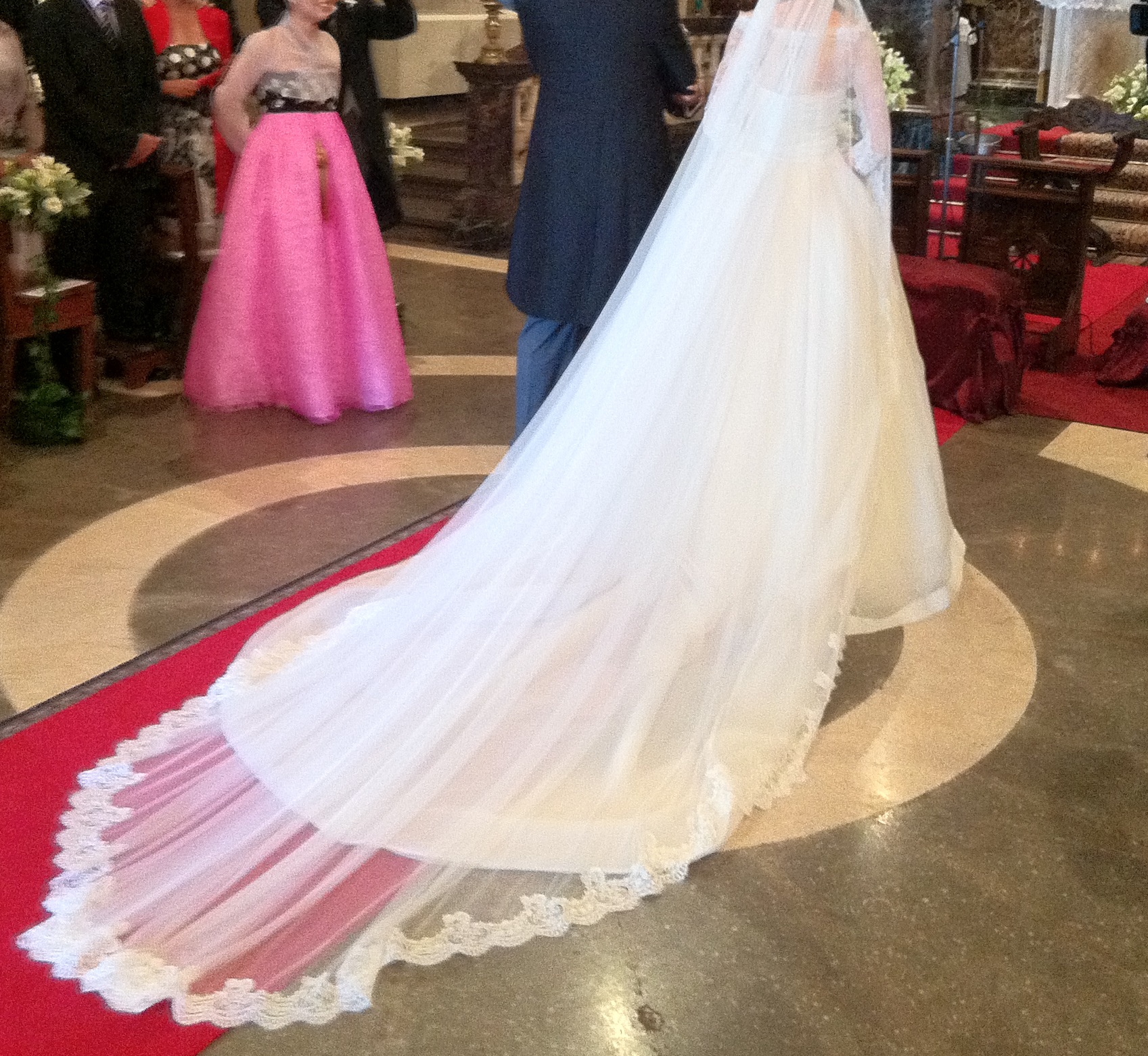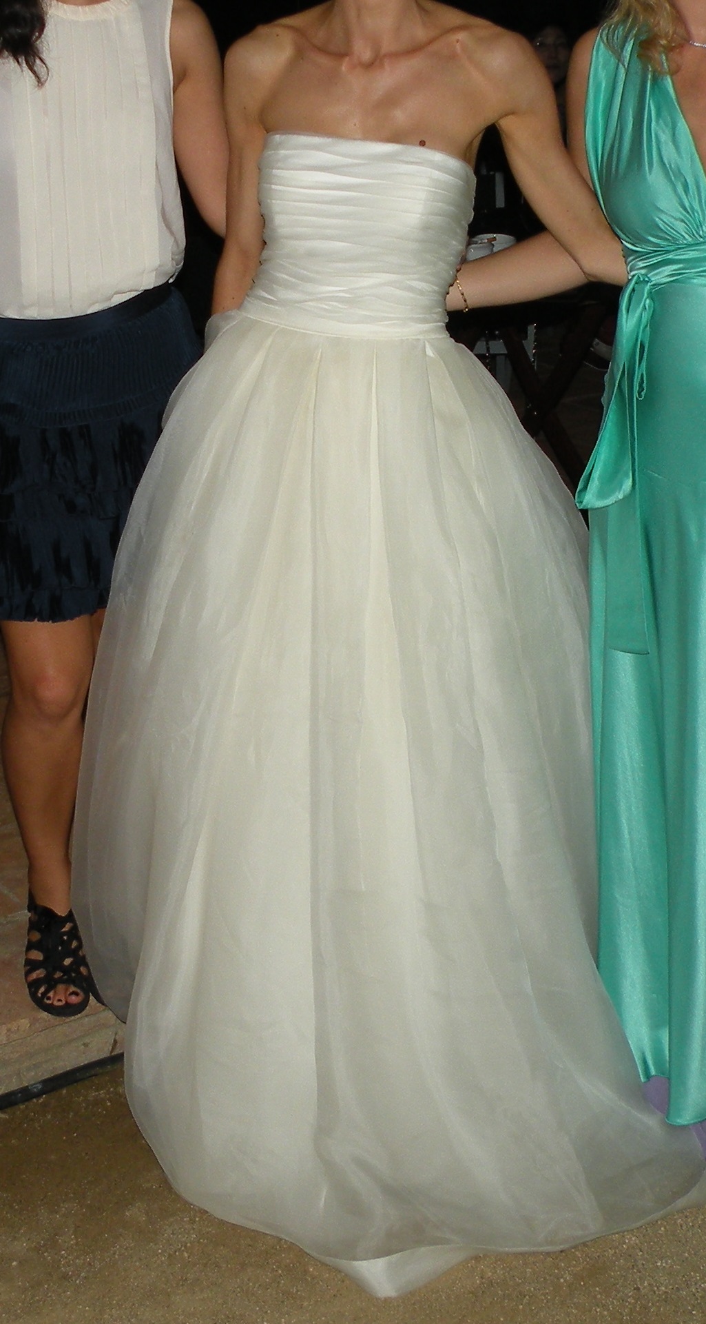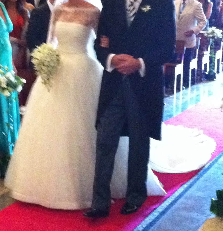 Modelo base: Enero de Rosa Clará, colección 2011, con cola desmontable de 3.5 metros. Precioso vestido con cuerpo palabra de honor y falda con gran vuelo. Muy ligero, en organza de seda. Falda con acabado en tira de raso. Muy favorecedor, permite todo tipo de complementos/estilismos por su sencillez y elegancia sobria. Este vestido viene con una cola desmontable de 3.5m hecha a medida para la novia (pieza única elaborada en el taller de Rosá Clará), que luce como continuación de la falda. Permite por tanto dos versiones: con larga cola para ceremononia y posterior desmontaje para largo estándar para cena o baile. Espalda personalizada con botones de raso (modelo base sólo lleva cremallera, ésta queda oculta en esta preparación, sólo se ven los botones). Sólo se ha llevado durante 3 horas, en muy buen estado. Negociable si se desea comprar sólo el vestido sin la cola. NEGOCIABLE.