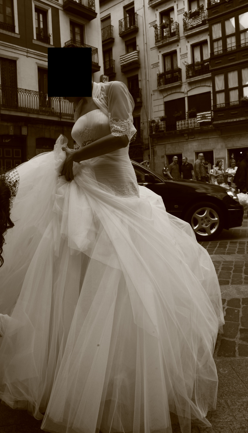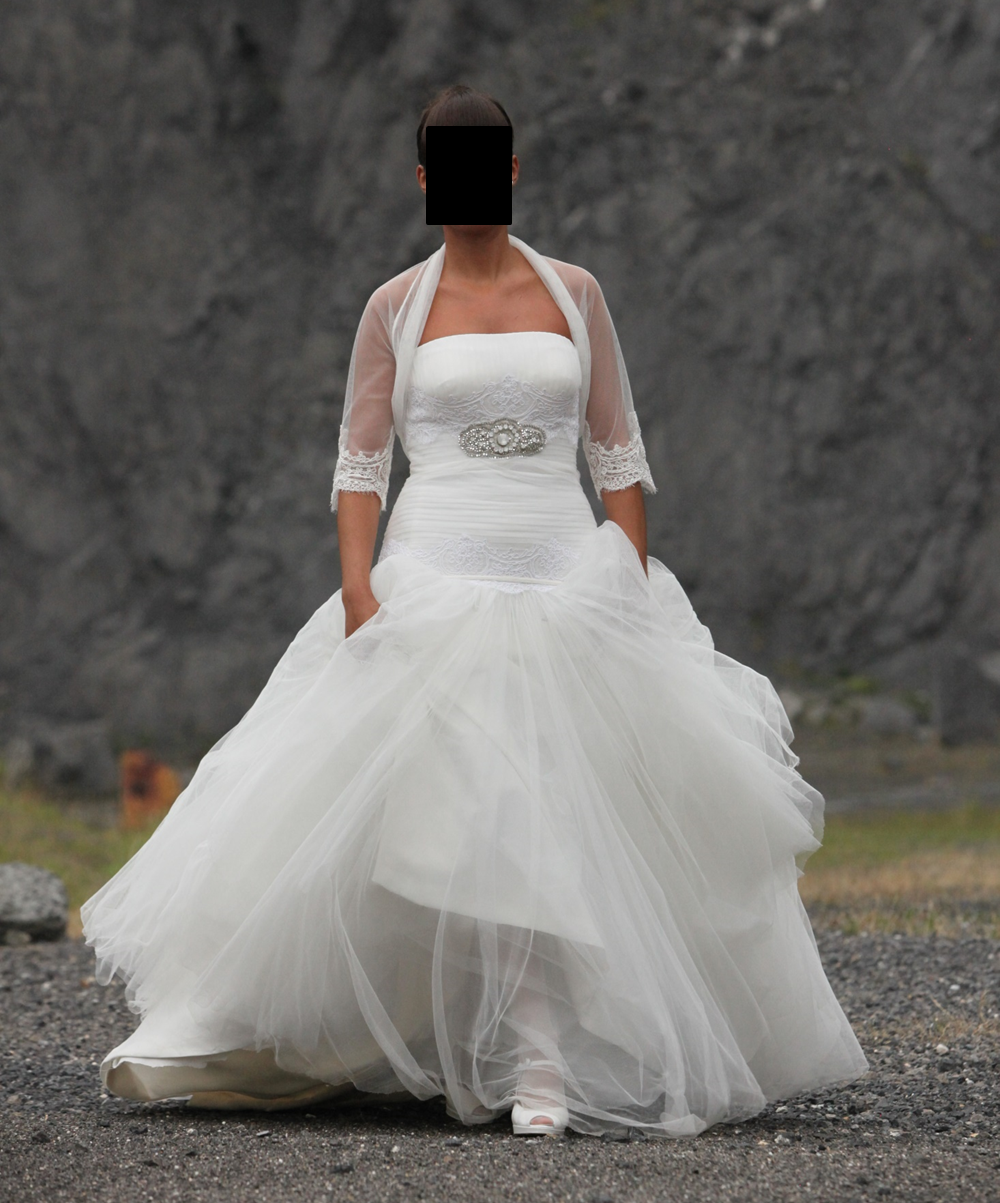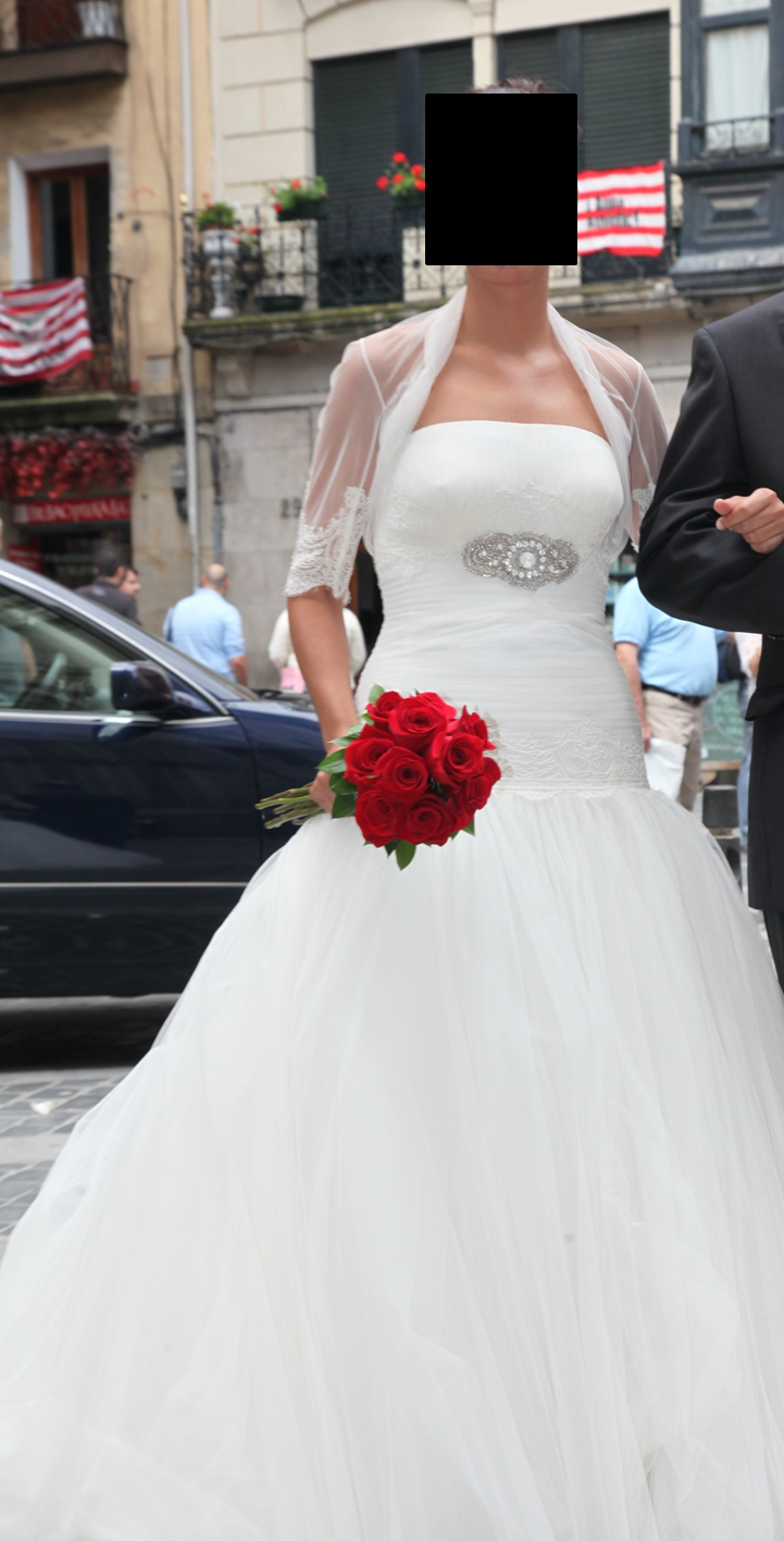 Vestido de novia en color blanco natural de estilo romántico y muy femenino, parte superior finamente plisada y ajustada al cuerpo para moldear y realzar la silueta, escote palabra de honor con adornos de encaje bordado en relieve en el talle y marcando el corte a la cadera, sensacional falda de inmenso y majestuoso volumen tipo bailarina, confeccionada con múltiples capas de suave y vaporoso tul de seda acabada en preciosa cola, se complementa con una elegante chaquetilla de tul sedoso que lleva manga francesa con borde de encajes bordados en motivos florales.