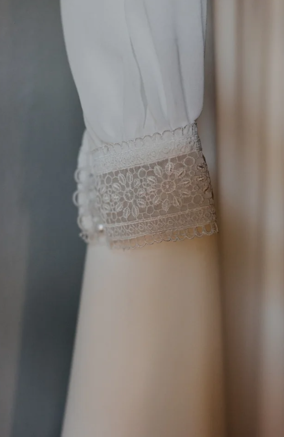 La falda suave y de corte limpio fluye desde la cinturilla de encaje. Los íntimos detalles de encaje se extienden a codos y puños para cohesionar las líneas elegantes del vestido.