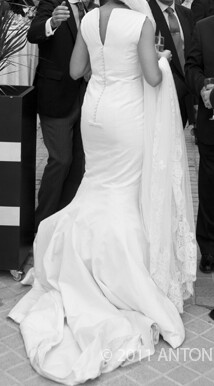 El vestido es la talla38 pero me lo ajustaron a mi cuerpo.Está recién secado de la tintorería y no tiene ni una mancha.Yo pedí q me añadirán un lazito como el del escote, al final de la abotobadura( aparece en la foto).