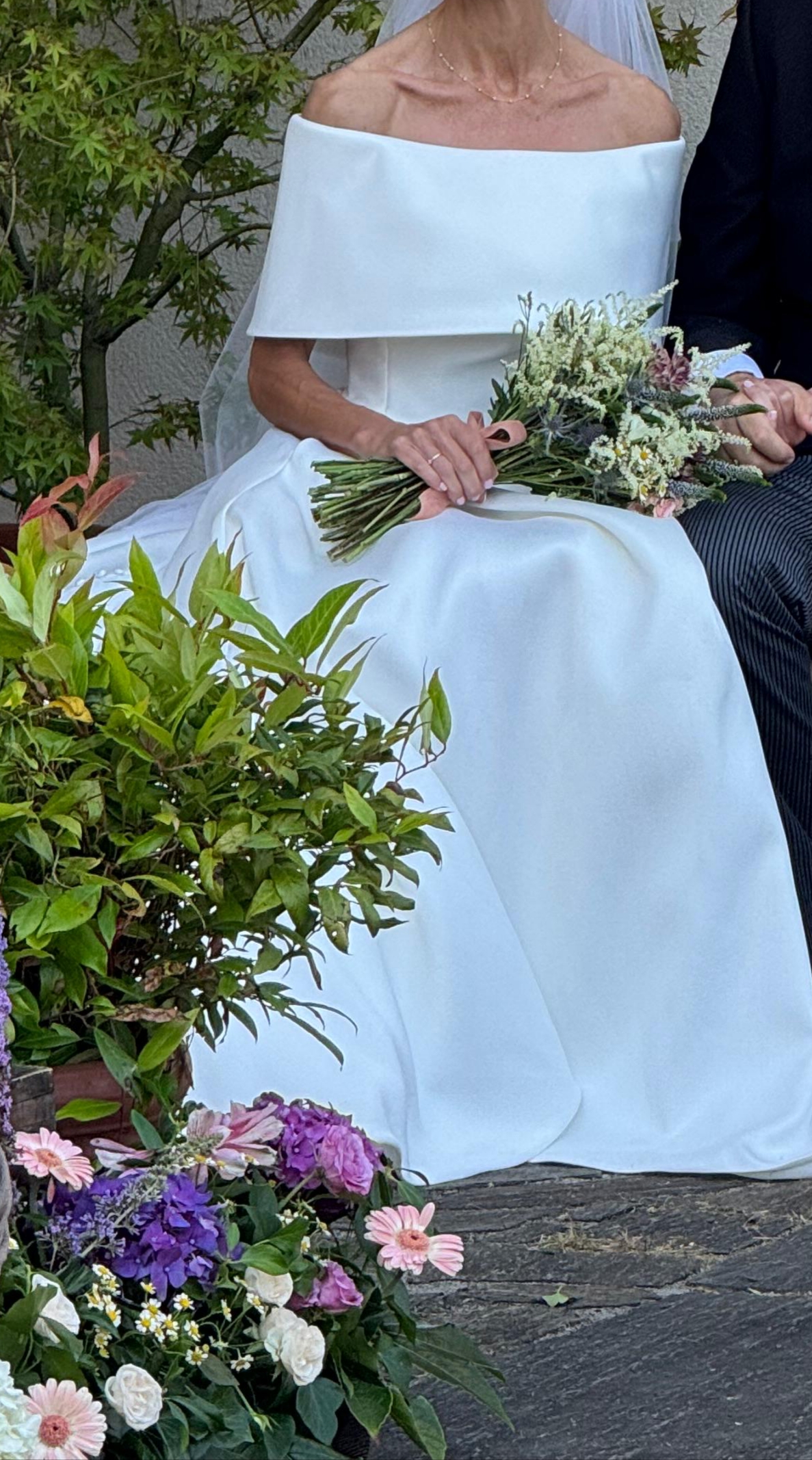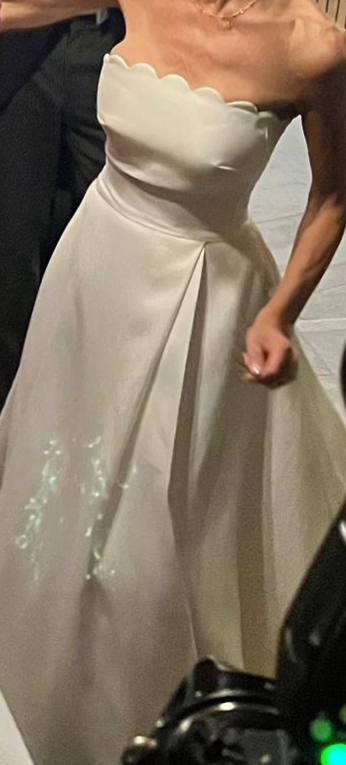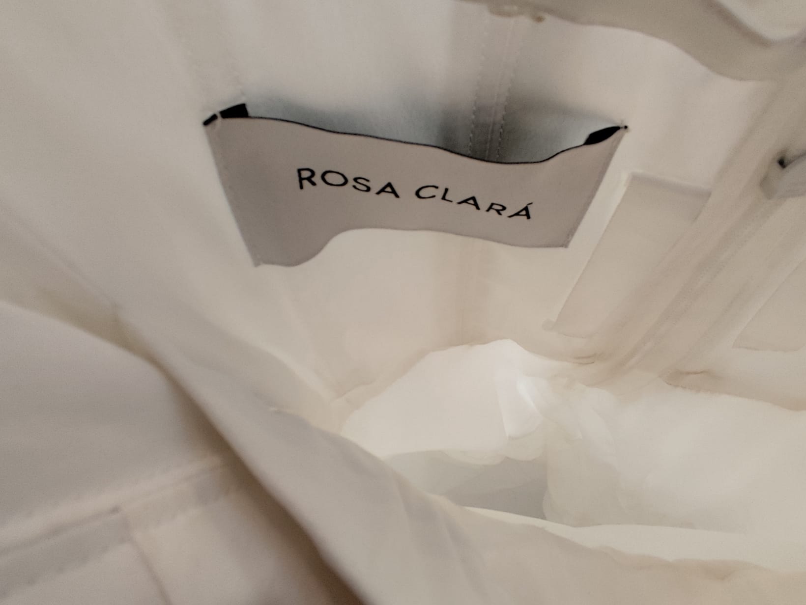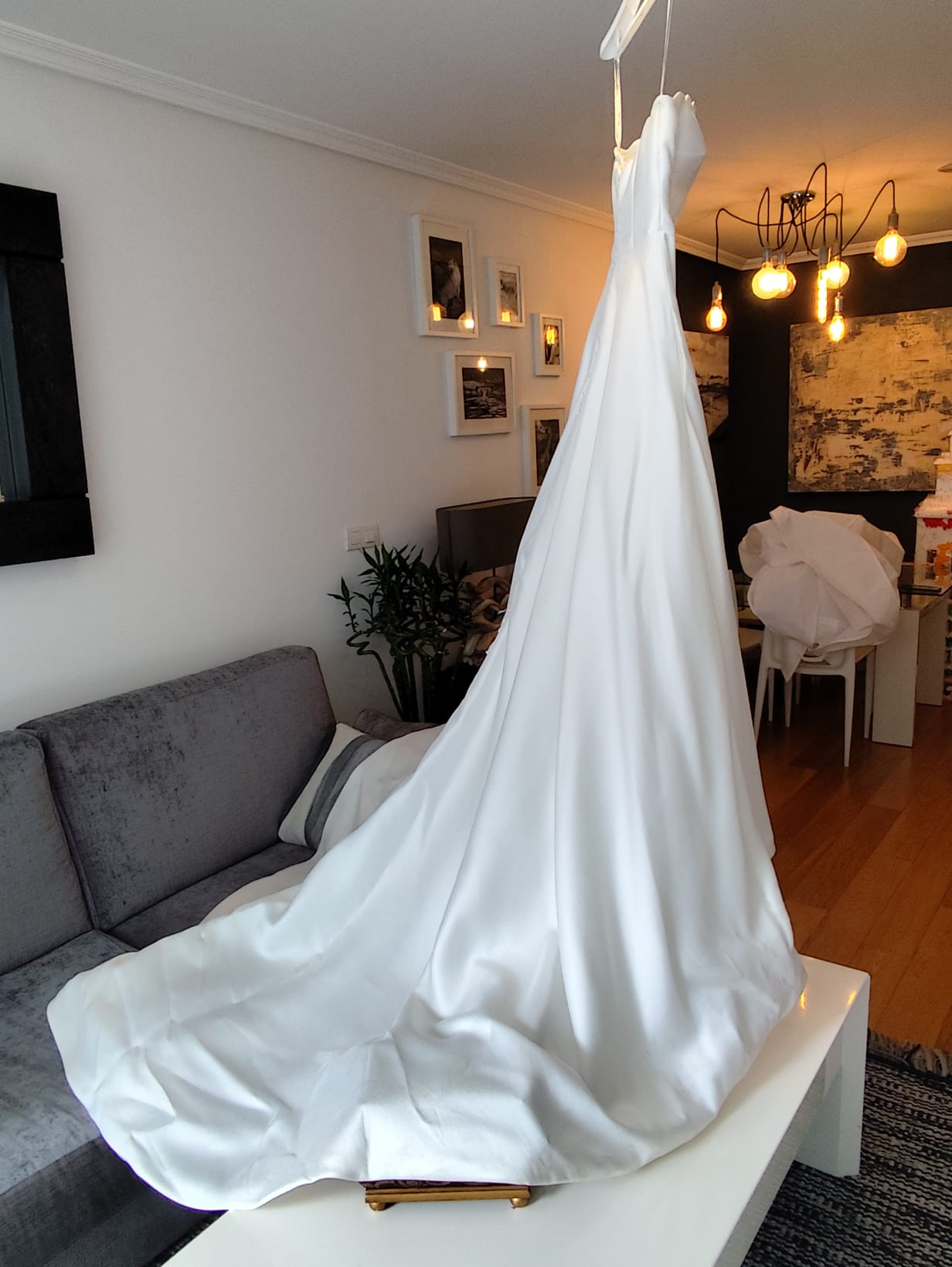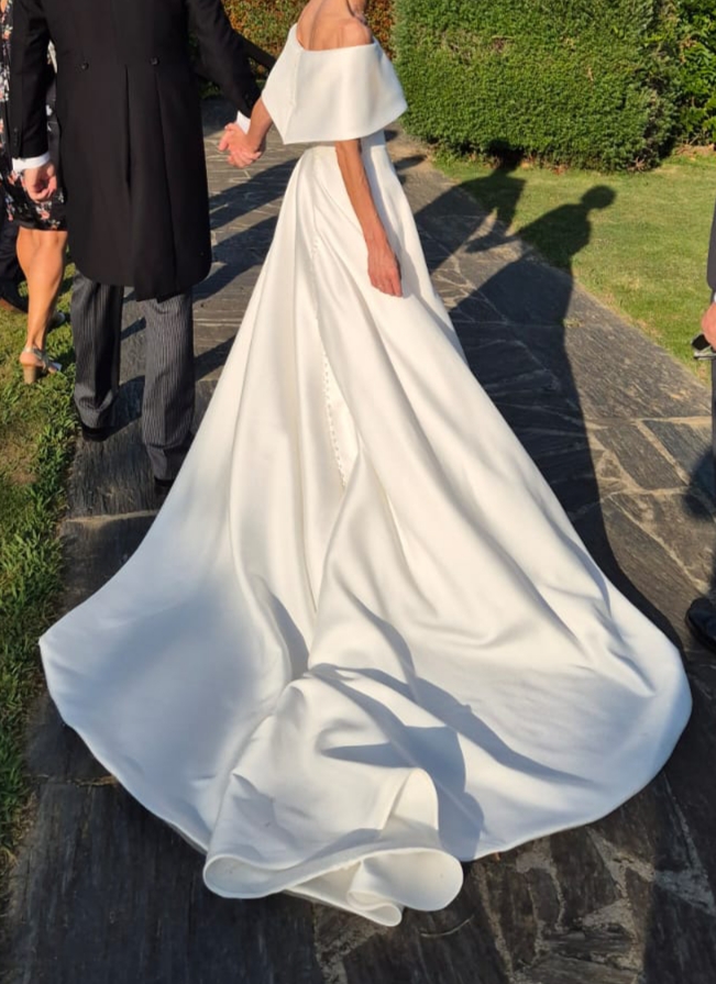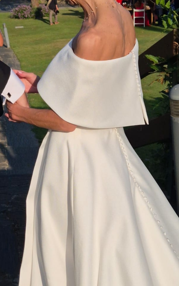 Lleva botones de arriba a abajo,que le proporcionan un toque romántico. La cola es realmente impresionante, mide 1’70 m.Te quitas la chaquetilla y el escote del vestido hace ondas en un palabra de honor.