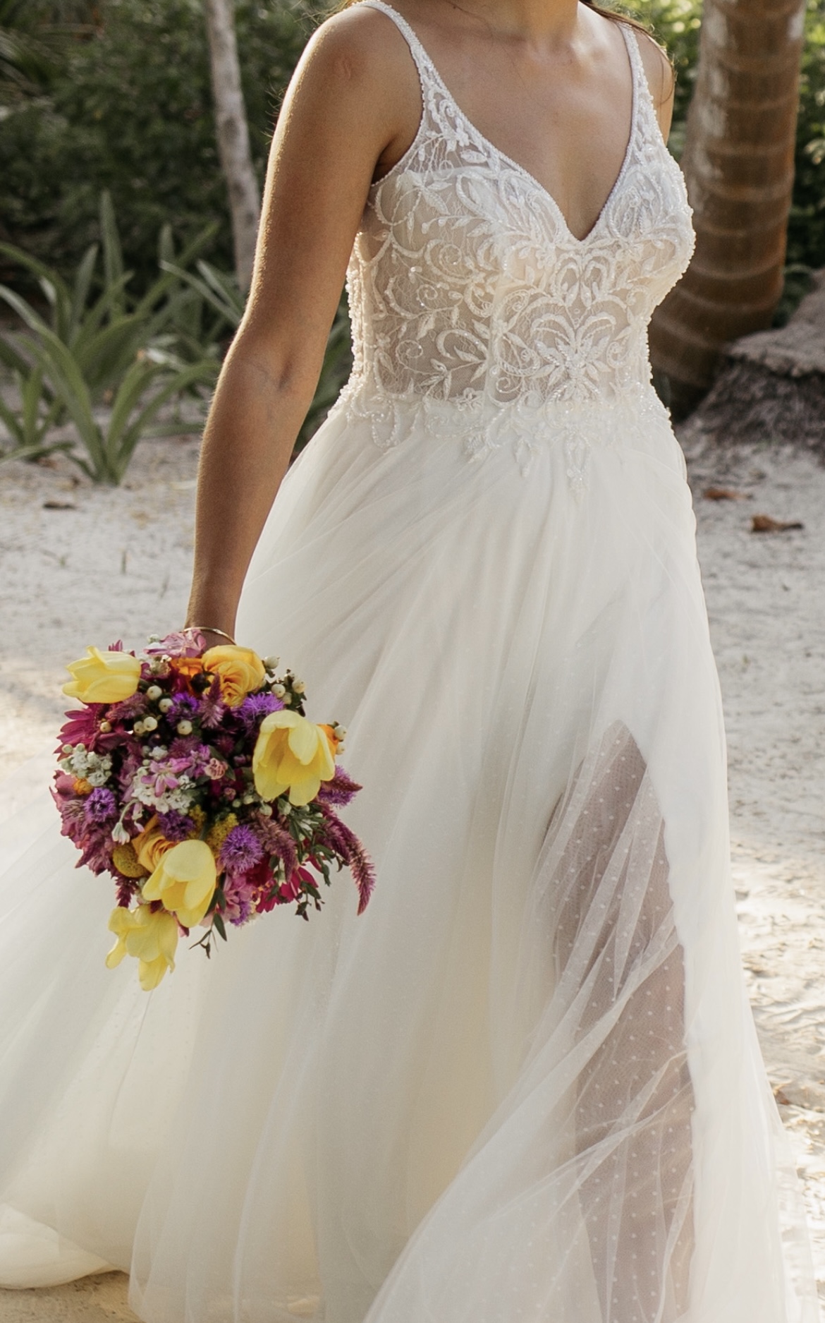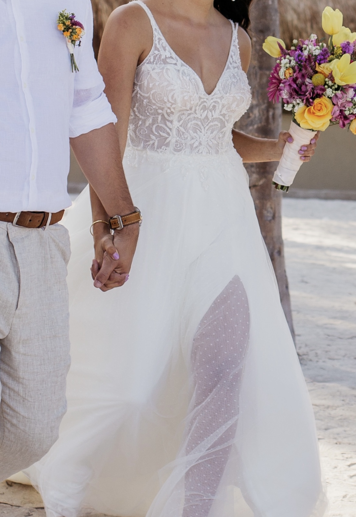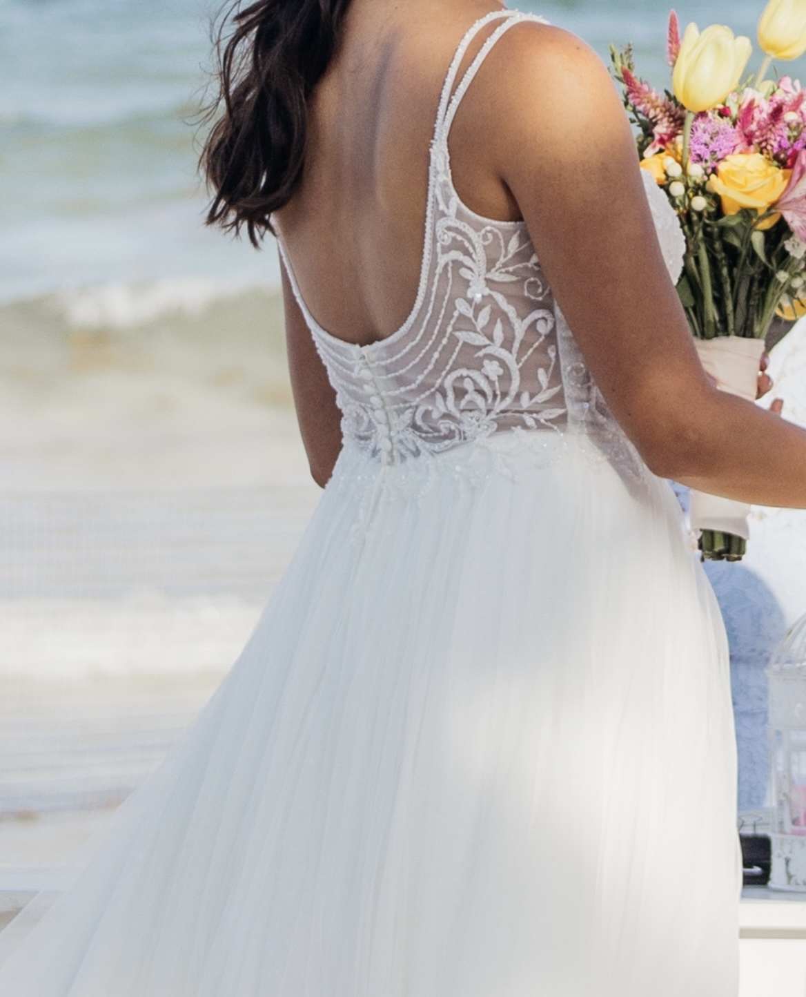 Es un vestido muy fresco y cómodo, ideal para bodas en verano, playa o campo.