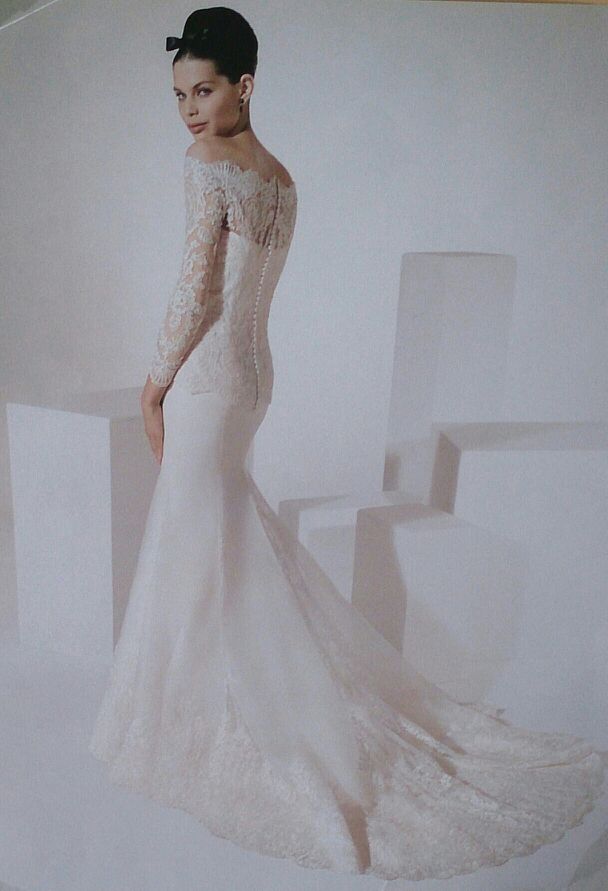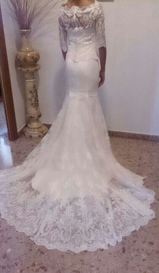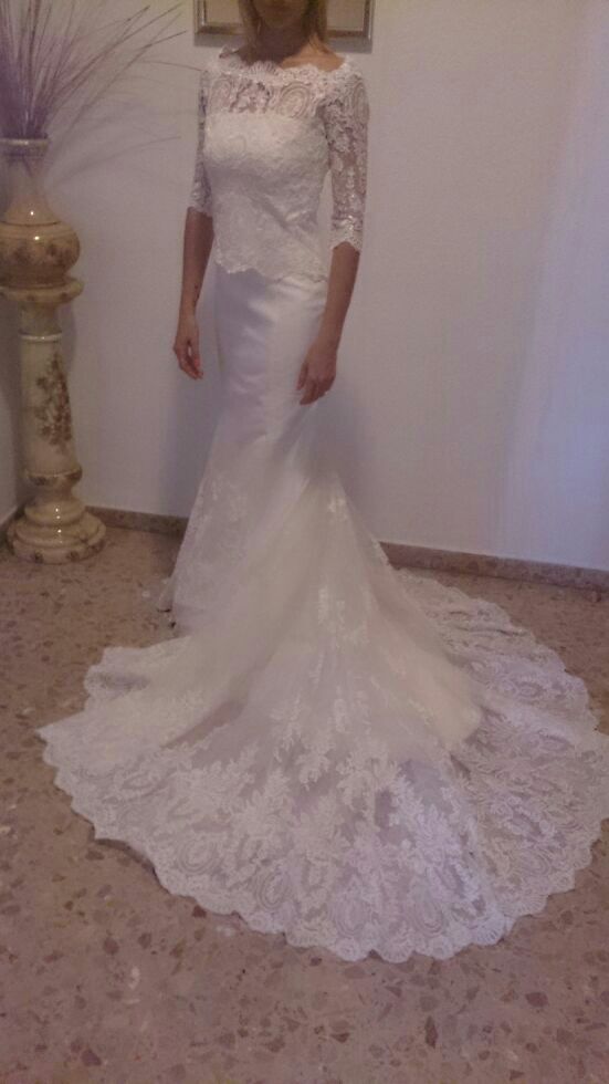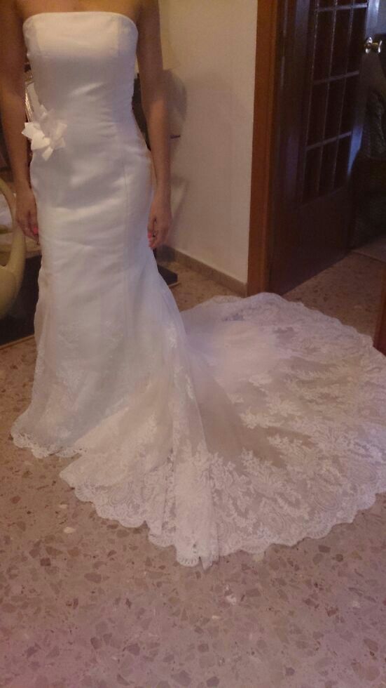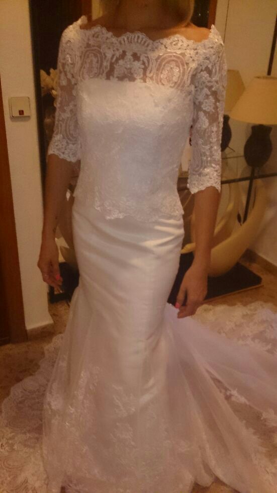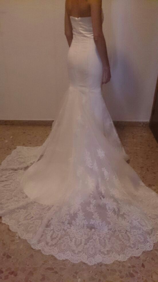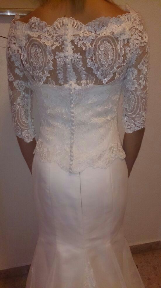 el vestido es de palabra de honor y de complemento lleva una torera de encaje también como complemento añado una flor que se coloca en el vestido cuando se quita la torera y un lazo pequeño para enganchar la cola del traje para despues de la ceremonia