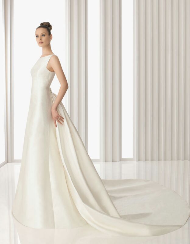 ¿Se pueden mezclar en un vestido de novia el estilo clásico y tradicional con detalles innovadores y modernos? La respuesta es rotundamente si. Rosa Clará lo ha conseguido magistralmente en el modelo Aragón. Este vestido de novia de carácter sobrio y clásico está confeccionado en Mikado de seda de color blanco marfil, su diseño en corte princesa liso, sin adornos frontales es altamente favorecedor ya que alarga y estiliza visualmente la silueta. El escote redondo del entallado cuerpo desemboca en una moderna cascada de vértigo en la parte de atrás que alcanza hasta la cintura, dejando toda la espalda al descubierto, adornada solo con dos elegantes lazos, que otorga un porte regio y espectacular a la novia.