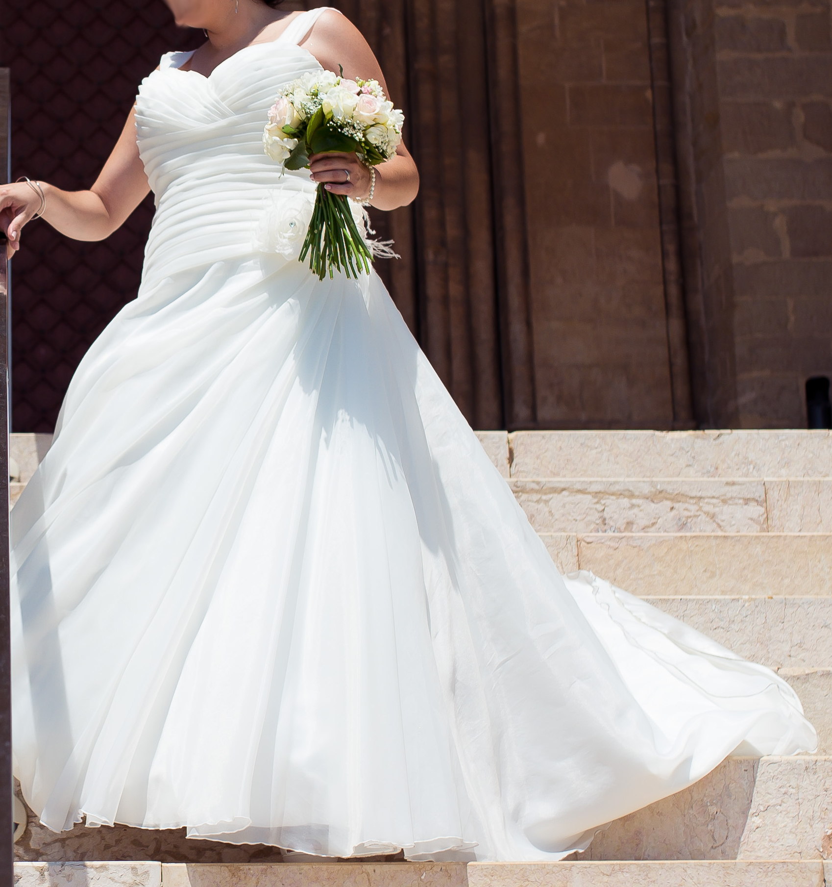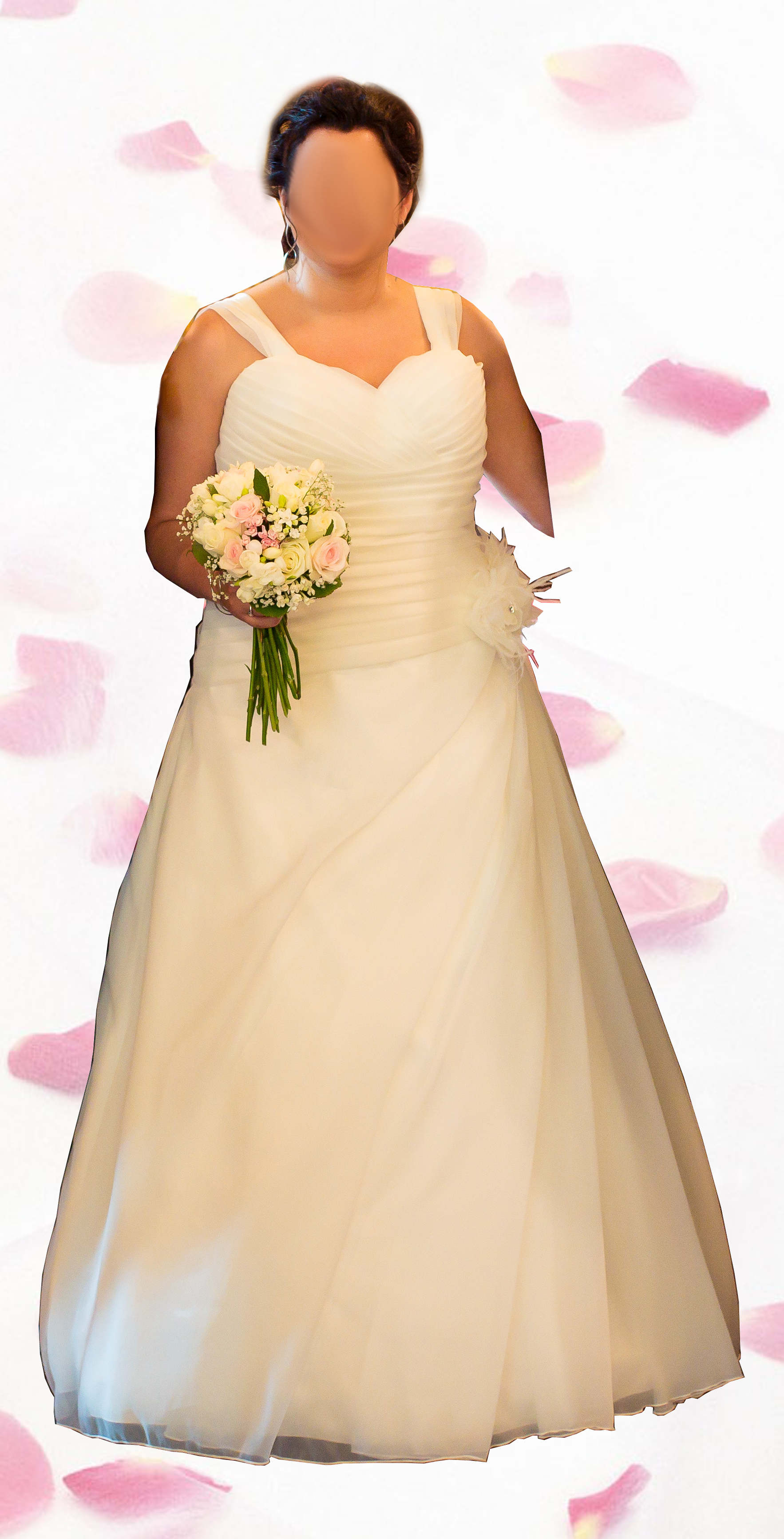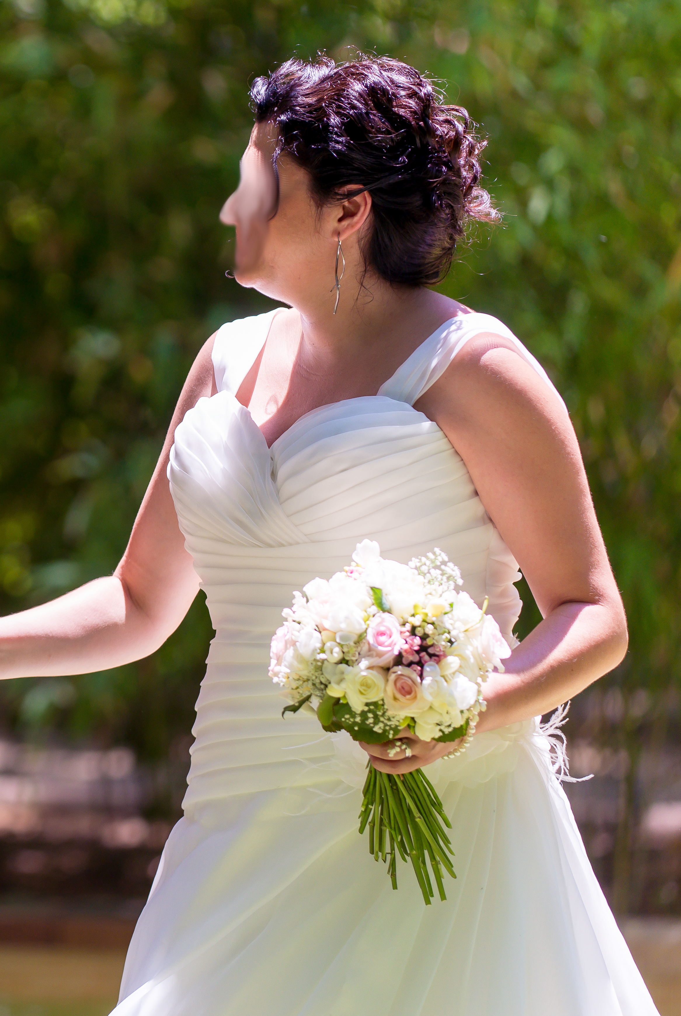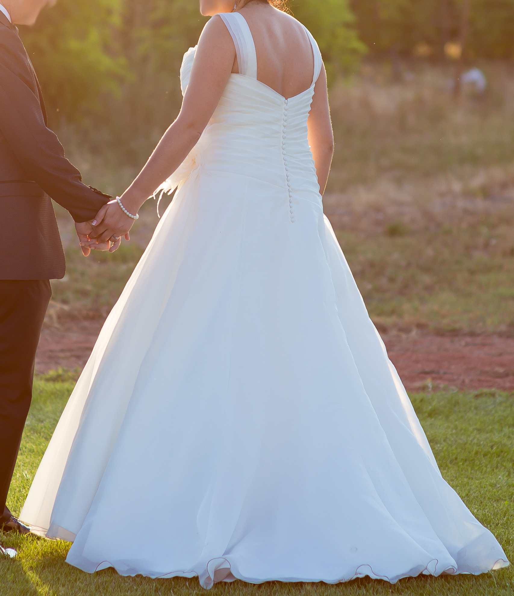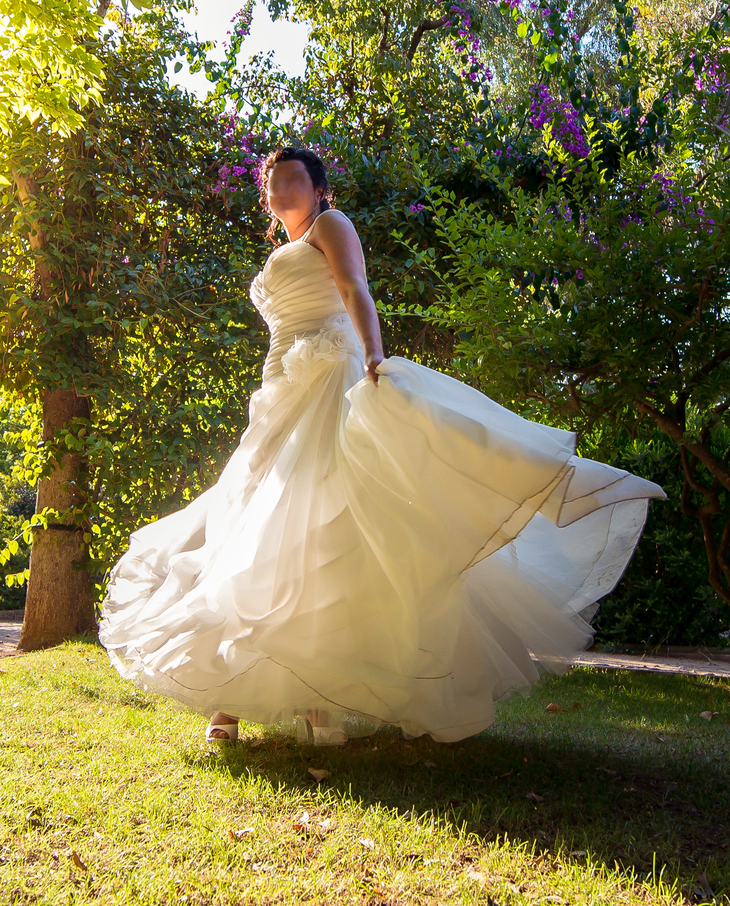 Originalmente con escote palabra de honor dónde se añadieron tirantes que se pueden quitar.