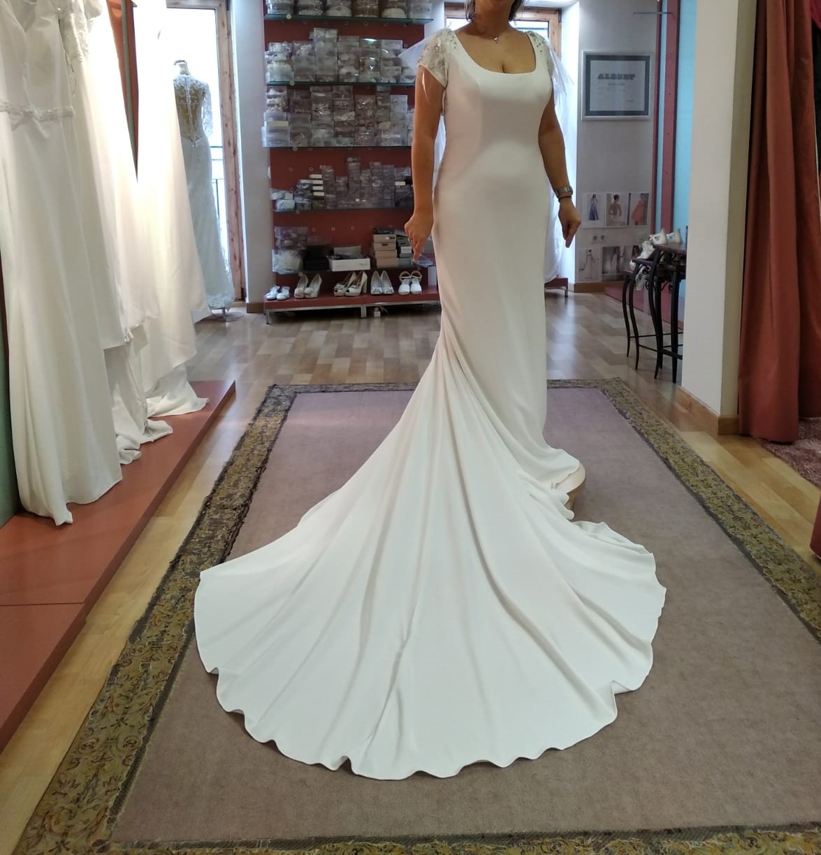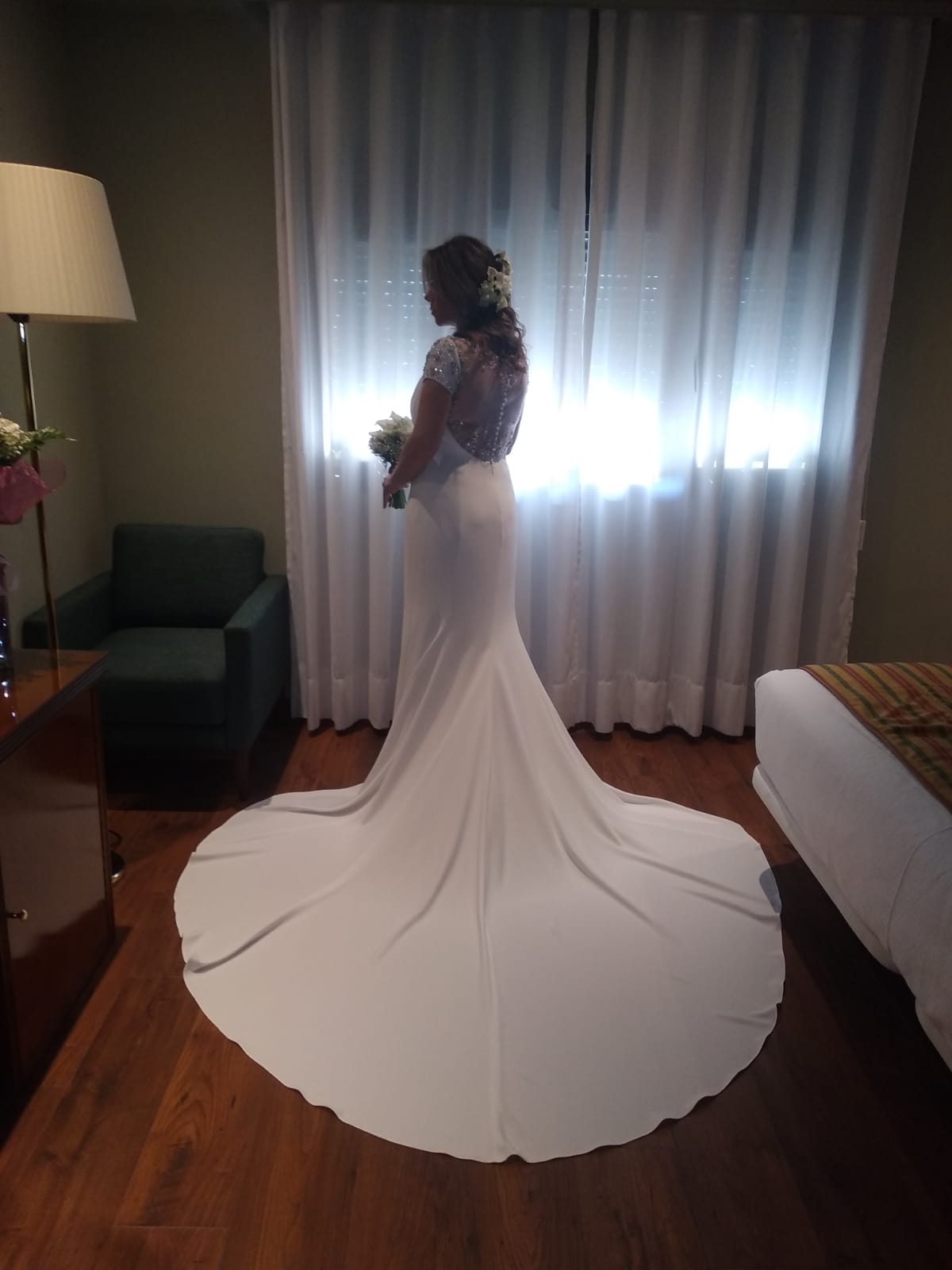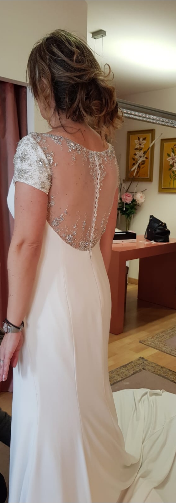 Me casé en el mes de Mayo, y el vestido se encuentra en la tintorería (intacto) lo vendo por no tener sitio donde guardarlo, para quien quiera algo sencillo y elegante este sería su vestido, está practicamente hecho a medida (la talla es una 40 y altura 1.68) lleva cola, y la espalda de cristal de swarovski. Pongo 3 fotos pero si necesitais ver algo mas os pasaría mas. Es una ocasión perfecta