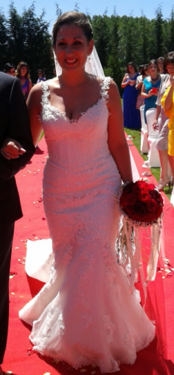 El vestido está impecable, sin ningún rasguño . Los arreglos que tiene son el bajo del vestido (yo mido 1,64 pero llevaba tacones muy altos) y el escote que lo bajaron una talla (40). No está retocado ni de cintura ni de cadera.