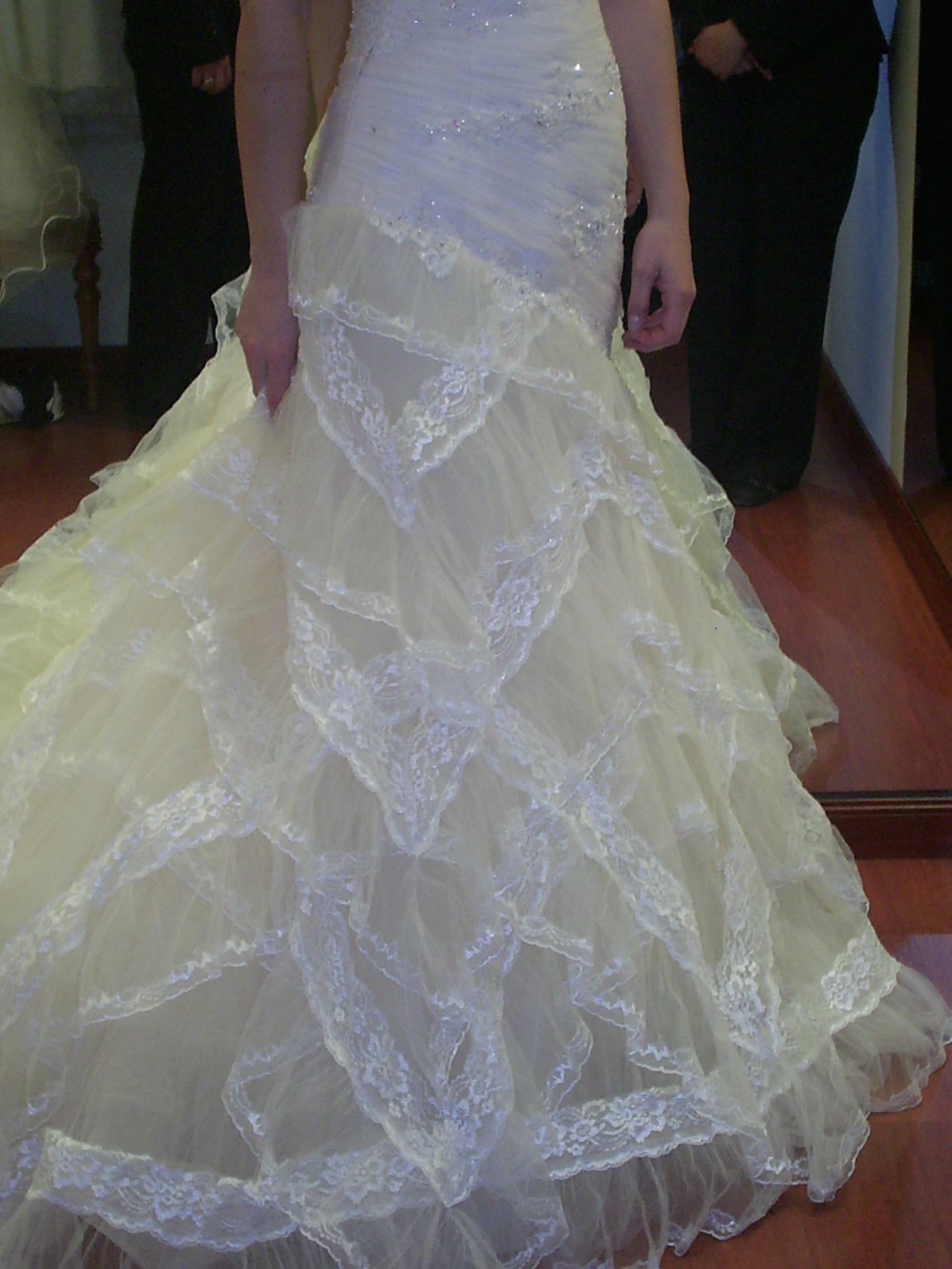 Precioso vestido de palabra de honor con pedrería en el cuerpo y entallado hasta la cadera con gran en la falda y cola gracias a sus volantes en forma de pico.