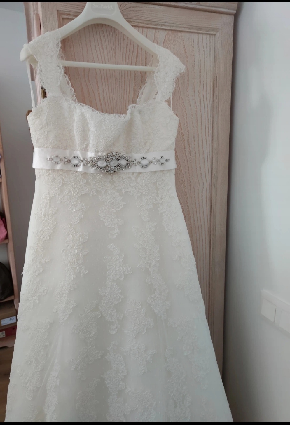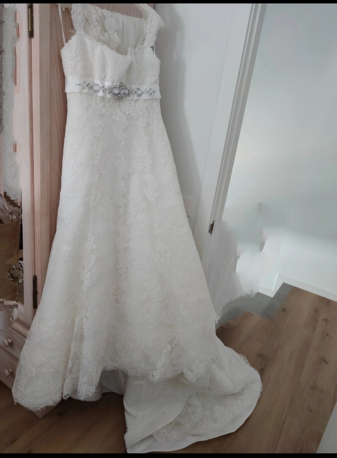 Precioso vestido de novia, Caspio, de encaje, con escote cuadrado y precioso broche de Swarovski en el talle.