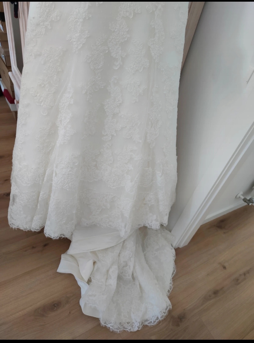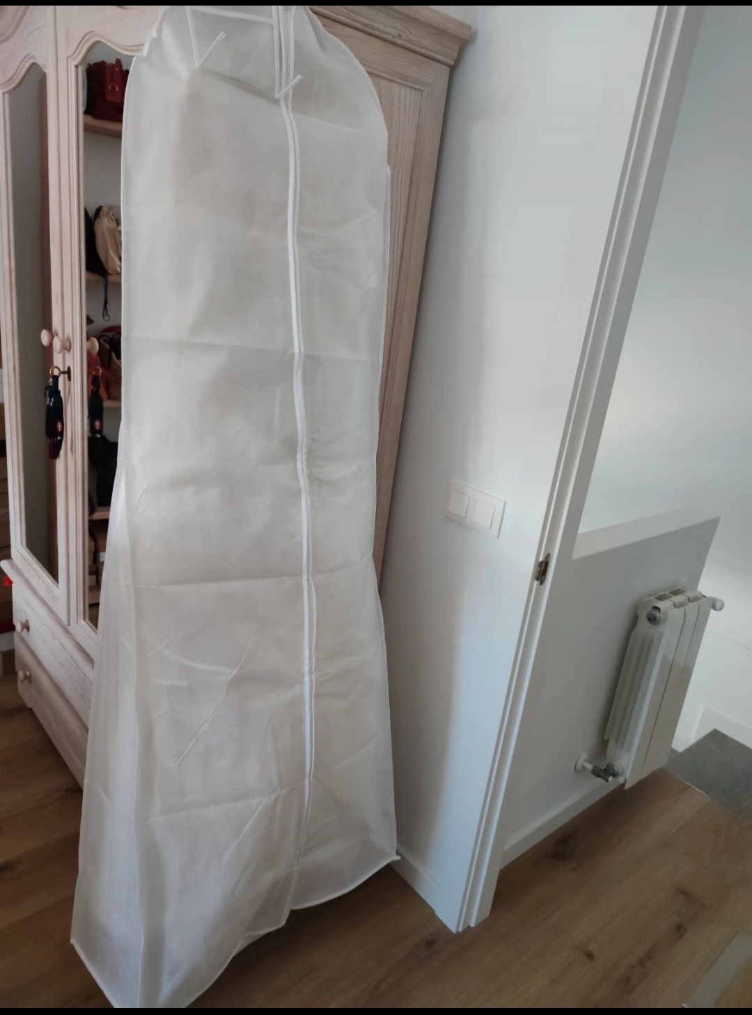 Está lavado en tintorería y guardado en su bolsa de tela.