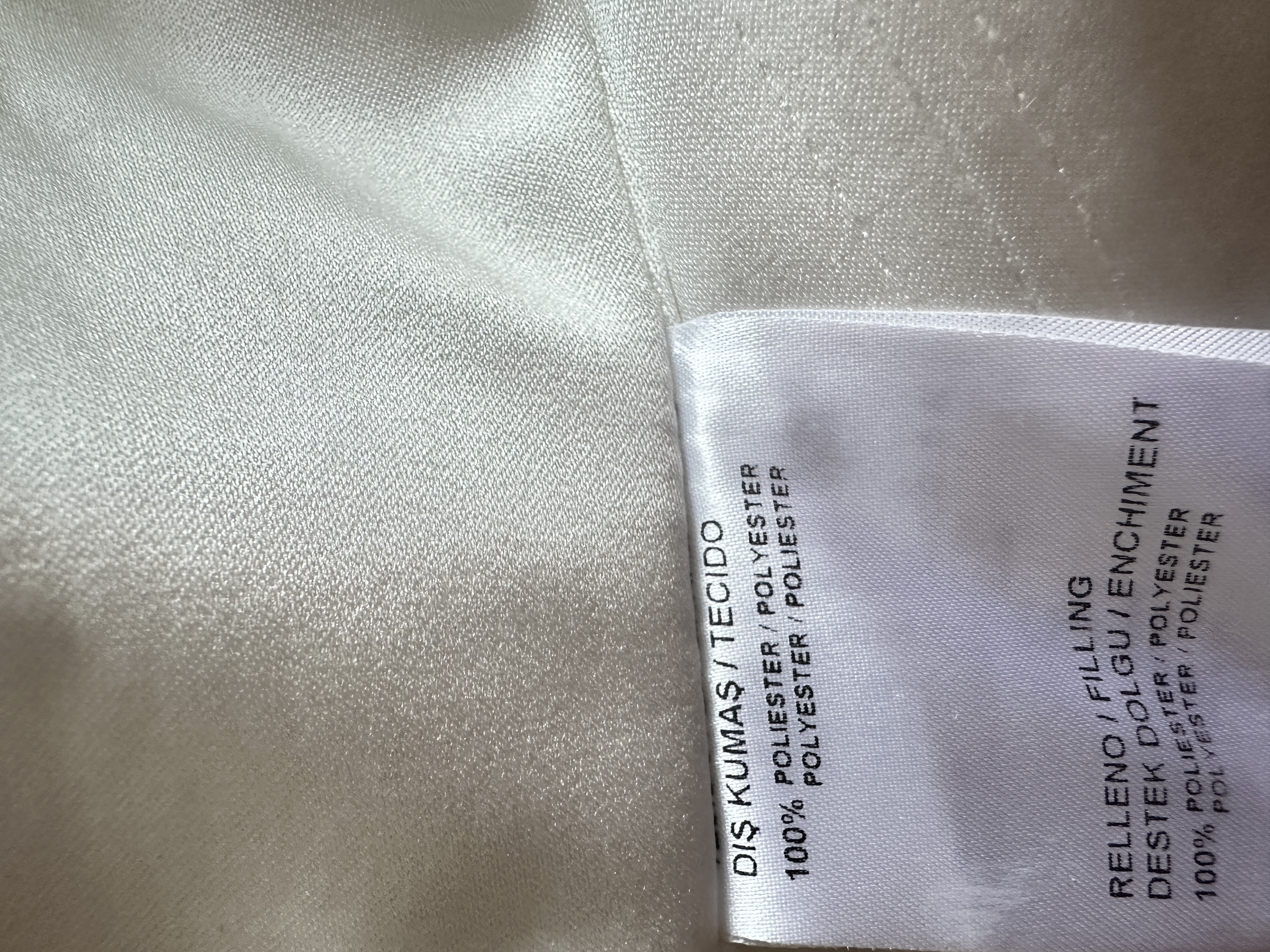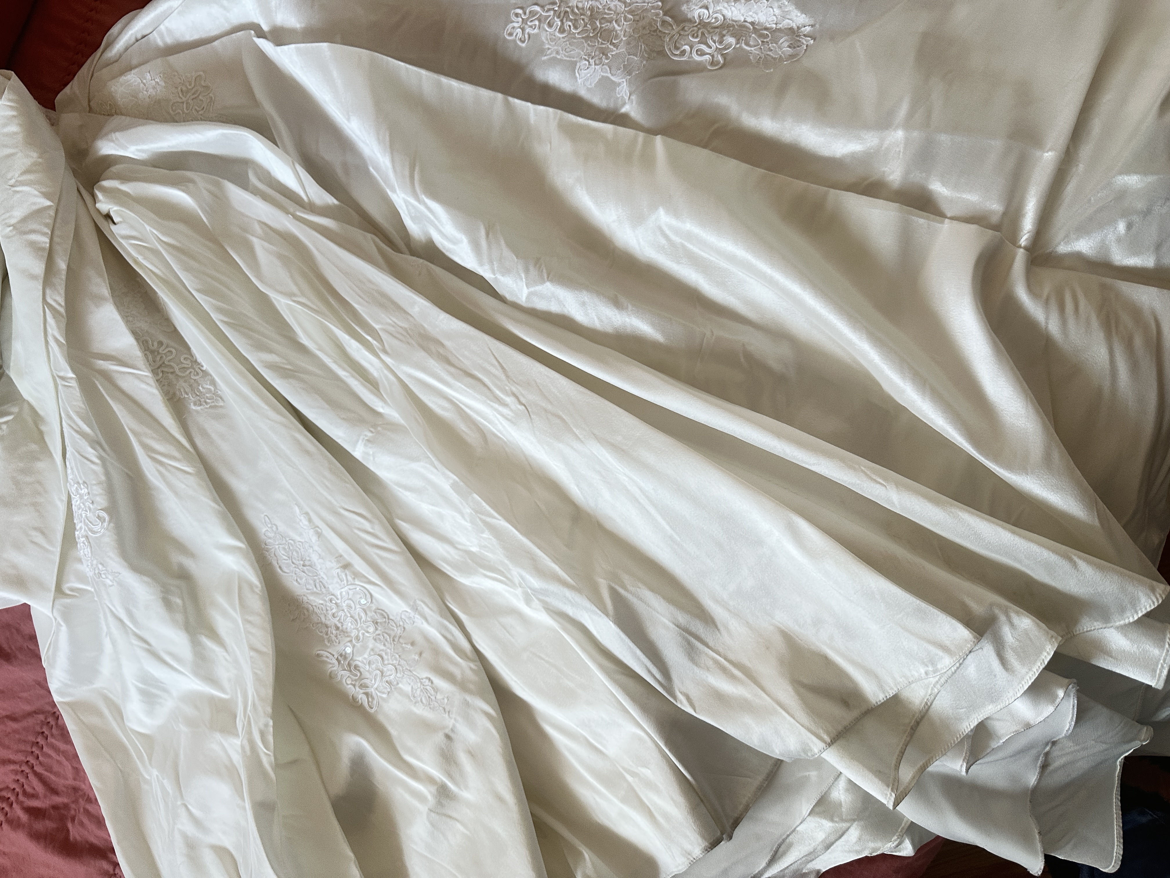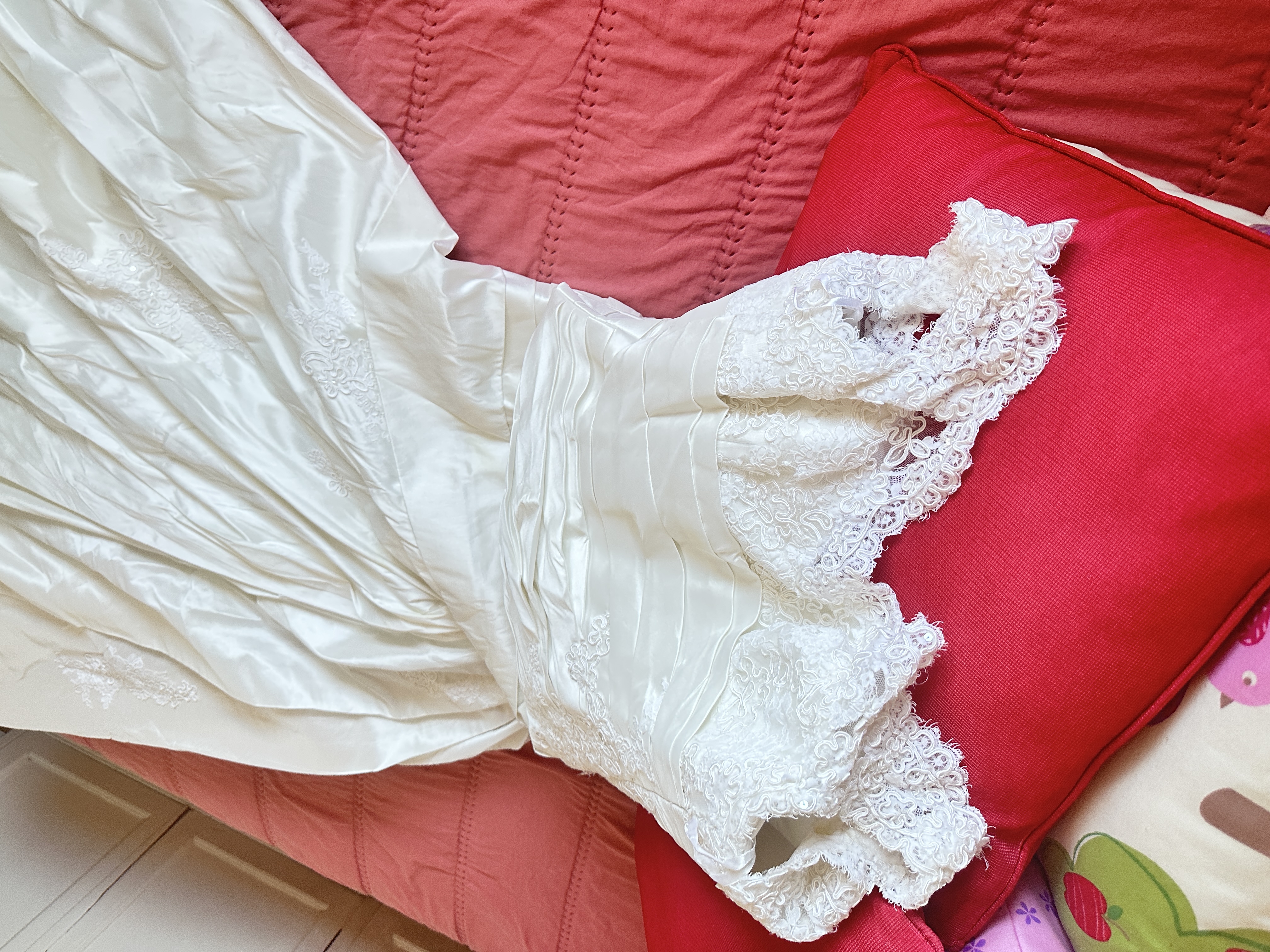 Detalles: leva un precioso (para mi) encaje floral y bordados que recorren el cuerpo, creando un efecto muy sutil y romántico. La caída de la tela es pesada y lujosa, no tiene nada que ver con vestidos “low cost”.